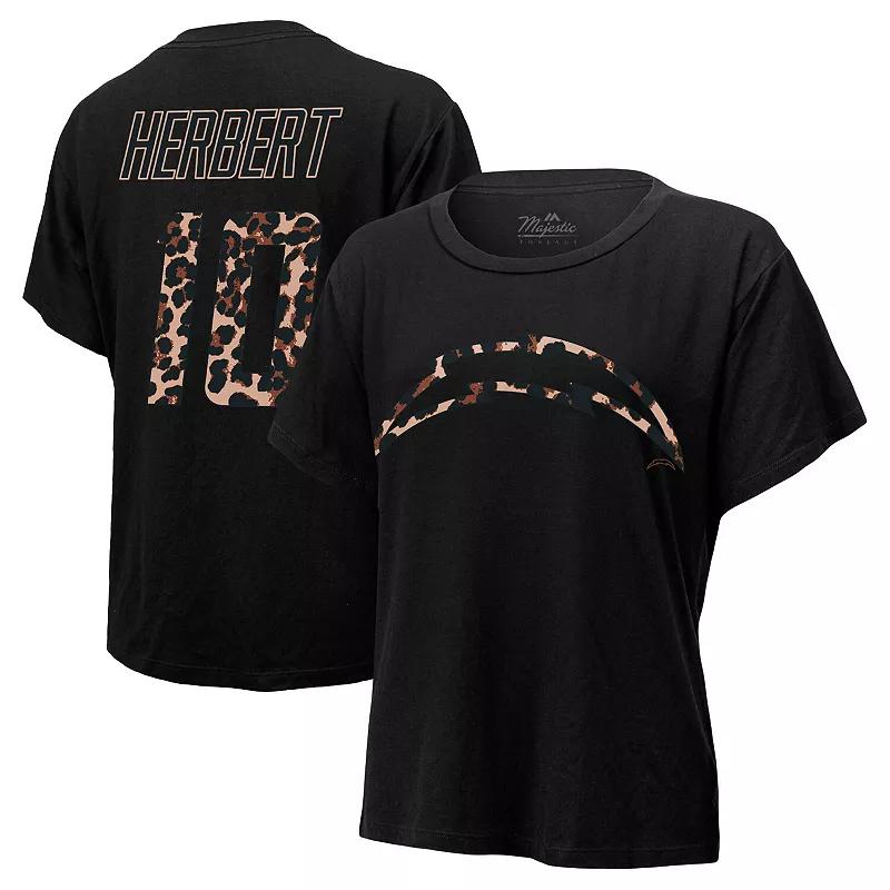 Women's Majestic Threads Justin Herbert Black Los Angeles Chargers Leopard Player Name & Number T-Shirt,