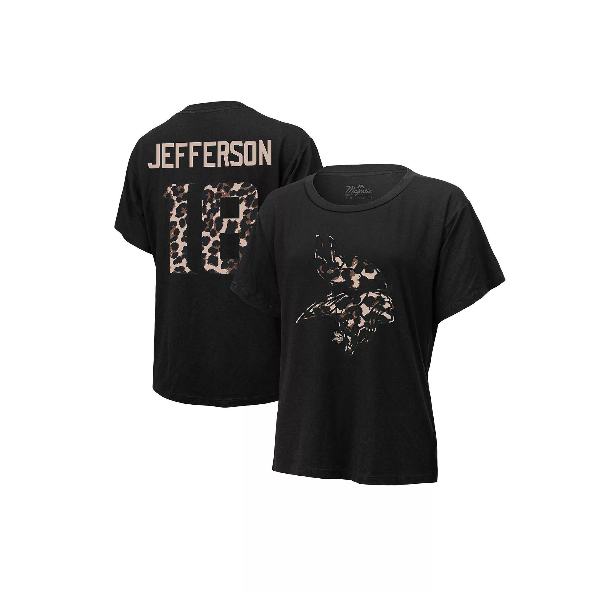 This Justin Jefferson Player Name and Number T-shirt from Majestic Threads puts a unique spin on your Minnesota Vikings gear. The slightly dropped shoulders and crew neck design supply comfort with each wear. Best of all, the Justin Jefferson graphics feature eye-catching leopard details so that your fandom stands out from the rest.This Justin Jefferson Player Name and Number T-shirt from Majestic Threads puts a unique spin on your Minnesota Vikings gear. The slightly dropped shoulders and crew neck design supply comfort with each wear. Best of all, the Justin Jefferson graphics feature eye-catching leopard details so that your fandom stands out from the rest.PRODUCT FEATURESOfficially licensedMachine wash, tumble dry lowCrew neckBrand: Majestic ThreadsShort sleeveScreen print graphicsMaterial: 95% Rayon/5% Spandex Color: Black. Gender: female. Age Group: adult.