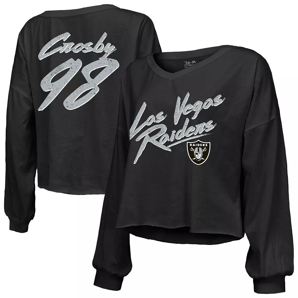Add trendy Las Vegas Raiders apparel to your wardrobe with this Maxx Crosby Off-Shoulder Script Player Name & Number Cropped Long Sleeve V-Neck T-Shirt. Dropped shoulder seams create a relaxed fit, while the cropped, unfinished hem and distressed details provide a vintage look. Made from 100% cotton, this Las Vegas Raiders tee feels comfortable to wear all day.Add trendy Las Vegas Raiders apparel to your wardrobe with this Maxx Crosby Off-Shoulder Script Player Name & Number Cropped Long Sleeve V-Neck T-Shirt. Dropped shoulder seams create a relaxed fit, while the cropped, unfinished hem and distressed details provide a vintage look. Made from 100% cotton, this Las Vegas Raiders tee feels comfortable to wear all day.PRODUCT FEATURESMaterial: 100% CottonV-neckCropped, unfinished hemOfficially licensedMachine wash, tumble dry lowBrand: Majestic ThreadsTeam and player graphics printed in distressed design on the front and backDropped shoulder seams provide a relaxed fitLong sleeve Color: Lvr Black. Gender: female. Age Group: adult.