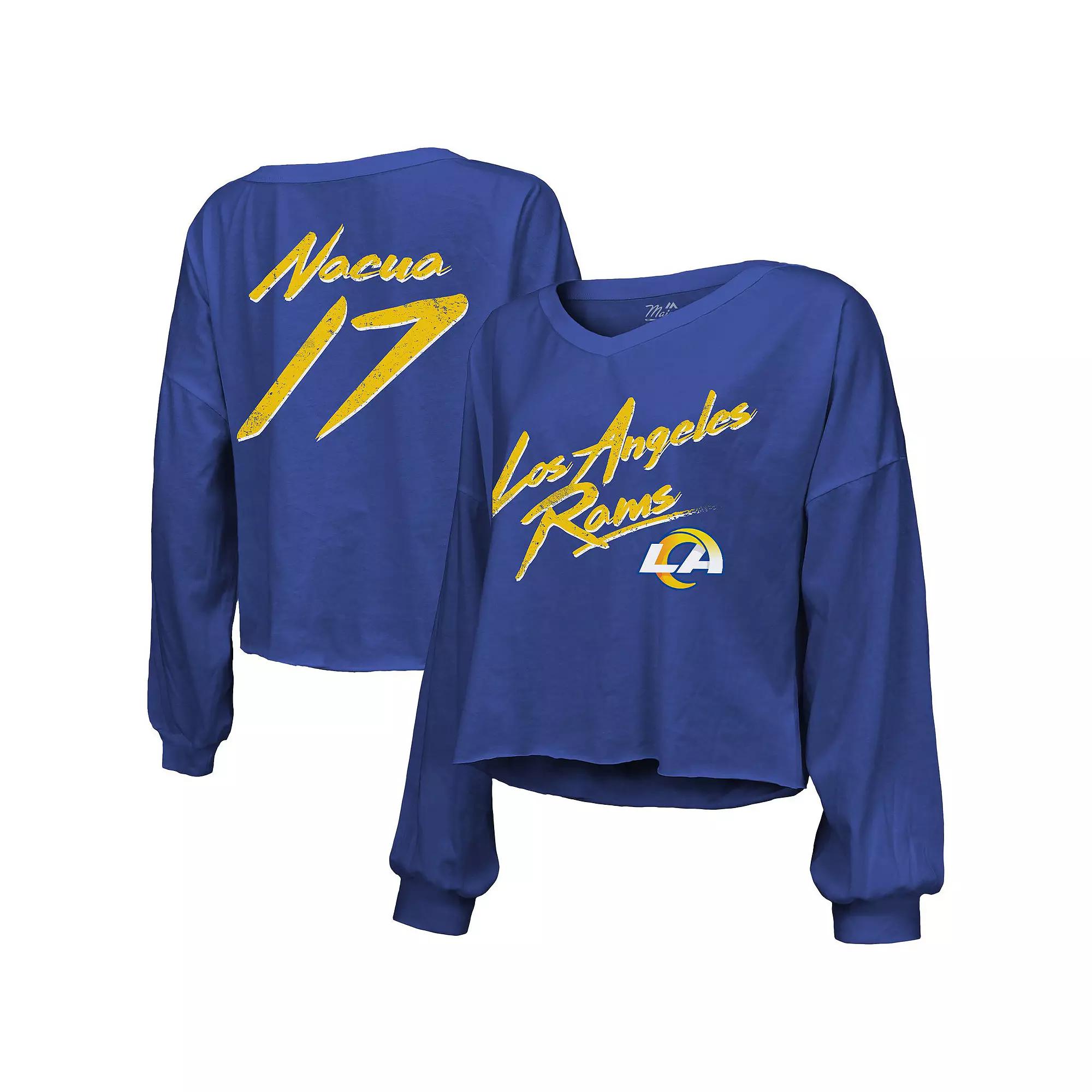 Add trendy Los Angeles Rams apparel to your wardrobe with this Puka Nacua Off-Shoulder Script Player Name & Number Cropped Long Sleeve V-Neck T-Shirt. Dropped shoulder seams create a relaxed fit, while the cropped, unfinished hem and distressed details provide a vintage look. Made from 100% cotton, this Los Angeles Rams tee feels comfortable to wear all day.Add trendy Los Angeles Rams apparel to your wardrobe with this Puka Nacua Off-Shoulder Script Player Name & Number Cropped Long Sleeve V-Neck T-Shirt. Dropped shoulder seams create a relaxed fit, while the cropped, unfinished hem and distressed details provide a vintage look. Made from 100% cotton, this Los Angeles Rams tee feels comfortable to wear all day.PRODUCT FEATURESMaterial: 100% CottonMachine wash, tumble dry lowBrand: Majestic ThreadsLong sleeveOfficially licensedDropped shoulder seams provide a relaxed fitCropped, unfinished hemTeam and player graphics printed in distressed design on the front and backV-neck Size: 2X. Color: Blue. Gender: female. Age Group: adult.