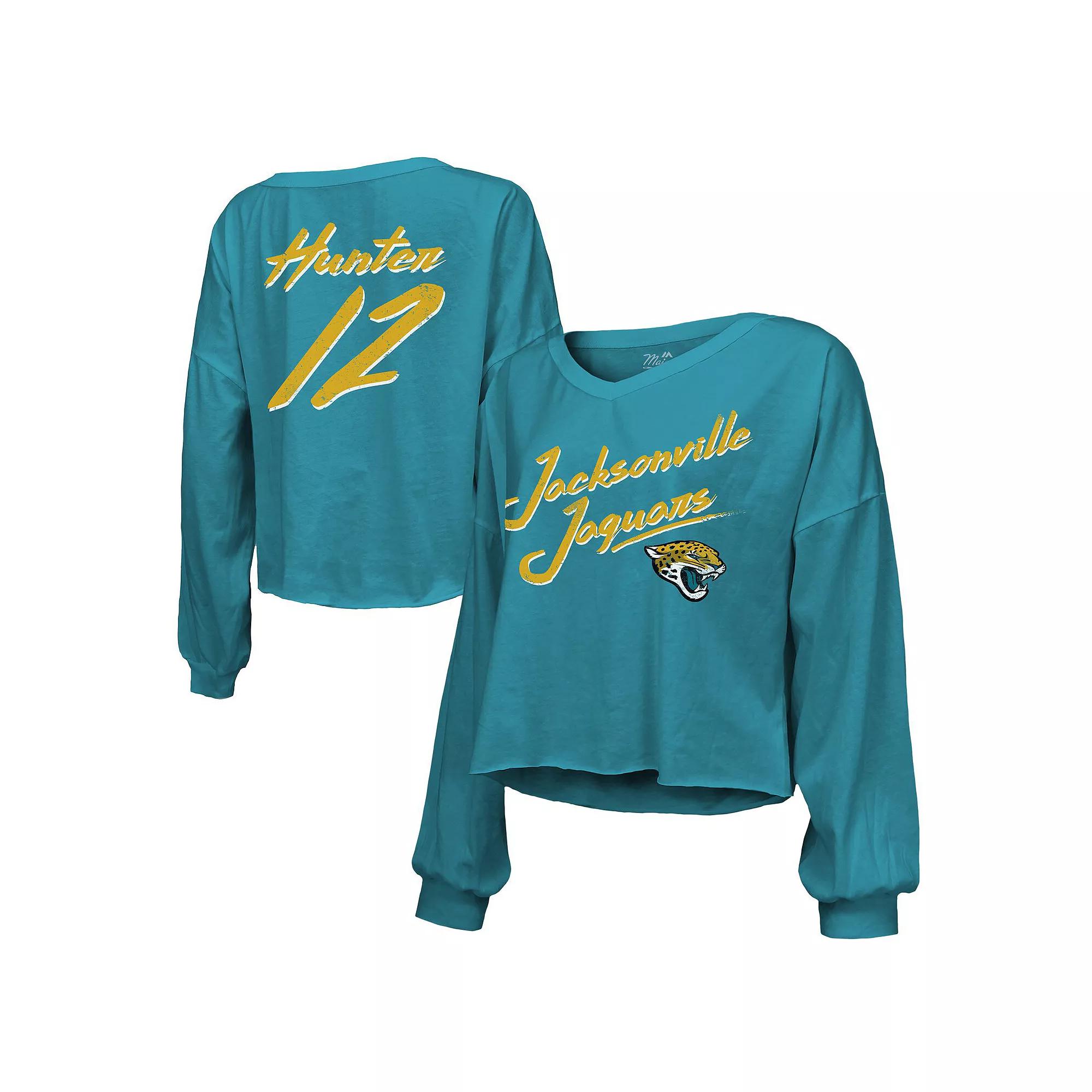 Show your favorite Jacksonville Jaguars player some love in chic fashion with this Travis Hunter Script Cropped Long Sleeve Relaxed V-Neck T-Shirt from Majestic Threads. Its printed graphics in a distressed design feature Jacksonville Jaguars script on the front and his name and number displayed across the back. A cropped hem completes the stylish look of this Travis Hunter top. Long sleeve. Dropped shoulder seams provide a relaxed fit for ease of movement. Brand: Majestic Threads. Distressed screen print graphics. Machine wash, tumble dry low. Material: 100% Cotton. Officially licensed. V-neck. Sizing Tip: Fans say this t-shirt runs large. If you are in between sizes, consider sizing down. Relaxed Fit: Loose and roomy across the chest, shoulders and body. For a classic fit, consider sizing down. Cropped, unfinished hem. Size: 2X. Color: Blue. Gender: female. Age Group: adult.