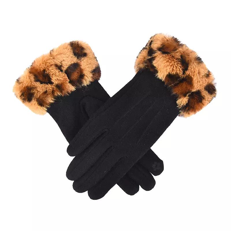 Stay warm and stylish this winter with cozy gloves that are just as soft as they look, featuring eye-catching faux fur leopard cuffs that add a playful twist. Plus, with the touch screen functionality, you can scroll through your phone while keeping your fingers snug—perfect for capturing all those winter memories without the frostbite! How do you accessorize? Check out our ACCESSORIES GUIDE for essential tips to elevate your style with must-have accessories. - https://www.kohls.com/feature/accessories-guide.jsp. FEATURES: Warm and cozy for winter, Soft faux fur leopard cuff, Touch screen functionality. FIT & SIZE: Gloves silhouette, Hand circumference: 8 in, Palm to fingertip length: 10 in. MATERIAL & CARE: Shell: Wool, polyester, Lining: Polyester, Product contains faux fur, Hand wash. DETAILS: Imported. Size: One Size. Color: Black. Gender: female. Age Group: adult. Material: WOOL BLEND.