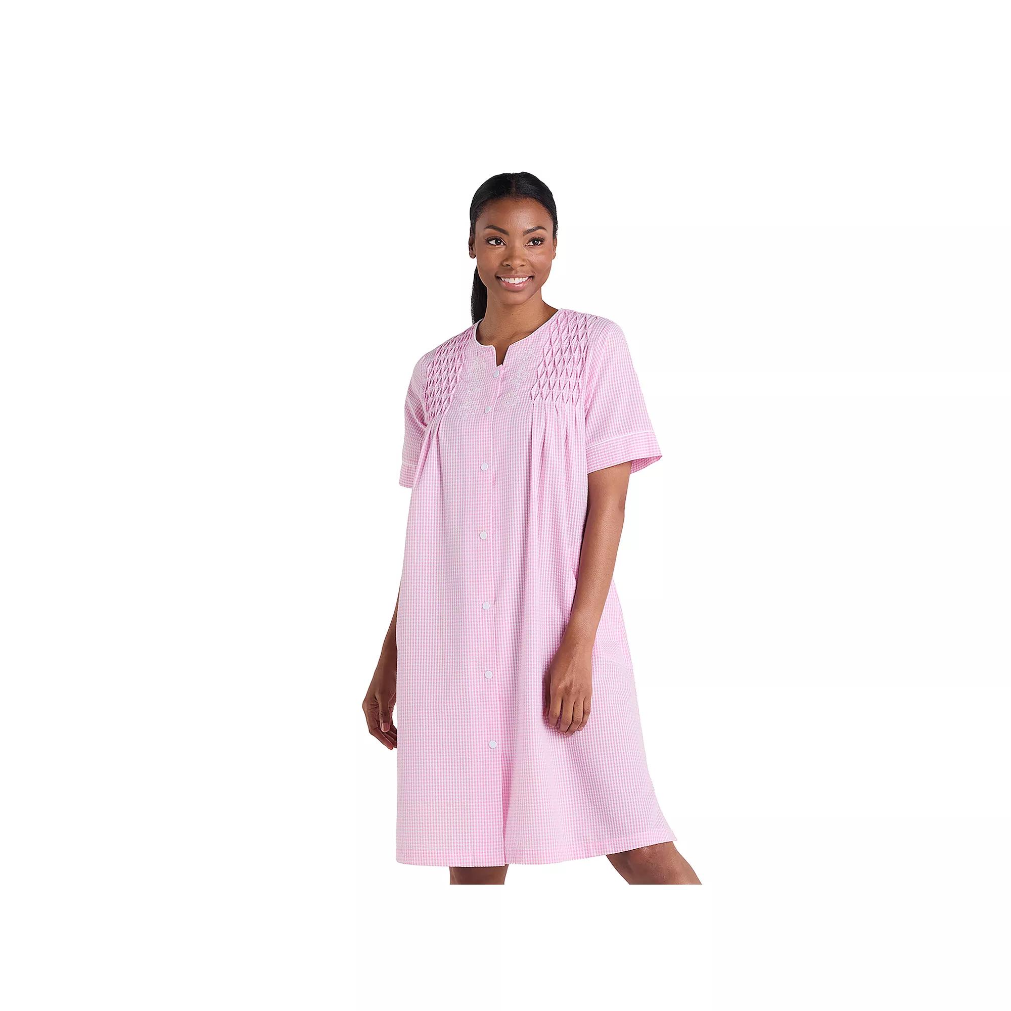This Miss Elaine Essentials Seersucker Short Snap Robe offers a comfortable, classic design with soft, lightweight seersucker fabric. Its perfect for warm days, featuring an easy snap front and convenient short sleeves for relaxed lounging. Click on this INTIMATES & SLEEPWEAR GUIDE to find the perfect fit and more!This Miss Elaine Essentials Seersucker Short Snap Robe offers a comfortable, classic design with soft, lightweight seersucker fabric. Its perfect for warm days, featuring an easy snap front and convenient short sleeves for relaxed lounging. Click on this INTIMATES & SLEEPWEAR GUIDE to find the perfect fit and more!FEATURES 2 side pockets Snap front Short sleevesFIT & SIZING Loose fit 41-in. length from shoulder to hemFABRIC & CARE Machine wash delicate and tumble dry low Imported Size: Medium. Color: Pink White Check. Gender: female. Age Group: adult.