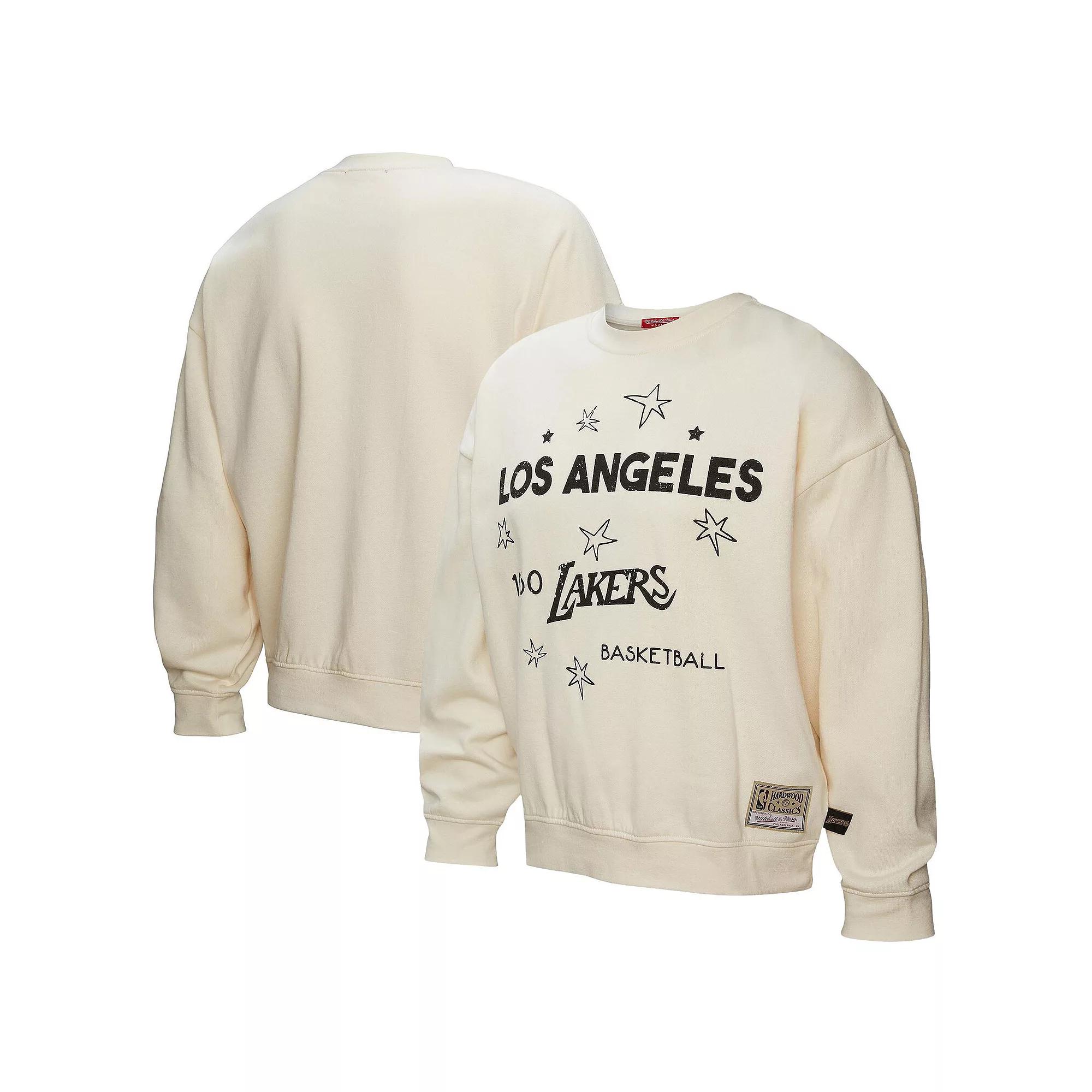 Channel vintage Los Angeles Lakers style with this Hardwood Classics Pullover Sweatshirt from Mitchell & Ness. This lightweight sweatshirt features a throwback team logo printed with wordmark and star graphics, adding a vintage vibe to your Lakers fandom. The distressed graphical design enhances the retro aesthetic, making it a stylish and comfortable choice for milder weather. Lightweight sweatshirt suitable for mild temperatures. Throwback team logo printed with wordmark and star graphics surrounding the center. Distressed graphical design. Material: 60% Cotton/40% Polyester. Officially licensed. Imported. Pullover. Machine wash with garment inside out, tumble dry low. Brand: Mitchell & Ness. Long sleeve. Color: Gold. Gender: female. Age Group: adult.