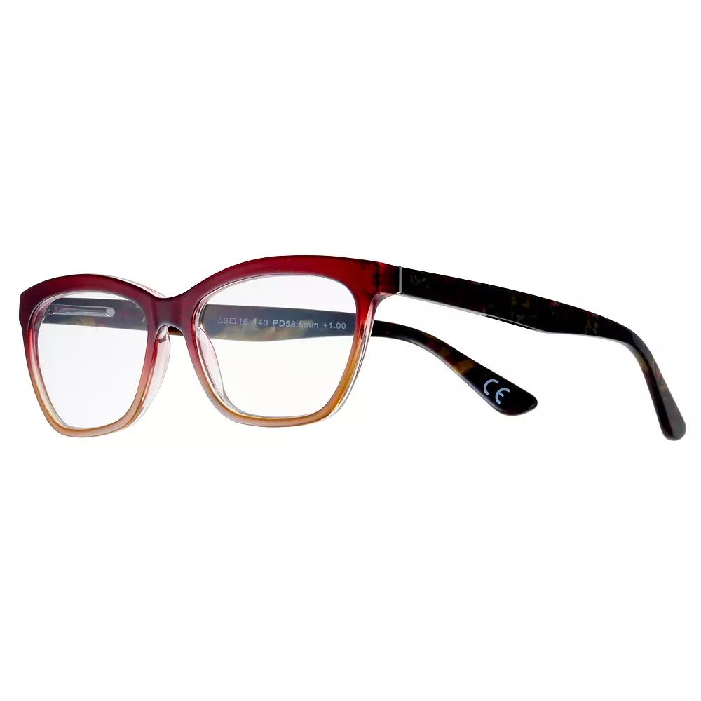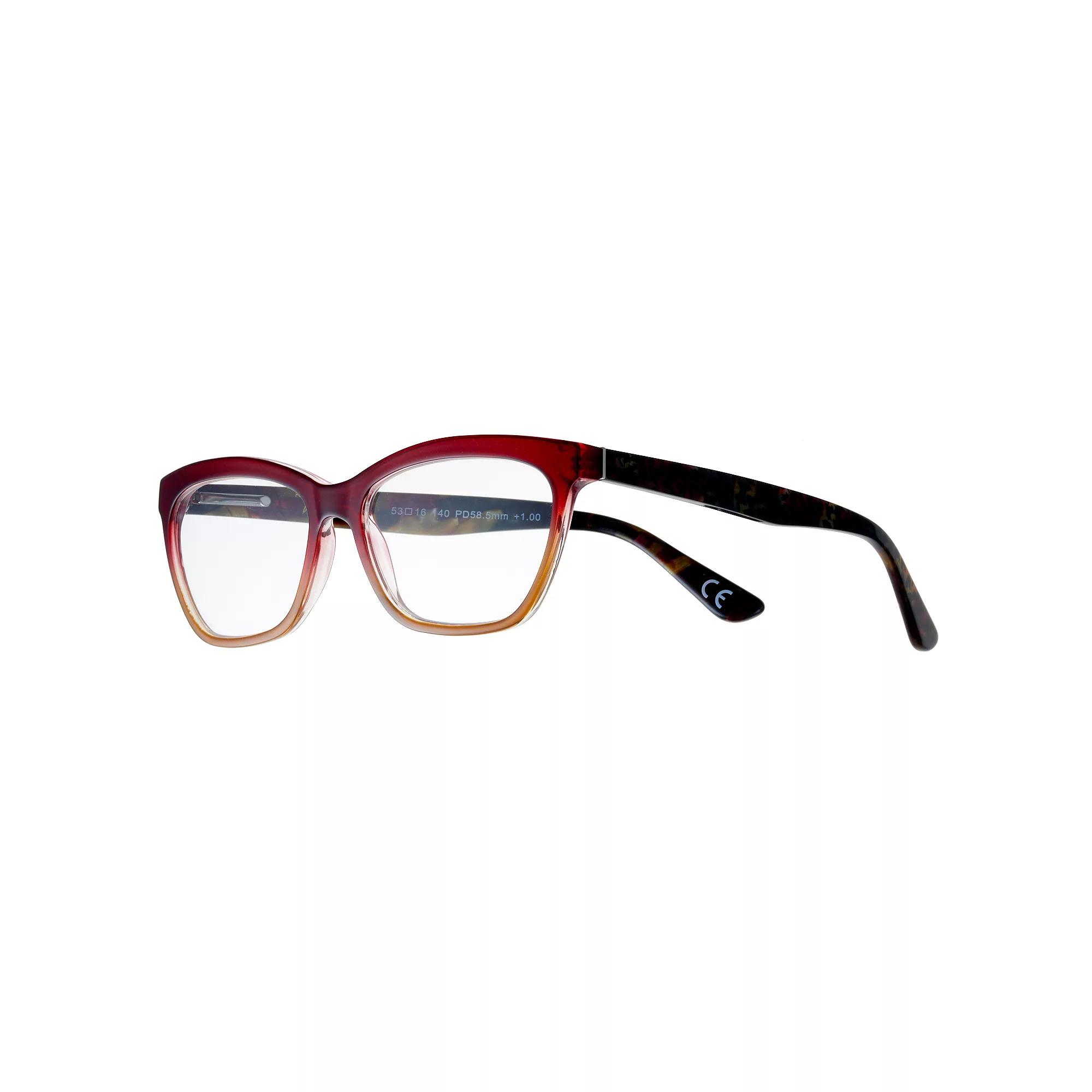 These women's Foster Grant reading glasses are designed to keep your look on point while reducing eye strain and headaches. Frame material: plastic Frame color: wine & brown ombre Lens material: acrylic Durability: scratch resistant Case: soft pouch with microfiber cleaning cloth Model number: 1019031 FIT DETAILS Eye/bridge/temple measurements: 53mm/16mm/140mm How do I find my frame size? Silhouette: wayfarer Nose pads: integrated Hinges: flexible Size: +2.0. Color: Multicolor. Gender: female. Age Group: adult.