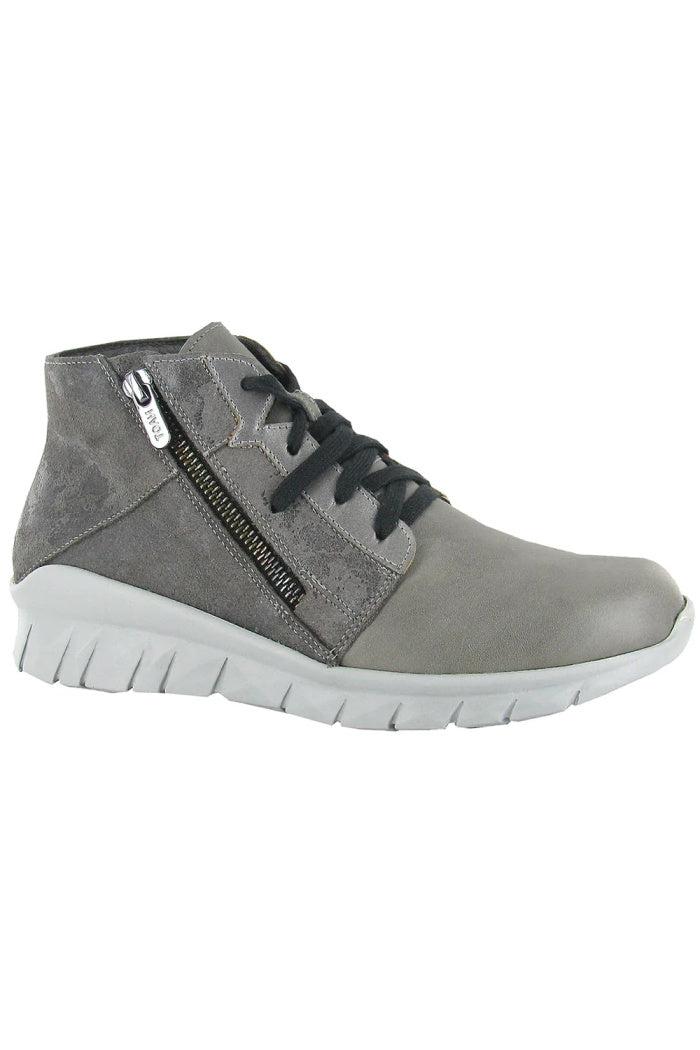Women's Naot Polaris Boots The Naot Polaris is the perfect athleisure shoe with eye catching shades of leather with a slip resistant sole. The Polaris has a cork & latex removable footbed that provides all-day comfort. This shoe has an outside zipper for easy on/off with laces for a stylish look. This collection uses a hand-sewn Strobel construction making it strong and extremely flexible.