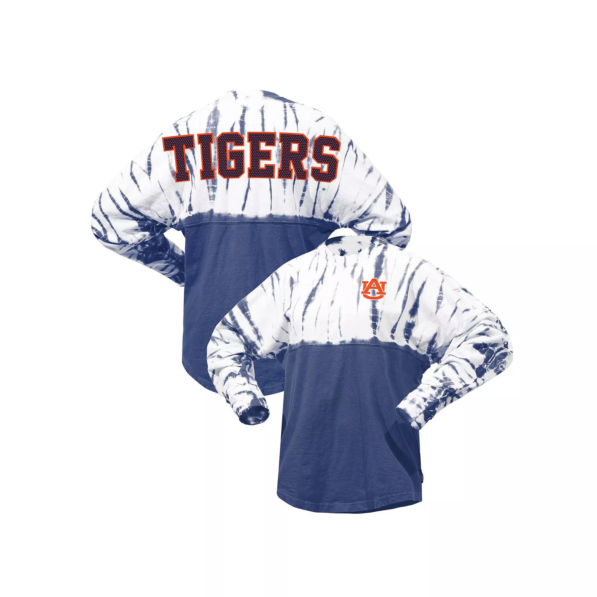 The Women's Navy Auburn Tigers Tie-Dye Long Sleeve Jersey T-Shirt is the perfect way to show your support for the Auburn Tigers. With its low-puff screen-print graphics and faux mesh design, this T-shirt is both stylish and comfortable. The dolman sleeves and dropped shoulders provide a relaxed fit, while the rounded hem and front and back yoke seam add a touch of sophistication. The tie-dye pattern will vary on each T-shirt, making it a unique and one-of-a-kind piece. Whether you're cheering on the Tigers at the stadium or just showing your support around town, this T-shirt is sure to turn heads. Oversized fit. Dolman sleeves. Machine wash with garment inside out, tumble dry low. Crew neck. Officially licensed. Long sleeve. Material: 100% Cotton. Imported. Dropped shoulders. Tie-dye pattern will vary on each T-shirt. Faux mesh design. Front and back yoke seam. Rounded hem. Low-puff screen-print graphics. Brand: Spirit Jersey. Gender: female. Age Group: adult.