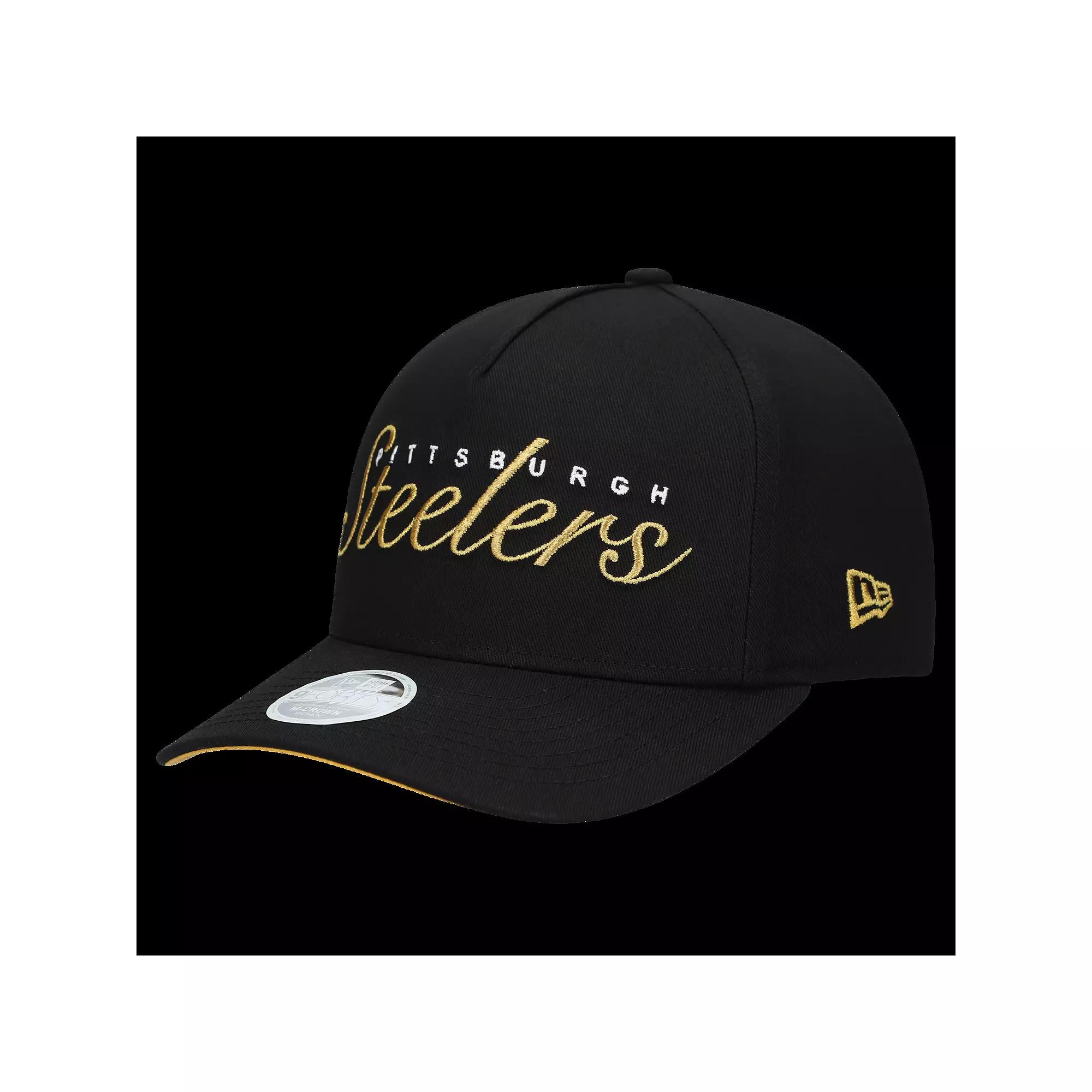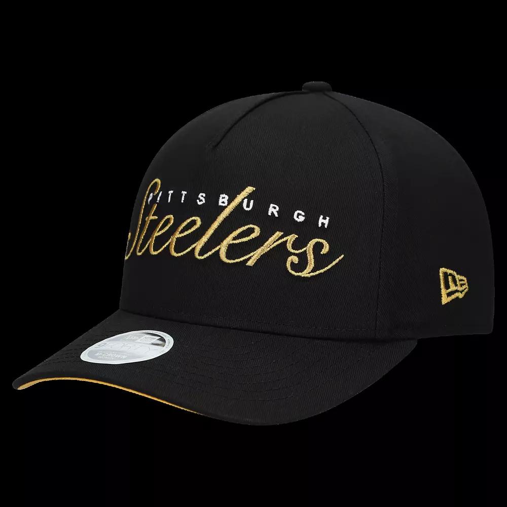 Add a touch of team spirit to your wardrobe with this Pittsburgh Steelers Metallic 9FORTY M-Crown A-Frame Adjustable Hat from New Era.Featuring New Era's 9FORTY A-Frame design, this hat merges the front two crown panels into one for a high-profile, unmistakable look. The embroidered team wordmark on the front proudly displays your Pittsburgh Steelers pride, while the team-color satin undervisor adds a touch of flair. Imported. Woven team clip tag at closure. The 9FORTY A-Frame merges the front two crown panels into one, creating a high-profile pinched shape and an unmistakable look. Material: 100% Cotton. Curved bill. Snap Closure. Brand: New Era. M-Crown has a semi-full shape that sits higher than the original 9FORTY. COOLERA technology wicks away sweat. MICROERA technology acts as an anti-microbial to reduce odor. Wipe clean with a damp cloth. One size fits most. Mid and rear panels with eyelets. Embroidered team wordmark with metallic detail on front. Team-color satin undervisor. Structured fit. Officially licensed. Solid front panel. Mid Crown. Color: Black. Gender: female. Age Group: adult.