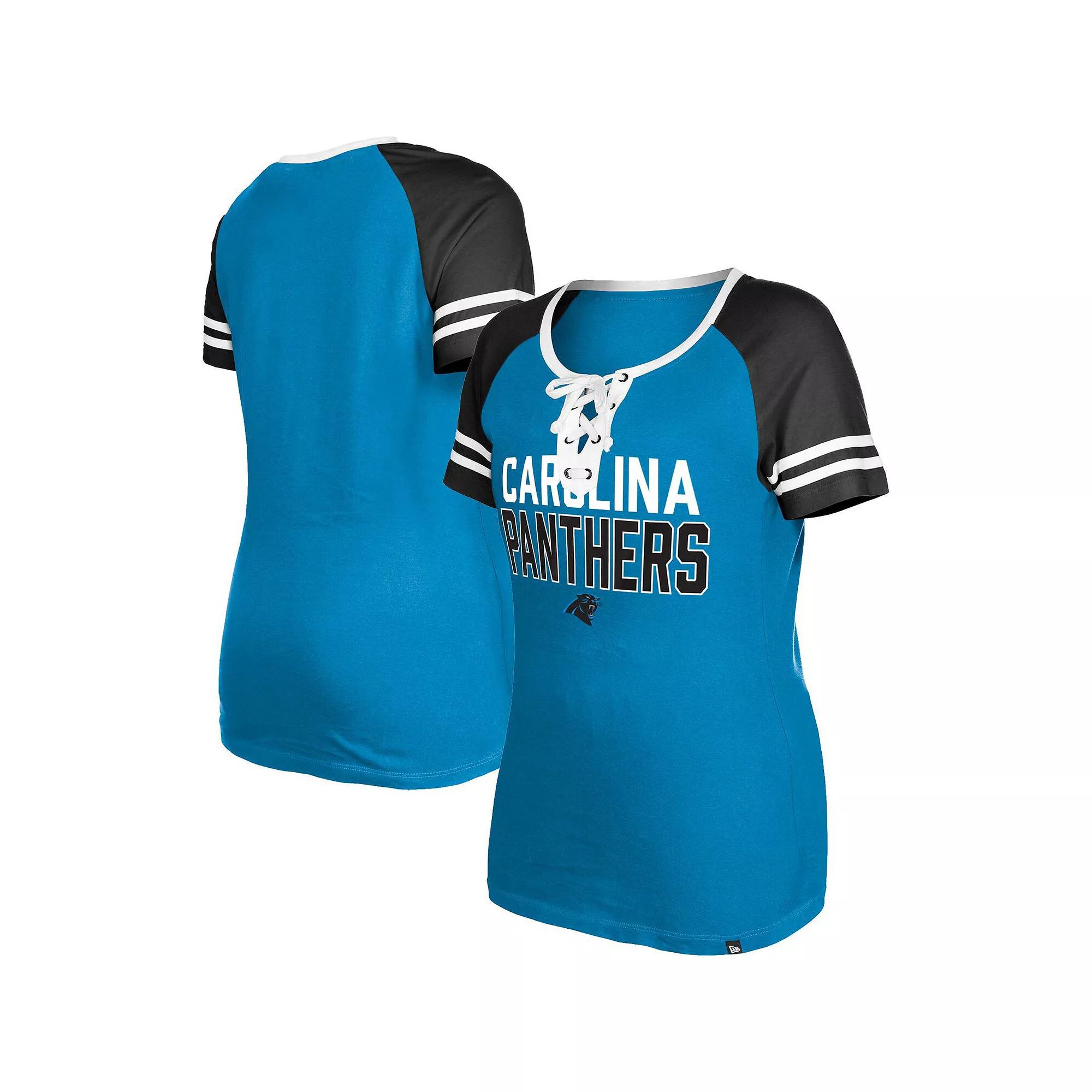 Stay ready for the next Carolina Panthers kickoff with this Lace-Up T-shirt from New Era. It features a sporty neckline and Carolina Panthers graphics printed on lightweight fabric. Contrasting raglan sleeves provide ease of movement for more comfortable wearing all game day.Stay ready for the next Carolina Panthers kickoff with this Lace-Up T-shirt from New Era. It features a sporty neckline and Carolina Panthers graphics printed on lightweight fabric. Contrasting raglan sleeves provide ease of movement for more comfortable wearing all game day.Brand: New EraScreen print graphicsShort sleeveSewn-on stripesMaterial: 100% CottonLightweight fabricMachine wash, tumble dry lowRounded hemImportedLace-upSizing Tip: Product runs small. We recommend ordering one size larger than you normally wear.Officially licensedRaglan sleeves Size: XS. Color: Blue. Gender: female. Age Group: adult.