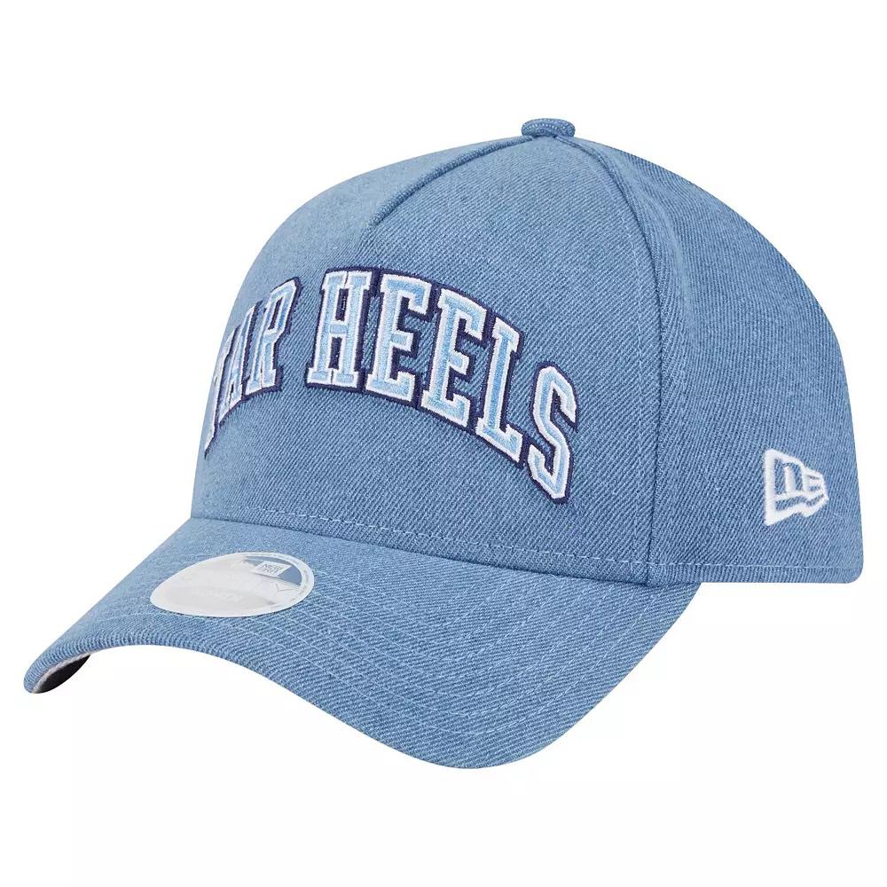 Stay on-trend while repping your North Carolina Tar Heels with this New Era A-Frame 9FORTY Adjustable Hat. This hat features a unique A-frame design, merging the front two crown panels into one for a high-profile, pinched shape that stands out from the crowd. The team's wordmark is embroidered on the front crown in raised detail, showcasing your North Carolina Tar Heels pride with a touch of fashion. Adjustable bow tie. Brand: New Era. Wipe clean with a damp cloth. The 9FORTY A-Frame merges the front two crown panels into one, creating a high-profile pinched shape and an unmistakable look. Five panels with eyelets. Mid Crown. Wordmark embroidered on front crown in raised detail. Solid front panel. Woven clip tag. Curved bill. One size fits most. Material: 100% Cotton. Structured fit. Imported. Officially licensed. Contrast color undervisor. Color: Turq A. Gender: female. Age Group: adult.