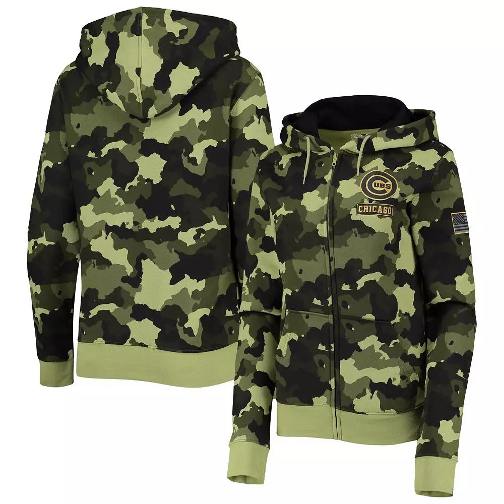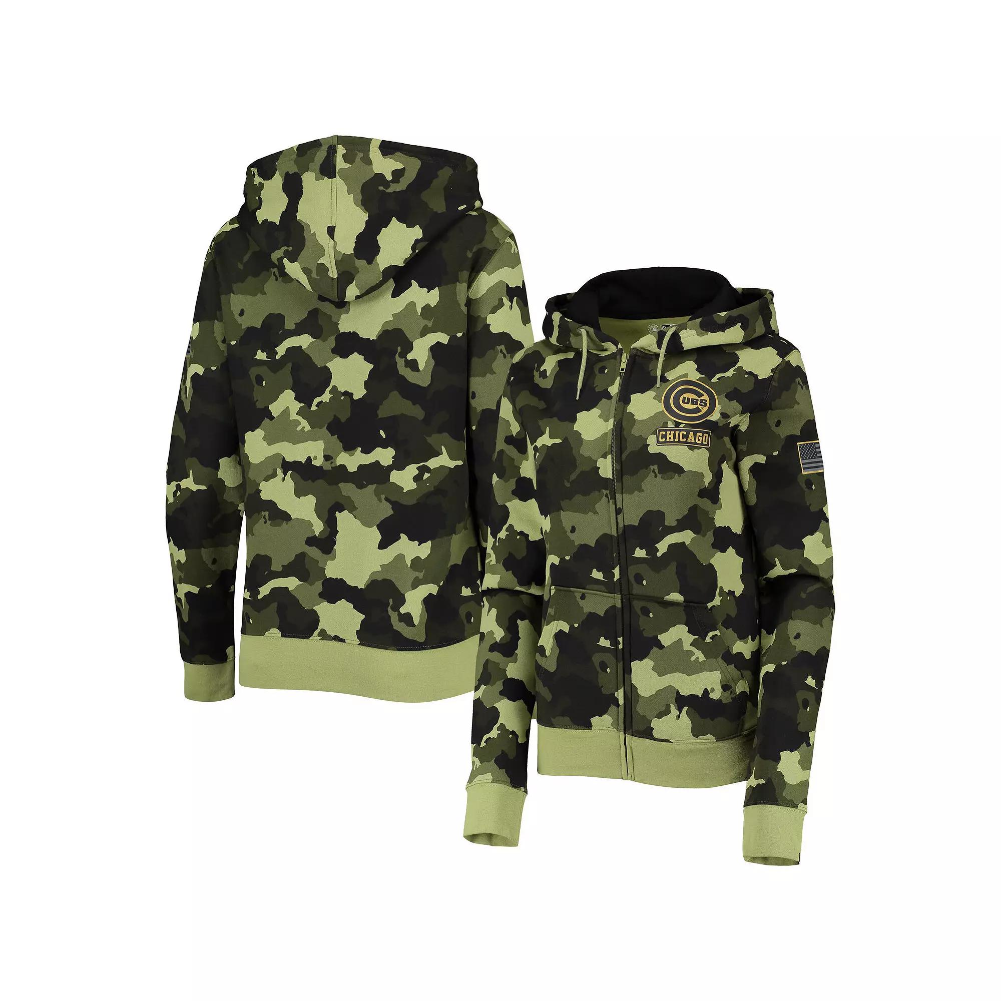 Give a huge thank you to our military members while representing the Chicago Cubs with this 2022 MLB Armed Forces Day full-zip hoodie from New Era. The classic team graphics on top of the spirited camo design blend perfectly together to show your die-hard fandom. Fleece lining in this midweight top is great for keeping you warm as you flaunt your support for our troops and the Chicago Cubs.Give a huge thank you to our military members while representing the Chicago Cubs with this 2022 MLB Armed Forces Day full-zip hoodie from New Era. The classic team graphics on top of the spirited camo design blend perfectly together to show your die-hard fandom. Fleece lining in this midweight top is great for keeping you warm as you flaunt your support for our troops and the Chicago Cubs.Brand: New EraTagless CollarMachine wash with garment inside out, tumble dry lowImportedFleece liningFull-zipOfficially licensedMidweight hoodie suitable for moderate temperaturesHood with drawstringSublimated camo designTwo front slip pocketsMaterial: 80% Cotton/20% PolyesterScreen print graphicsLong sleeve Color: Green. Gender: female. Age Group: adult.