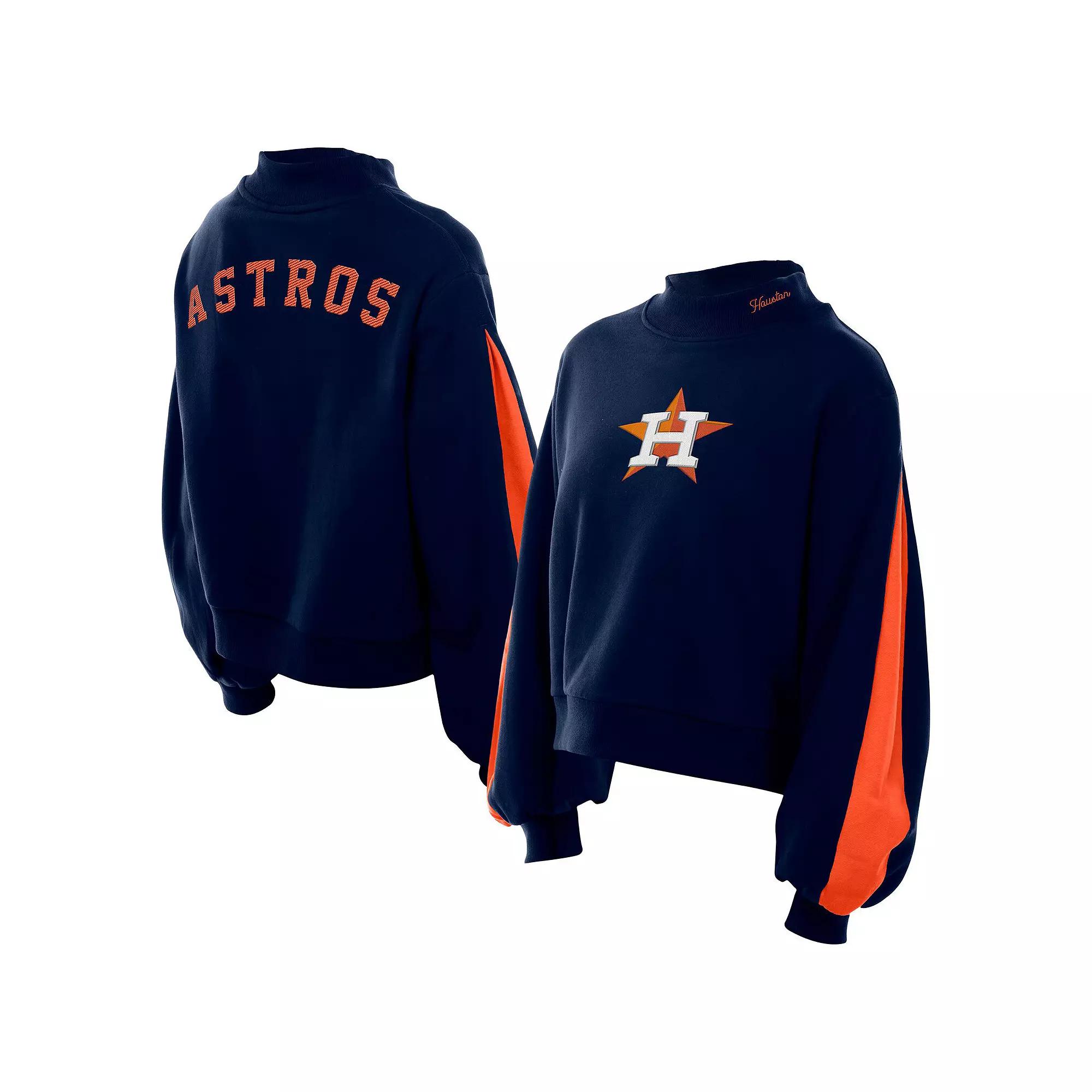 Stay cozy and stylish while cheering on your favorite baseball team in this Houston Astros Mock Neck Balloon Sleeve Sweatshirt from New Era. The fleece lining provides additional warmth while the rib-knit cuffs and hem ensure a snug fit, letting you move freely while keeping out the chill. The team logo and name are embroidered on the front and back, proudly displaying your loyalty to the Houston Astros. Relaxed Fit: Loose and roomy across the chest, shoulders and body. Midweight sweatshirt suitable for moderate temperatures. Material: 60% Cotton/40% Polyester. Brand: New Era. Fleece lining for additional warmth. Embroidered Logo. Pullover. Imported. High hip length (Measures approx. 22). Team color inserts on sleeves. Rib knit cuffs and hem for a snug fit and easy mobility. Long sleeve. Mock neck. Team logo and name embroidered on front and back. Mock neck with embroidered city name. Officially licensed. Machine wash, tumble dry low. Color: Navy. Gender: female. Age Group: adult.