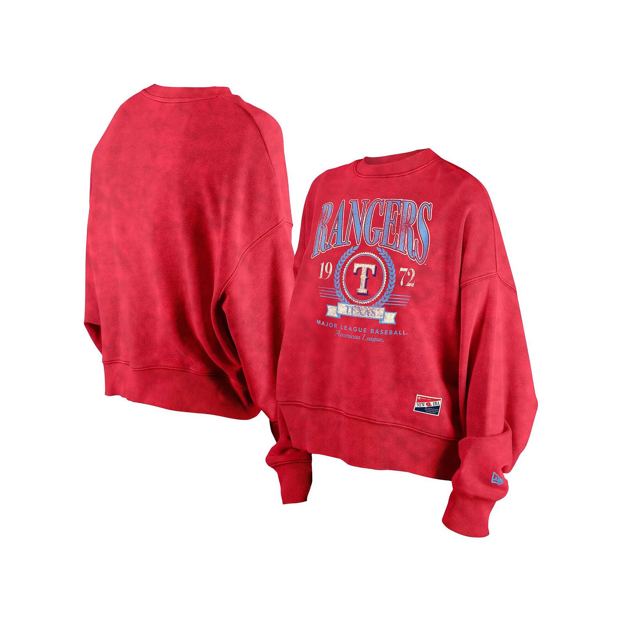 Channel vintage vibes while repping your Texas Rangers with this Throwback Boxy Enzyme Wash Fleece Crewneck Pullover from New Era. The dropped shoulders and boxy fit create a relaxed, trendy look thats perfect for game day or casual outings. Plus, the enzyme wash gives it a vintage feel thats both stylish and comfortable.Channel vintage vibes while repping your Texas Rangers with this Throwback Boxy Enzyme Wash Fleece Crewneck Pullover from New Era. The dropped shoulders and boxy fit create a relaxed, trendy look thats perfect for game day or casual outings. Plus, the enzyme wash gives it a vintage feel thats both stylish and comfortable.PRODUCT FEATURESDistressed screen print graphicsMachine wash, tumble dry lowBrand: New EraPulloverOfficially licensedRib-knit collar, cuffs and hem for a durable stretchDropped shoulders and boxy fit for a relaxed trendy lookCrew neckImportedLong sleeveMidweight sweatshirt for moderate temperaturesEnzyme wash for a distressed lookMaterial: 60% Cotton/40% Polyester Size: XS. Color: Red. Gender: female. Age Group: adult.
