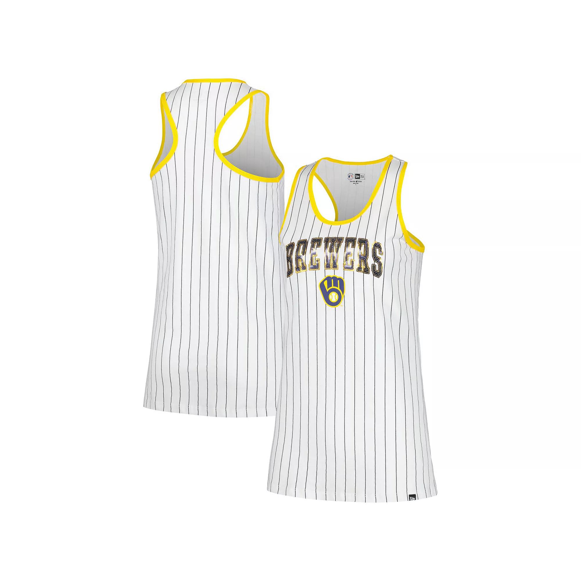 The Womens New Era White Milwaukee Brewers Sequin Pinstripe Racerback Tank Top is the perfect way to show your support for the Milwaukee Brewers. With its eye-catching sequin graphics and screen print graphics, this tank top is sure to turn heads. The racerback design and scoop neck make it comfortable to wear all day long, while the cotton material ensures you stay cool and dry. Whether youre cheering on the Brewers at the stadium or just relaxing at home, this tank top is a must-have for any fan.The Womens New Era White Milwaukee Brewers Sequin Pinstripe Racerback Tank Top is the perfect way to show your support for the Milwaukee Brewers. With its eye-catching sequin graphics and screen print graphics, this tank top is sure to turn heads. The racerback design and scoop neck make it comfortable to wear all day long, while the cotton material ensures you stay cool and dry. Whether youre cheering on the Brewers at the stadium or just relaxing at home, this tank top is a must-have for any fan.PRODUCT FEATURESOfficially licensedImportedRacerbackMachine wash with garment inside out, tumble dry lowScoop neckBrand: New EraSleevelessScreen print graphicsSequin graphicsMaterial: 100% Cotton Color: BRW WHITE. Gender: female. Age Group: adult.