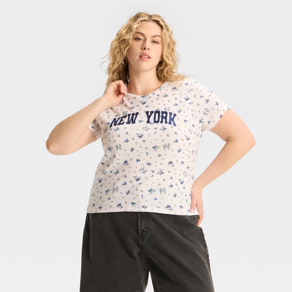 Women's New York Floral Pointelle Short Sleeve Graphic Baby T-Shirt - Off-White