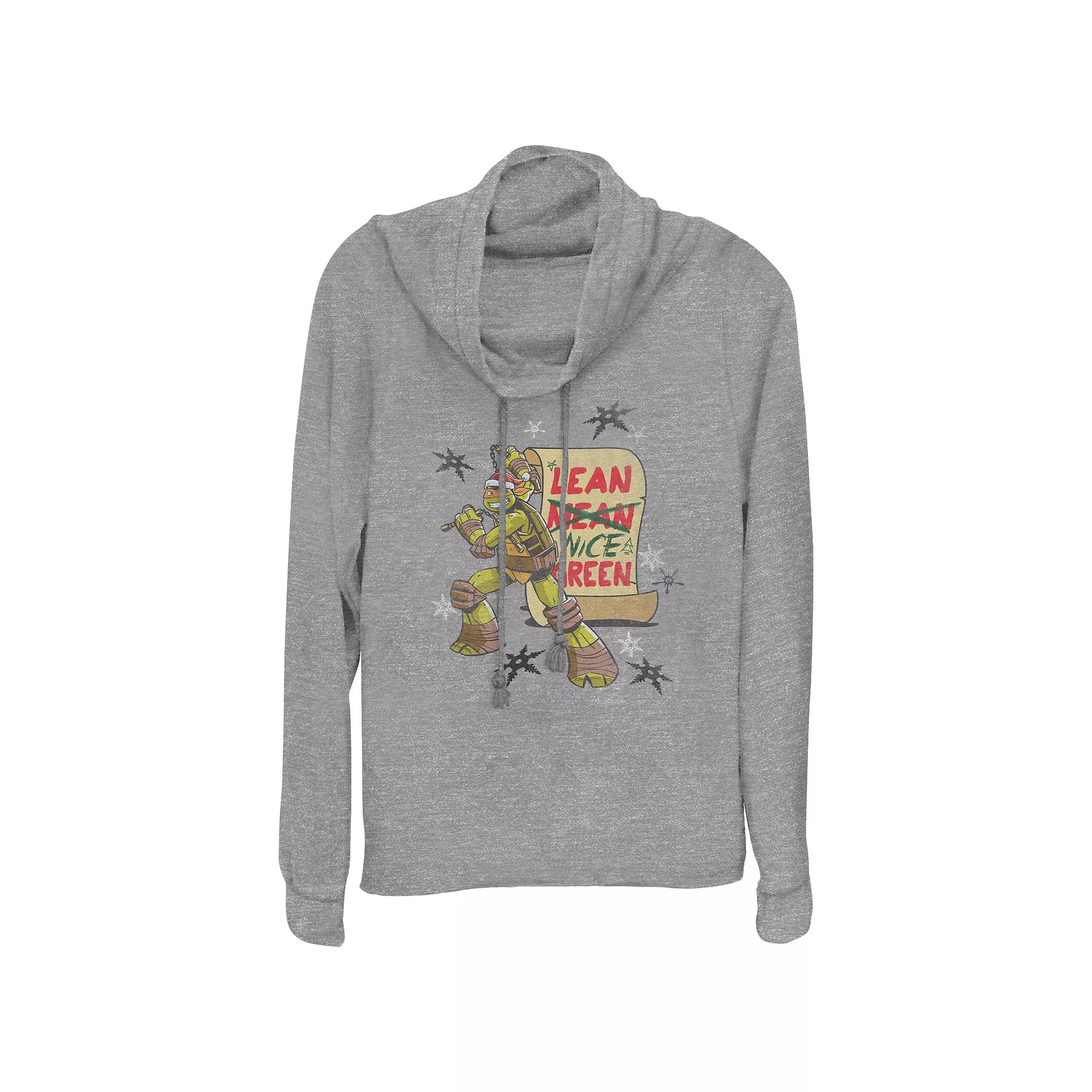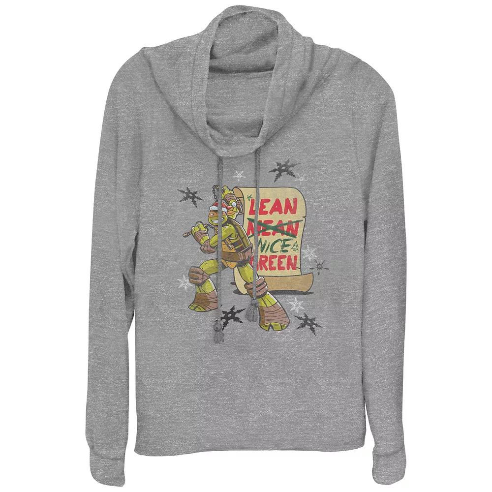 Shell love celebrating the Holiday season with this Womens Nickelodeon Teenage Mutant Ninja Turtles Michelangelo Lean Nice Green Cowlneck Graphic Lightweight Long Sleeve. FEATURES Cowlneck Long sleevesFABRIC & CARE Polyester, rayon, spandex Machine wash Imported Size: X Large. Color: Gray Heather. Gender: female. Age Group: adult.