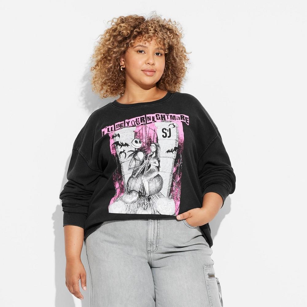 Upgrade your wardrobe with the Womens Nightmare Before Christmas Ill Be Your Nightmare Graphic Sweatshirt Black. With Nightmare Before Christmas graphics, it gives a cool, fun vibe that is perfect for Halloween. Made of midweight fabric, it can be worn comfortably to run errands or lounge around all day. This sweatshirt can be easily cared for with a machine wash and tumble dry.