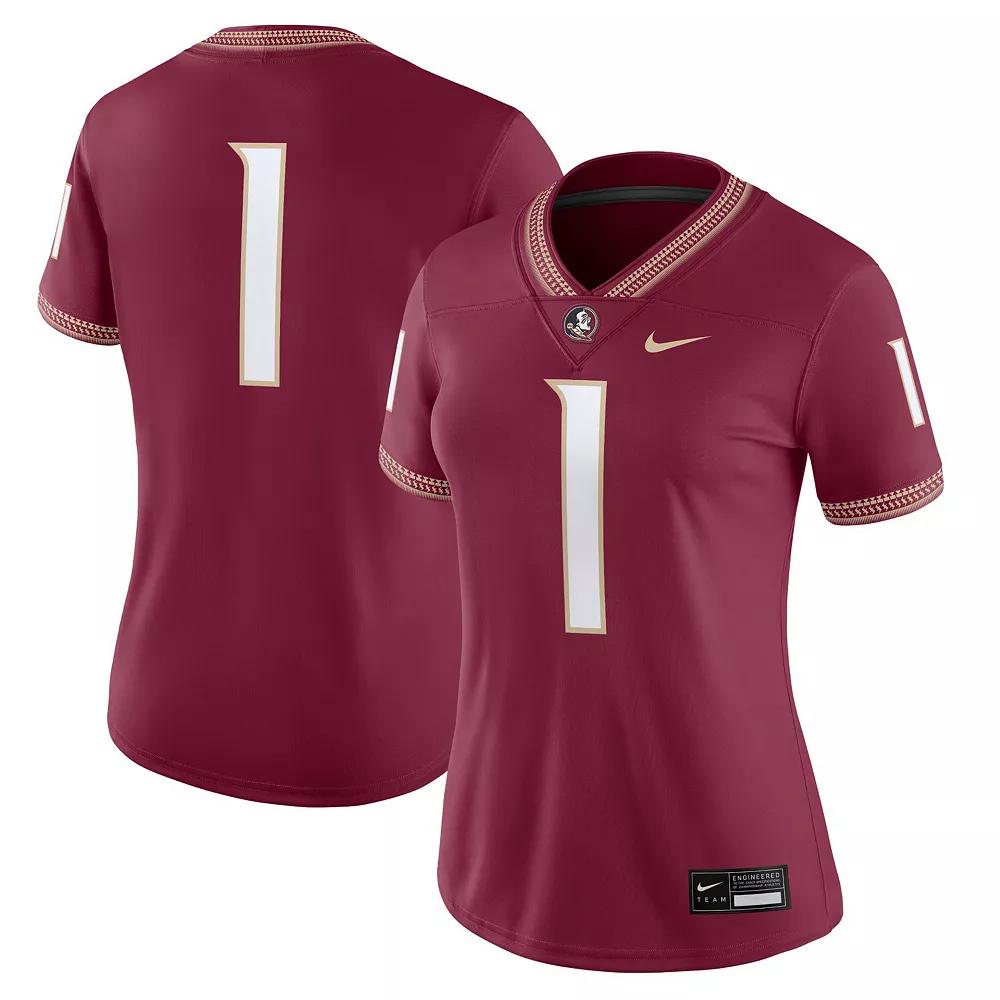 Show your Florida State Seminoles spirit with this sharp #1 Garnet Game Jersey from Nike. This Florida State Seminoles jersey is made from 100% recycled polyester and features a front yoke seam for a classic look. The heat-applied numbers and team details provide a lightweight and breathable feel, while the satin woven jock tag adds a touch of style. Thanks to Dri-FIT technology, this jersey will help keep you cool and dry whether youre cheering from the stands or watching the game at home.Show your Florida State Seminoles spirit with this sharp #1 Garnet Game Jersey from Nike. This Florida State Seminoles jersey is made from 100% recycled polyester and features a front yoke seam for a classic look. The heat-applied numbers and team details provide a lightweight and breathable feel, while the satin woven jock tag adds a touch of style. Thanks to Dri-FIT technology, this jersey will help keep you cool and dry whether youre cheering from the stands or watching the game at home.PRODUCT FEATURESNike GameImportedMaterial: 100% Recycled PolyesterMove To Zero is Nikes journey toward zero carbon and zero waste to help protect the future of sport. Apparel labeled sustainable materials is made with at least 55% recycled content.Machine wash, tumble dry lowHeat-applied numbers and team detailsFront yoke seamOfficially licensedSatin woven jock tagBrand: NikeDri-FIT technology wicks away moisture Color: Red. Gender: female. Age Group: adult. Material: Cotton.