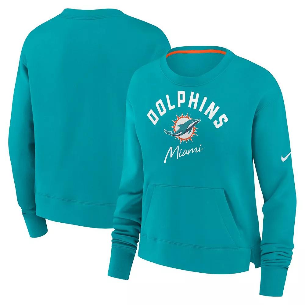 Stay cozy while you cheer on the Miami Dolphins with this Nike High Hip Fleece Pullover Sweatshirt. This trendy sweatshirt features a high hip hem that adds a touch of style, while the fleece lining provides extra warmth and comfort. The iconic Miami Dolphins team name and logo are prominently displayed on the front, making it clear where your allegiance lies.Stay cozy while you cheer on the Miami Dolphins with this Nike High Hip Fleece Pullover Sweatshirt. This trendy sweatshirt features a high hip hem that adds a touch of style, while the fleece lining provides extra warmth and comfort. The iconic Miami Dolphins team name and logo are prominently displayed on the front, making it clear where your allegiance lies.PRODUCT FEATURESMidweight sweatshirt suitable for moderate temperaturesOfficially licensedPulloverCrew neckLong sleeveBrand: NikeMaterial: 80% Cotton/20% PolyesterFront pouch pocketMachine wash, tumble dry lowTeam name and logo screen printed on the frontFleece lining adds softness and warmthImportedHem hits high on the hip Size: XL. Color: Turq A. Gender: female. Age Group: adult.
