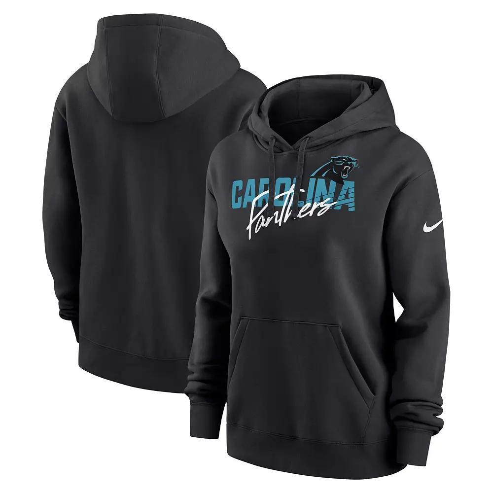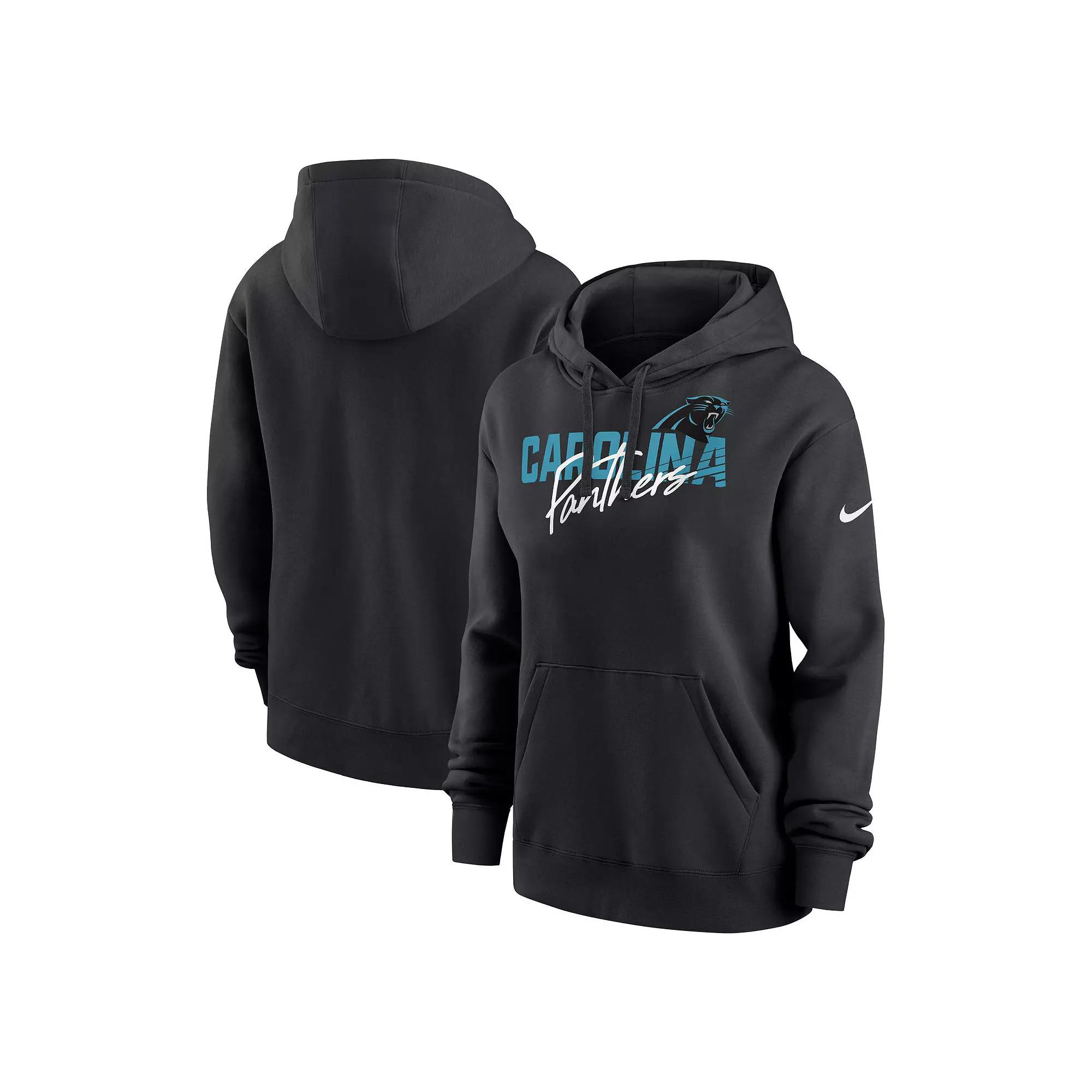 As temperatures drop, stay prepared for those chillier game days with this Carolina Panthers Wordmark Club hoodie from Nike. Designed with authentic detailing, this pullover features vibrant team graphics and a midweight construction to keep you warm and stylish all day long. An eye-catching Carolina Panthers design with a classic pullover construction and toasty fleece lining ensures comfort with any outfit you put together. Fleece lining. Pullover. Officially licensed. Machine wash, tumble dry low. Material: 100% Polyester. Front pouch pocket. Imported. Hooded. Screen print graphics. Long sleeve. Brand: Nike. Midweight hoodie suitable for moderate temperatures. Color: Black. Gender: female. Age Group: adult. Material: COTTON.
