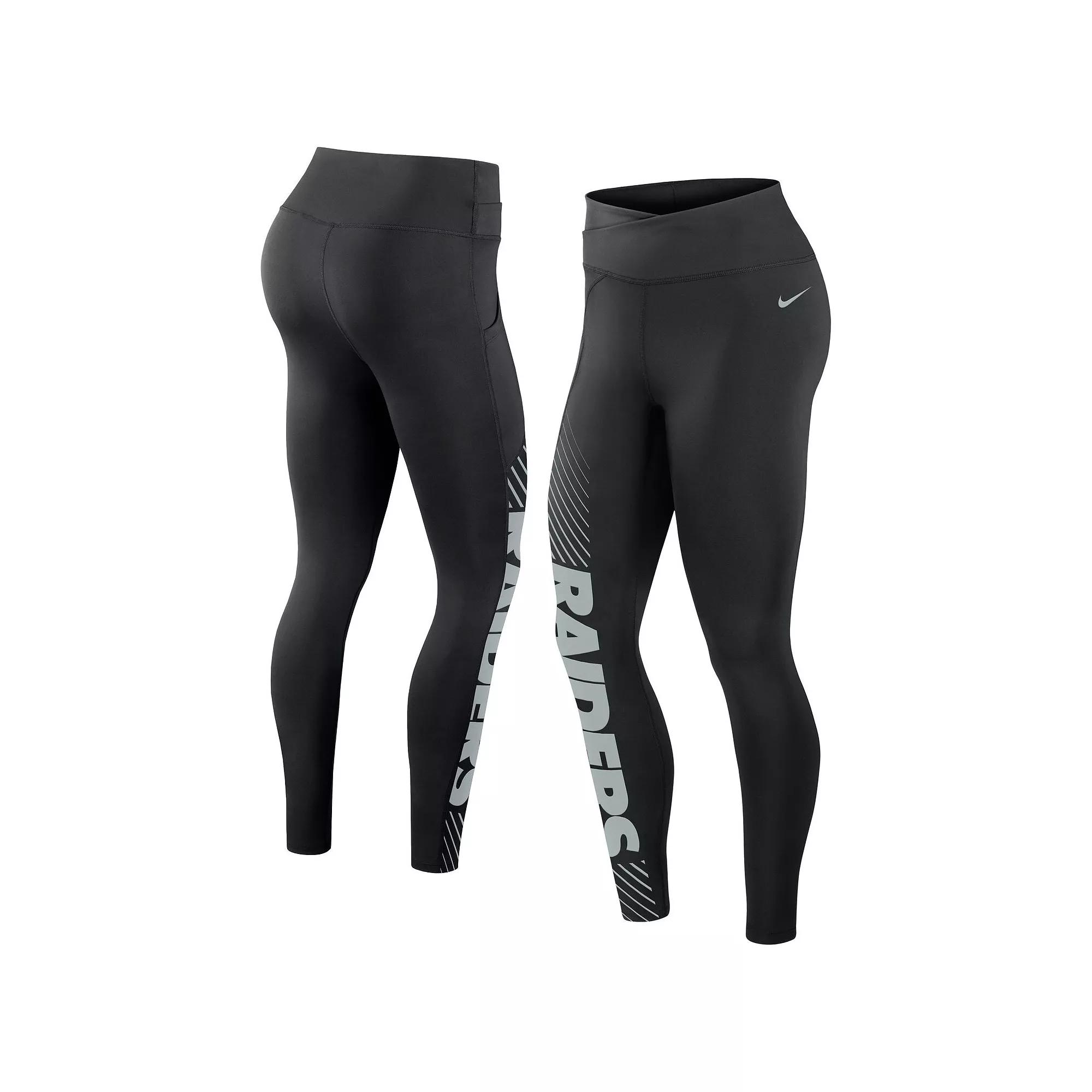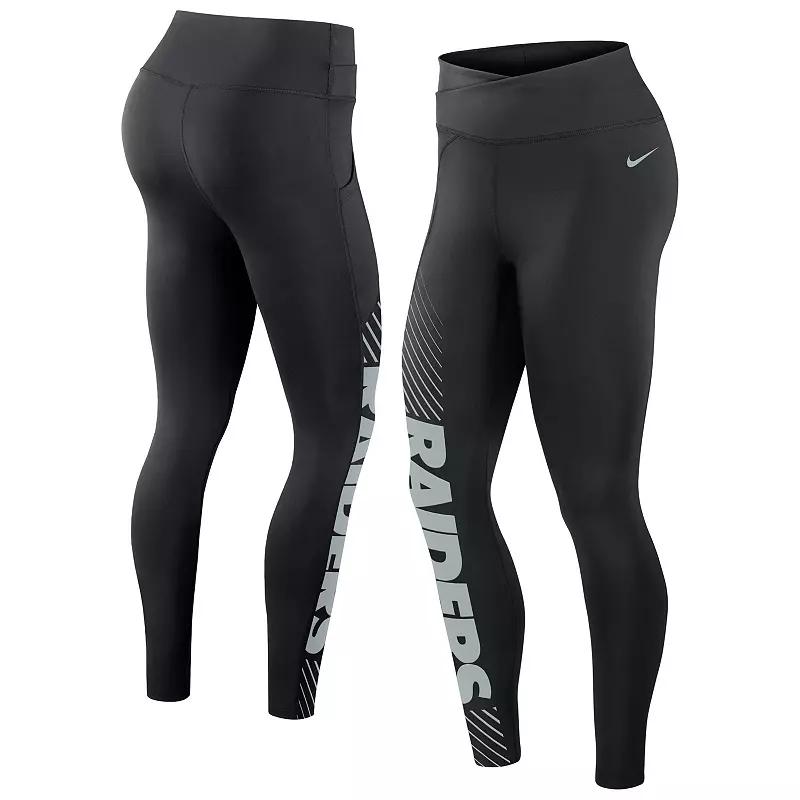 The Nike Dri-FIT Yard Line (NFL Las Vegas Raiders) Leggings are made with sweat-wicking fabric to help keep you cool and comfortable. Their flexible polyester-elastane fabric stretches with you as you move. Benefits: Nike Dri-FIT technology helps you stay dry, comfortable and focused. Elastic waistband helps provide a comfortable fit. Product Details: 77% polyester/23% elastane. Machine wash. Imported. Style: 00H500A8D; Color: Black; Size: 2XL; Gender: Female; Age Group: Adult | Nike Dri-FIT Yard Line (NFL Las Vegas Raiders) Women's Leggings in Black, Size: 2XL | 00H500A8D-05M