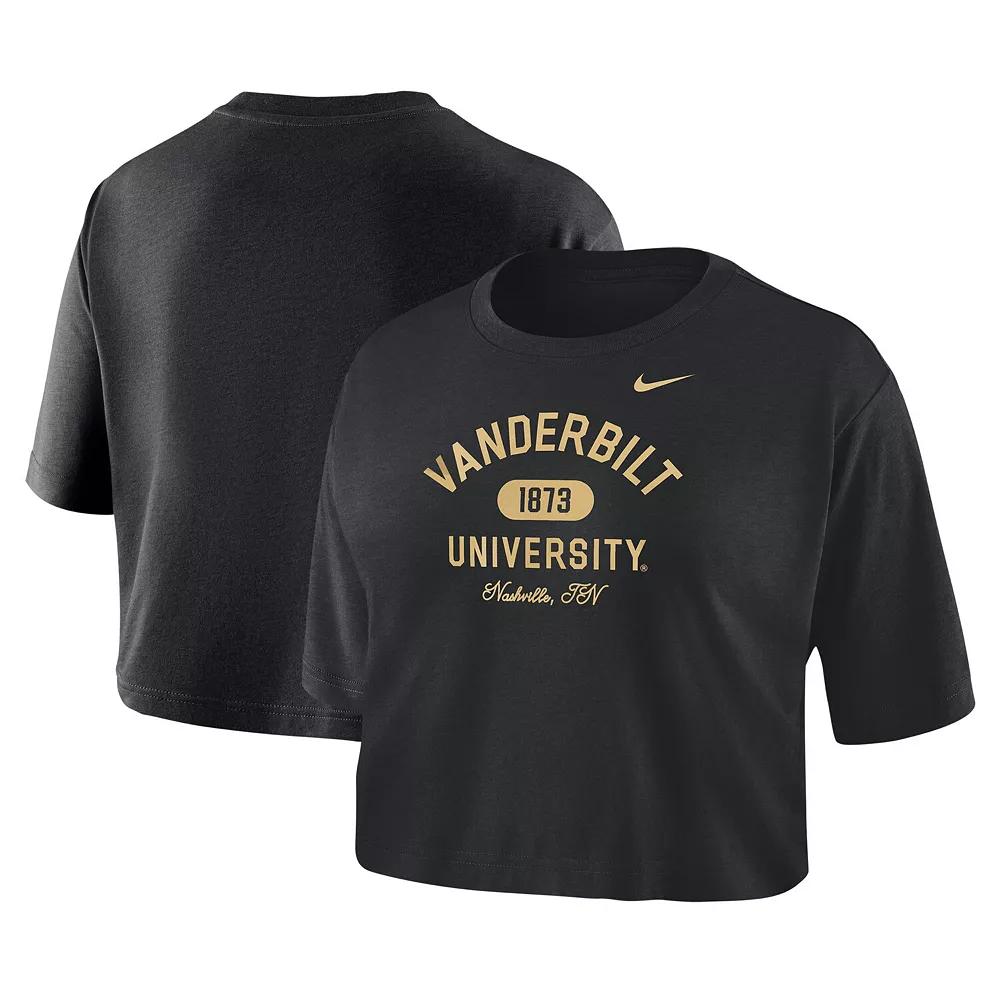 Sporty and cute, this Vanderbilt Commodores T-shirt by Nike has you covered on game day. A classic crew neck and loose fit promote a comfortable, casual feel. A cropped hem adds flair to the timeless Vanderbilt Commodores graphics, perfect to rep your favorite squad no matter the occassion.Sporty and cute, this Vanderbilt Commodores T-shirt by Nike has you covered on game day. A classic crew neck and loose fit promote a comfortable, casual feel. A cropped hem adds flair to the timeless Vanderbilt Commodores graphics, perfect to rep your favorite squad no matter the occassion.PRODUCT FEATURESImportedCropped hemCrew neckMachine wash, line dryDri-FIT technology wicks away moistureScreen print graphicsShort sleeveMaterial: 57% Cotton/43% PolyesterLoose fit for a roomy feelOfficially licensedBrand: Nike Size: XL. Color: Black. Gender: female. Age Group: adult.