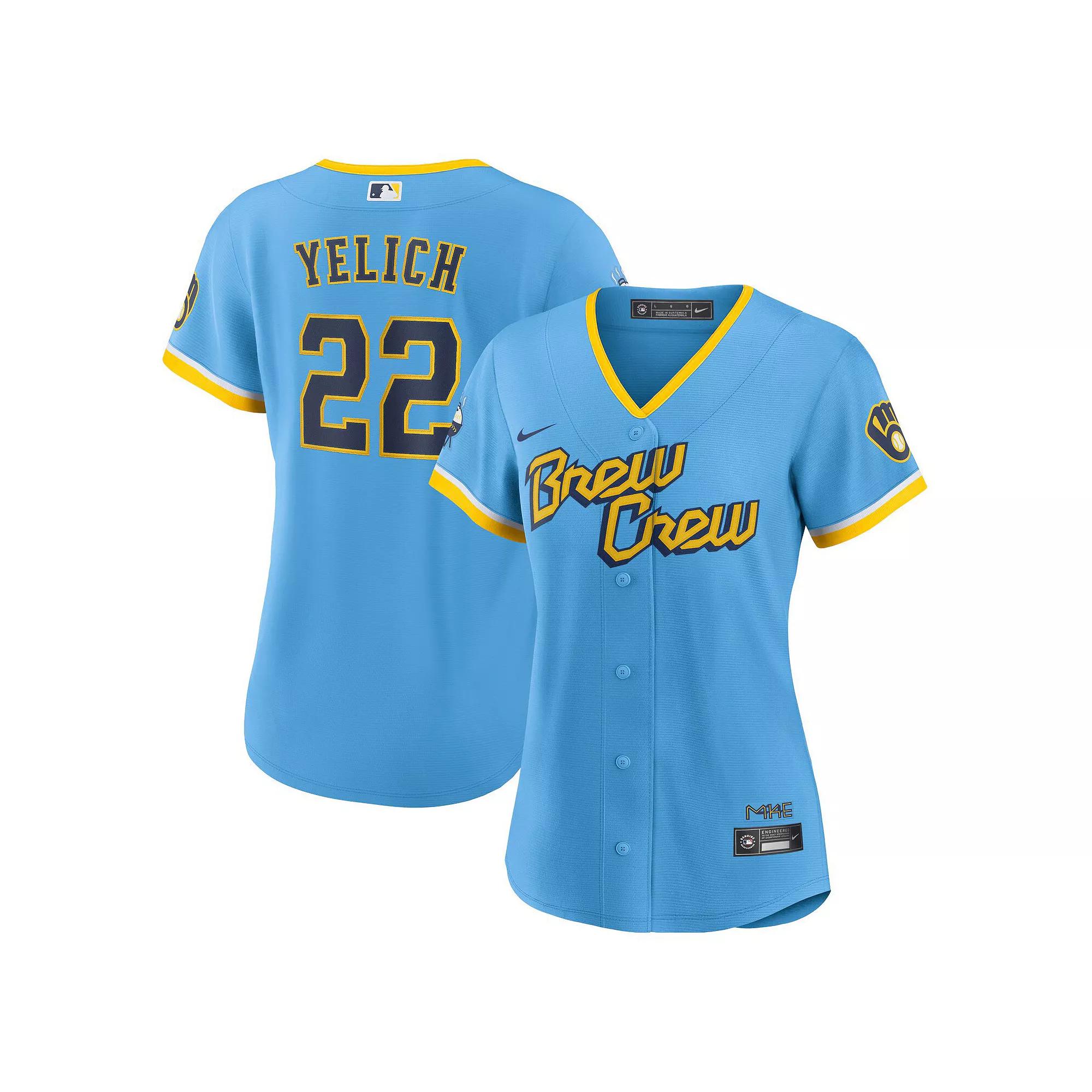 Your Milwaukee Brewers are the perfect embodiment of Wisconsins most cherished values of family and fun! From racing sausages at the games, down to the fans with cheese on their heads and beer in their hands, the Brew Crew have always been an extremely lively bunch. Add a truly unique piece to your collection of Milwaukee Brewers gear with this 2022 City Connect Christian Yelich Replica Player Jersey. This special Nike gear features workwear-inspired light blue and royal colors, going back to the historic industrial roots of the city. Snag some of this fresh new Milwaukee Brewers gear to make sure that whether youre cheering from the stands or from your favorite local brewery, everyone will know where youre from and which squad you rep.Your Milwaukee Brewers are the perfect embodiment of Wisconsins most cherished values of family and fun! From racing sausages at the games, down to the fans with cheese on their heads and beer in their hands, the Brew Crew have always been an extremely lively bunch. Add a truly unique piece to your collection of Milwaukee Brewers gear with this 2022 City Connect Christian Yelich Replica Player Jersey. This special Nike gear features workwear-inspired light blue and royal colors, going back to the historic industrial roots of the city. Snag some of this fresh new Milwaukee Brewers gear to make sure that whether youre cheering from the stands or from your favorite local brewery, everyone will know where youre from and which squad you rep.PRODUCT FEATURESMachine wash gentle or dry clean. Tumble dry low, hang dry preferred.Full-button frontBrand: NikeMLB Batterman applique on center back neckOfficially licensedRounded hemHeat-sealed transfer appliqueHeat-sealed jock tagShort sleeveMaterial: 100% PolyesterImported Gender: female. Age Group: adult.