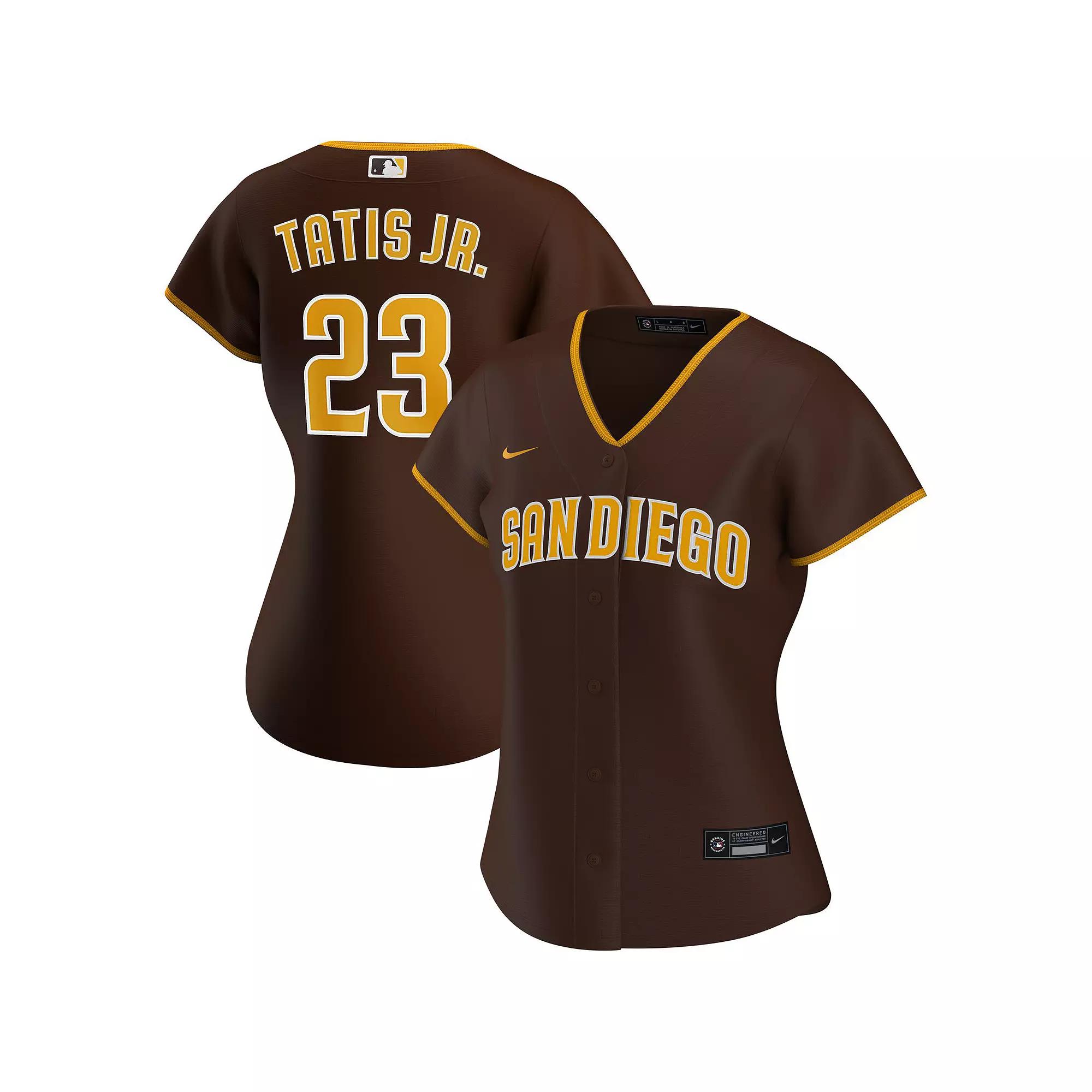 Youre the type of San Diego Padres fan who counts down the minutes until the first pitch. When your squad finally hits the field, show your support all game long with this Fernando Tats Jr. Road Replica Player jersey from Nike. Its classic full-button design features crisp Fernando Tats Jr. and San Diego Padres graphics, leaving no doubt as to where your allegiance lies.Youre the type of San Diego Padres fan who counts down the minutes until the first pitch. When your squad finally hits the field, show your support all game long with this Fernando Tats Jr. Road Replica Player jersey from Nike. Its classic full-button design features crisp Fernando Tats Jr. and San Diego Padres graphics, leaving no doubt as to where your allegiance lies.PRODUCT FEATURESSizing Tip: Product runs small. We recommend ordering one size larger than you normally wear.Material: 100% PolyesterHeat-sealed transfer appliqueFull-button frontShort sleeveHeat-sealed jock tagMLB Batterman applique on center back neckRounded hemMachine wash gentle or dry clean. Tumble dry low, hang dry preferred.Officially licensedImportedBrand: Nike Size: 2X. Color: Brown. Gender: female. Age Group: adult.