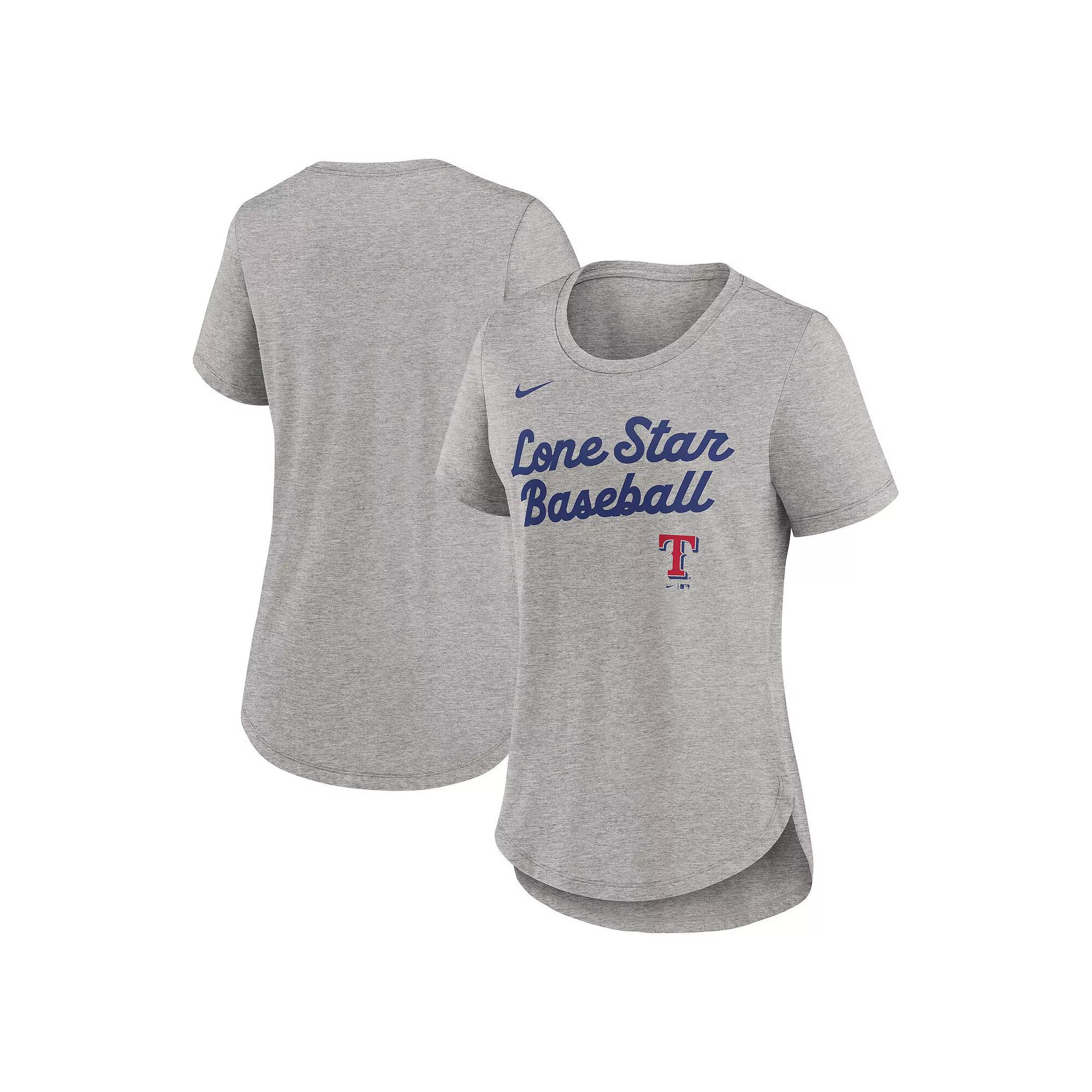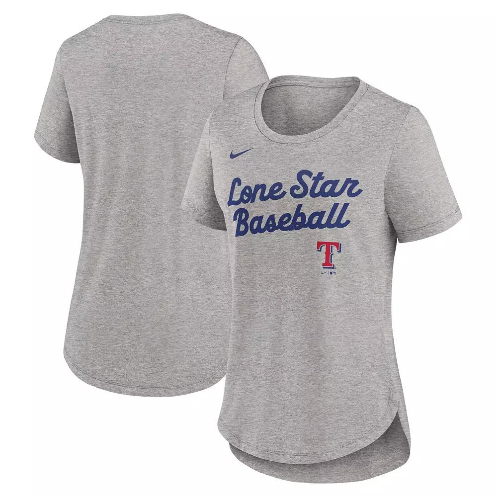 Rep your loyalty to the Texas Rangers with this Script Tri-Blend T-Shirt by Nike. The team details printed on the front let everyone know you're a tried-and-true fan. Tri-blend material provides a super-soft feel, making this Texas Rangers tee ideal for game day or casual wear.Rep your loyalty to the Texas Rangers with this Script Tri-Blend T-Shirt by Nike. The team details printed on the front let everyone know you're a tried-and-true fan. Tri-blend material provides a super-soft feel, making this Texas Rangers tee ideal for game day or casual wear.PRODUCT FEATURESMachine wash, tumble dry lowStandard Fit: Easy and traditionalScoop neckOfficially licensedScreen print graphicsShort sleeveBrand: NikeImportedTeam nickname and logo printed across the frontJersey fabric has a lightweight feel (160gsm)Material: 50% Polyester/25% Cotton/25% RayonRounded droptail hem with side splits Size: XL. Color: Grey. Gender: female. Age Group: adult.
