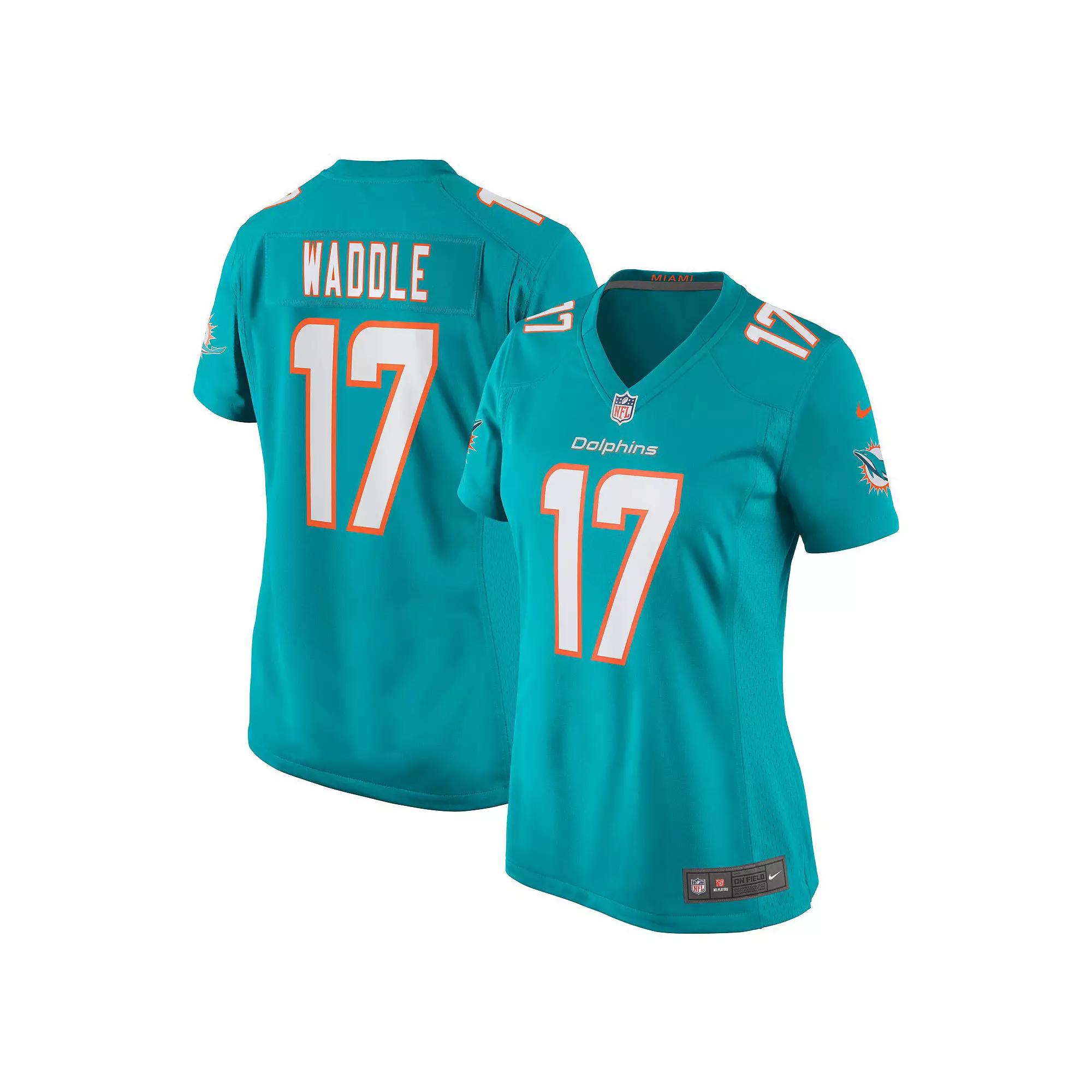 Rep the on-field look of your favorite Miami Dolphins player with this Jaylen Waddle Game jersey from Nike. Its heat-sealed name, numbers and team details provide a kickoff-ready aesthetic while also offering a comfortable, lightweight feel. Designed for everyday movement, this jersey has a versatile tailored fit and features mesh side panels for added ventilation as you celebrate every big play by the Miami Dolphins and Jaylen Waddle this season. Brand: Nike. Short sleeve. Mesh side panels for extra breathability. Officially licensed. Nike Game. Heat-sealed name, numbers and team details. Imported. Designed for movement. Material: 100% Polyester Tricot. Jersey Color Style: Team. Side splits at hem. Sewn-on NFL Shield at collar and satin twill woven jock tag at hem. Machine wash. First model is wearing size S and is 5'9; second model is wearing size XL and is 5'10. Size: 2X. Color: Turq A. Gender: female. Age Group: adult. Material: COTTON.