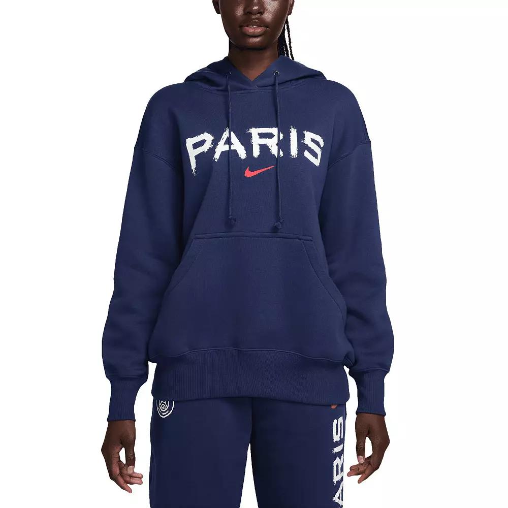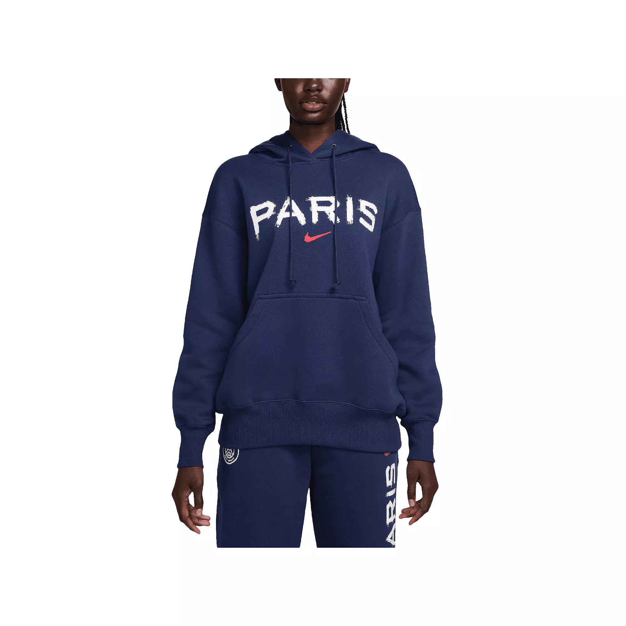 Rise up and transform your fleece wardrobe with this PSG hoodie. Our midweight brushed fleece feels extra soft on the inside and smooth on the outside, helping you stay cozy while keeping its structured shape. Grounded in style, comfort and versatility, its spacious fit helps keep you comfy while extra-tall ribbing and an oversized front pocket add a bold look. Benefits:Ribbed cuffs and hem help keep the hoodie in place while you move. Drawcord lets you wear the hood loose or cinch out the cold. Product Details:Front pocket. Body: 80% cotton/20% polyester. Hood lining: 100% cotton. Machine wash. Imported. Style: FQ3253; Color: Midnight Navy/University Red/White; Size: XL; Gender: Female; Age Group: Adult | Paris Saint-Germain Phoenix Fleece Women's Nike Soccer Oversized Pullover Hoodie in Blue, Size: XL | FQ3253-410