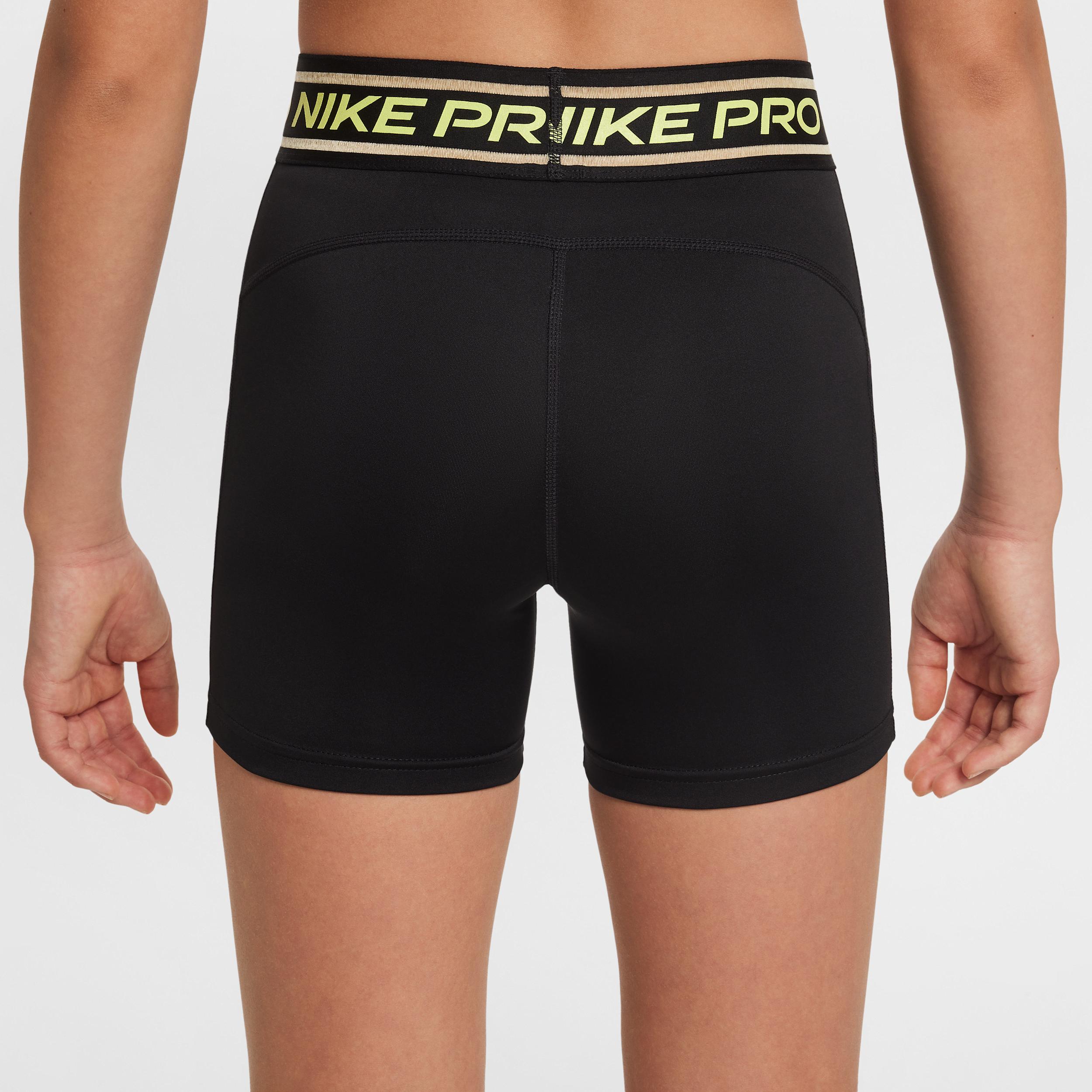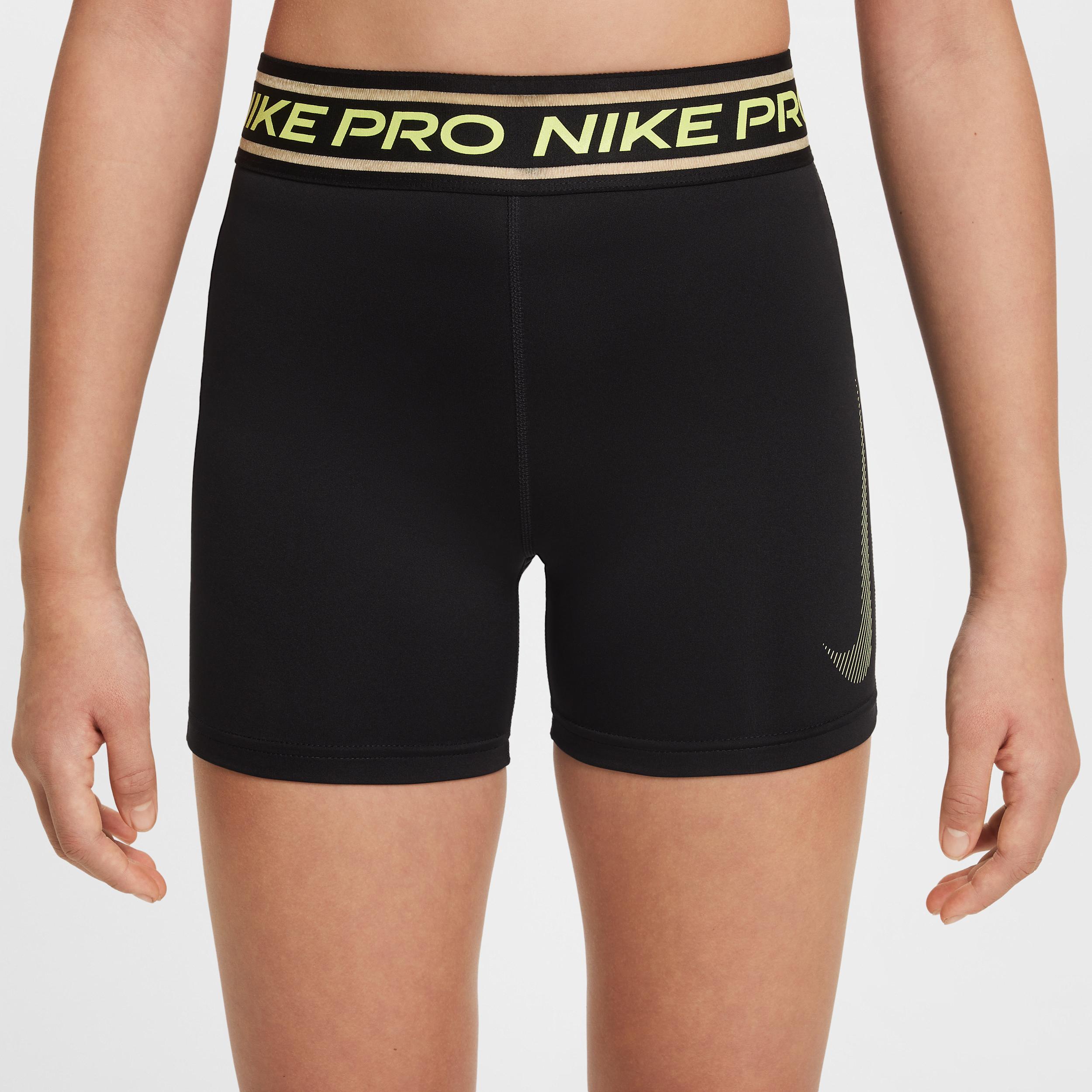 With smooth, stretchy fabric and our sweat-wicking Dri-FIT technology, our Nike Pro shorts help you stay dry and comfortable no matter how you move. Stay Dry Comfort:Nike Dri-FIT technology moves sweat away from your skin for quicker evaporation, helping you stay dry and comfortable. Snug Comfort:Smooth, stretchy fabric and a wide elastic waistband lay flat against your skin to help hold the shorts in place as you move. [] Product Details:Body:83% polyester/17% spandex. Elastic:59% nylon/27% polyester/14% spandex. Gusset lining:100% polyester. 3- inseam. Machine wash. Imported. Style: HV0733; Color: Black/Light Lemon Twist; Size: L; Gender: Female; Age Group: Kids | Nike Pro Girls 3 Shorts in Black, Size: Large | HV0733-011