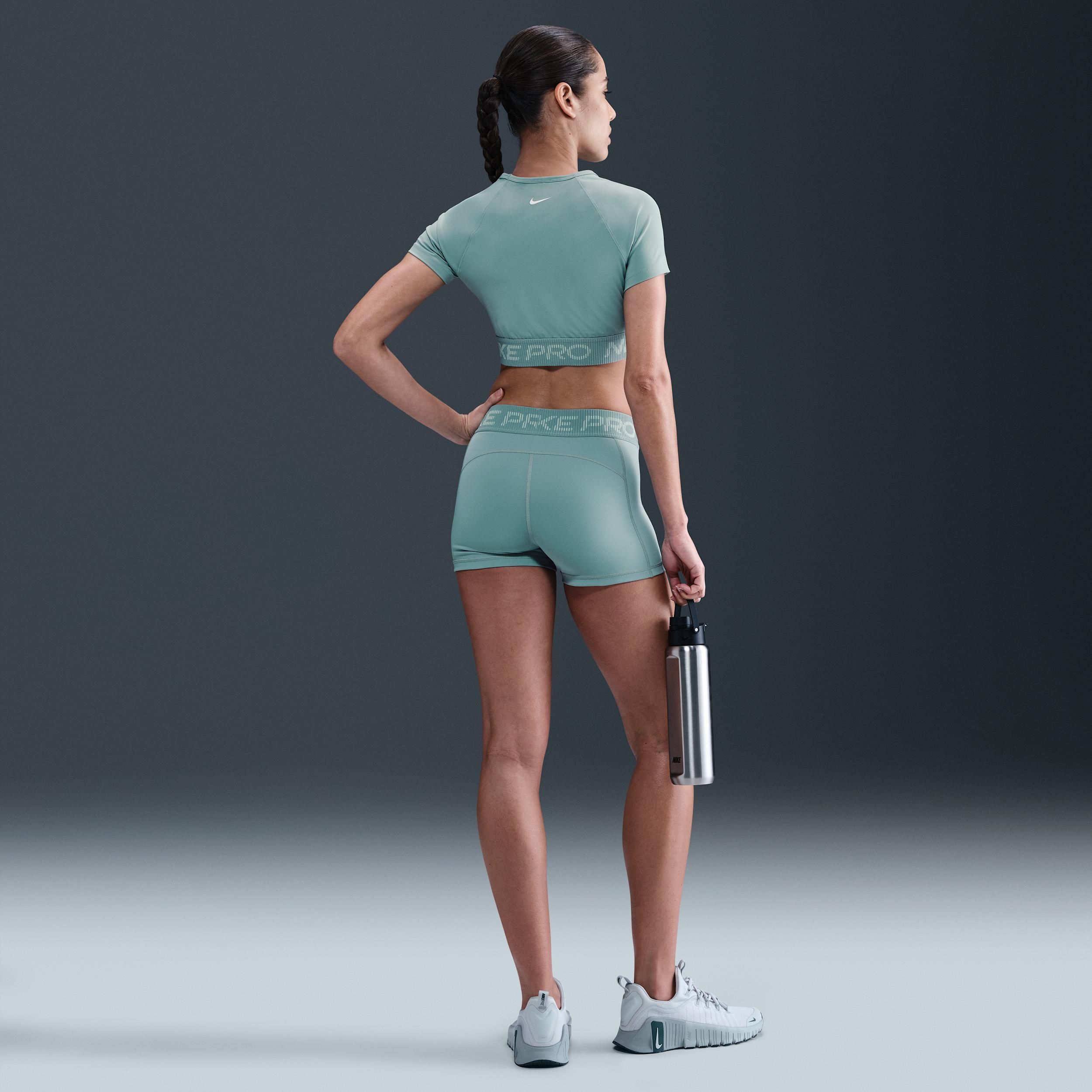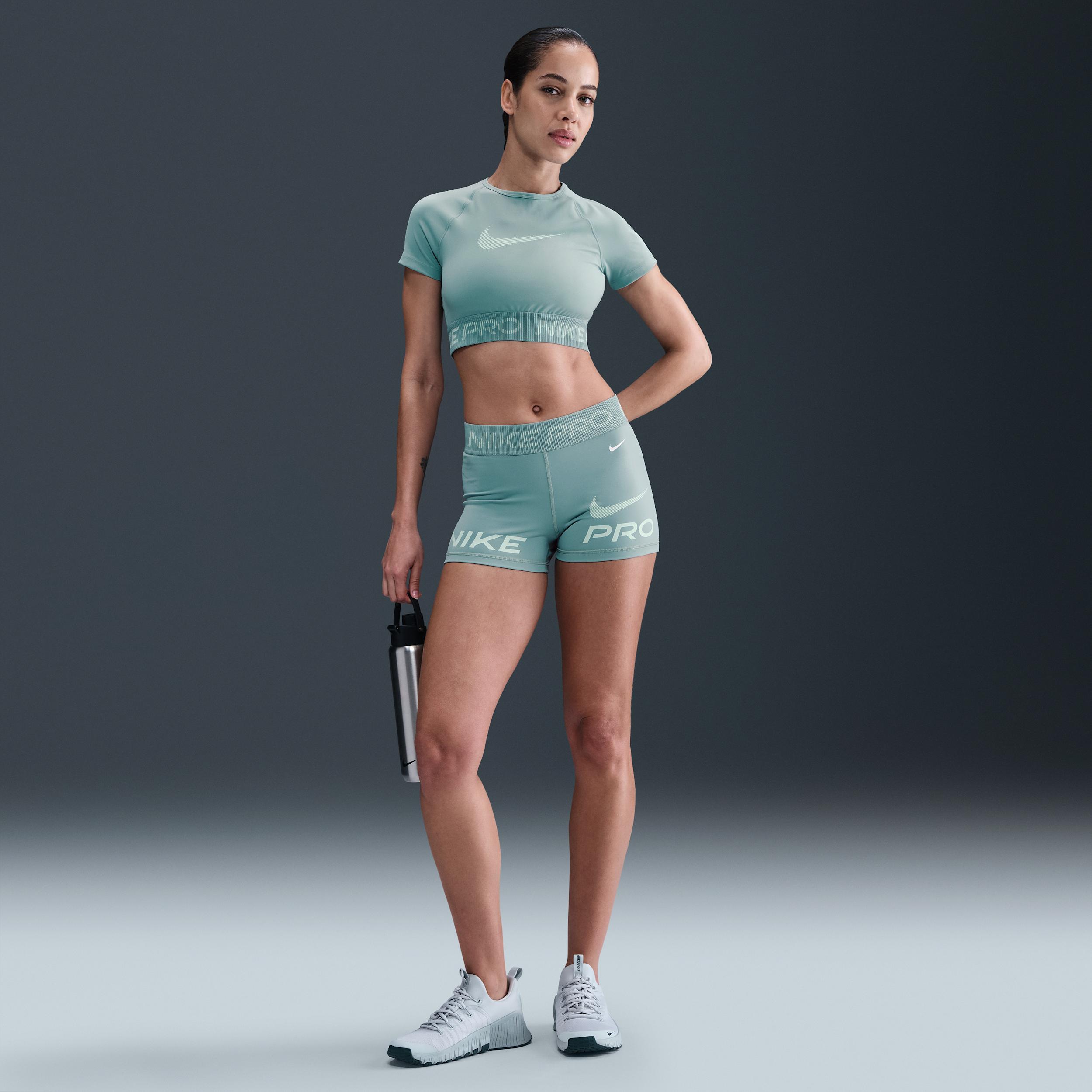Ready to sweat? Lightweight and stretchy, these biker shorts are made with smooth fabric that dries quickly to help you stay ready when your workout heats up. Like a Pro:Unapologetic, confident style goes with anything. From leggings to tops to more, Nike Pro rounds out your wardrobe with pieces that help you stand out. Work Hard, Stay Dry:Nike Dri-FIT technology moves sweat away from your skin for quicker evaporation, helping you stay dry and comfortable. Soft and Secure:A soft jacquard elastic waistband sits snugly against your skin without pinching or binding. [] Product Details:Printed graphics on legs. Printed Swoosh logo on left hip. 78-83% polyester/17-22% spandex. Material percentages may vary. Check label for actual content. Machine wash. Imported. Style: HV2464; Color: Cannon/Mint Foam/White; Size: 2XL; Gender: Female; Age Group: Adult | Nike Pro Women's Mid-Rise 3" Biker Shorts in Green, Size: 2XL | HV2464-017