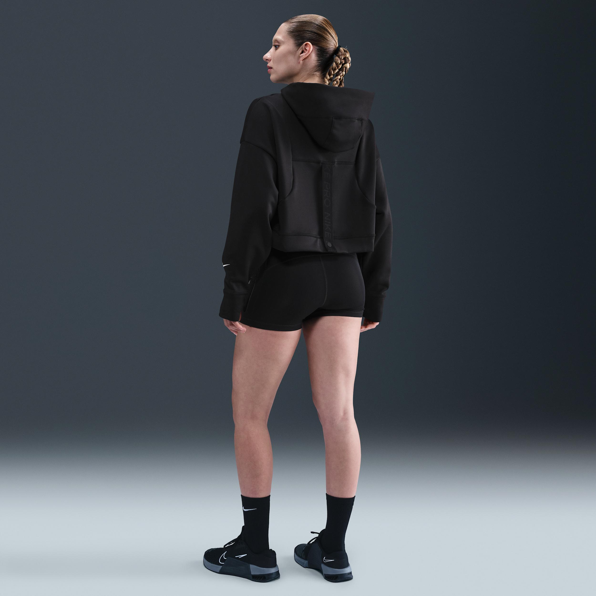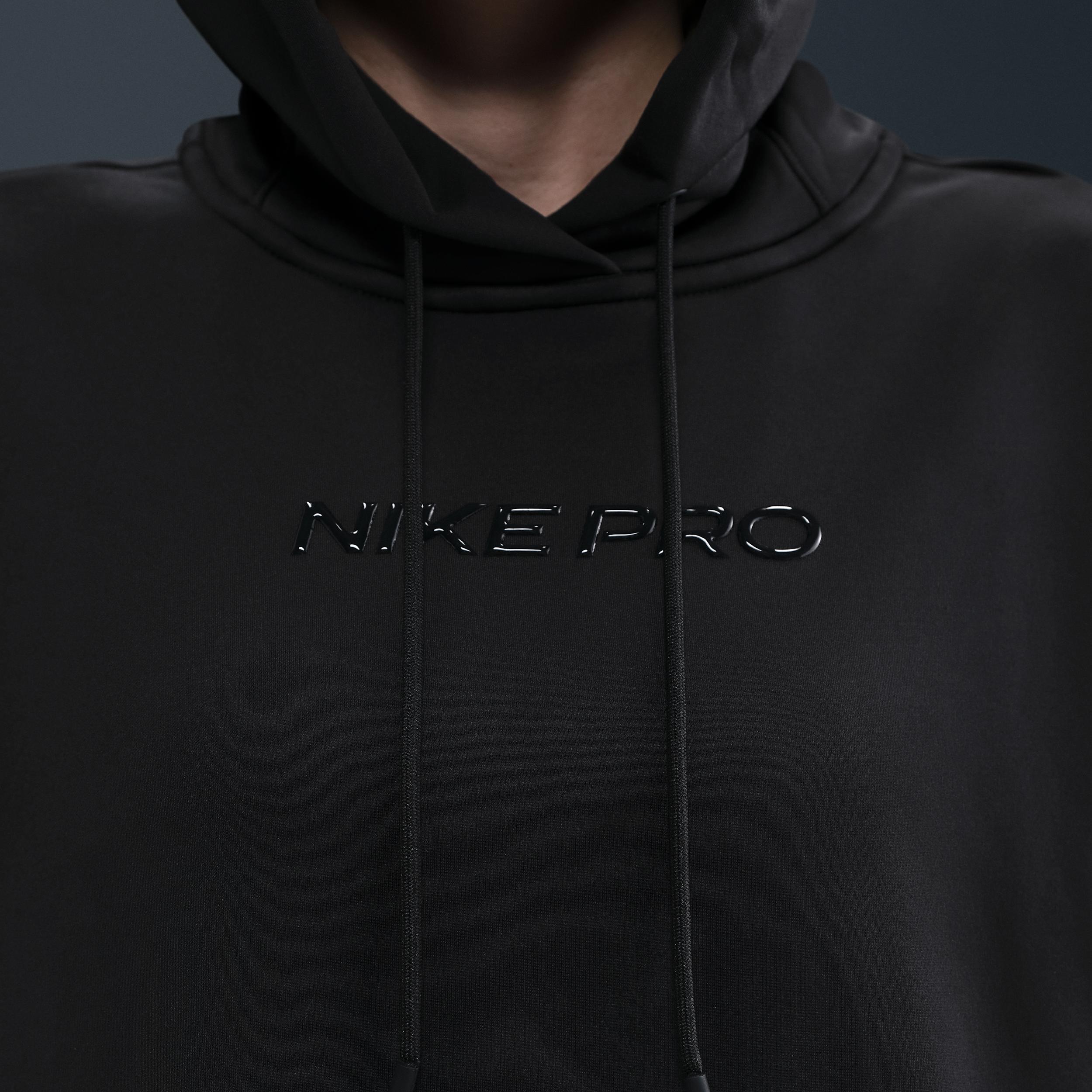 Warm up and work out in this spacious, heat-regulating hoodie. Soft and stretchy fabric feels cozy thanks to its supersmooth face on the outside and soft brushed face on the inside. Silicon drawcord tips provide a place to hold your earbuds. Like a Pro:Unapologetic, confident style goes with anything. From leggings to tops to more, Nike Pro rounds out your wardrobe with pieces that help you stand out. Stay Warm:Nike Therma-FIT technology helps manage your bodyâs natural heat to help keep you warm in cold-weather conditions. Next-Level Details:Inspired by pump covers, the Nike Pro elastic on the back hem pulls up for ventilation and style. Its specially designed drawcord with silicone holders at the ends can store certain earbuds. [] Product Details:Swoosh logo on sleeve. Nike Pro branding at chest. Thumbholes on sleeves. Body:91% polyester/9% spandex. Hood Lining:75% polyester/13% cotton/12% rayon. Machine wash. Imported. Style: HV3600; Color: Black/White; Size: S; Gender: Female; Age Group: Adult | Nike Pro Women's Therma-FIT Fleece Hoodie in Black, Size: Small | HV3600-010