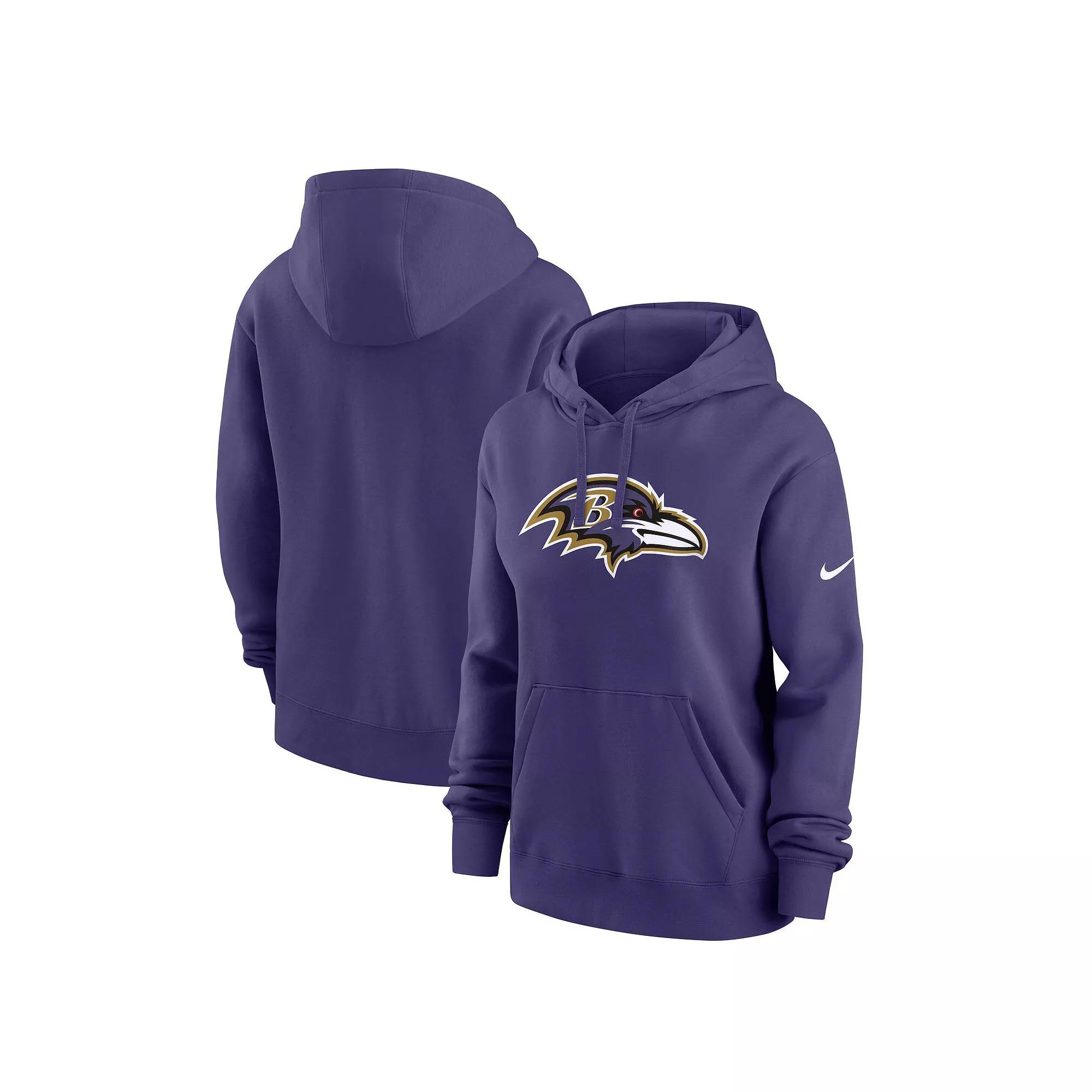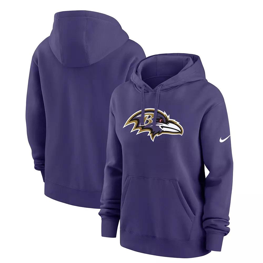 Stay cozy and showcase your Baltimore Ravens pride with this Club Fleece Pullover Hoodie from Nike. The brushed-back fleece fabric provides a soft and cozy feel, perfect for staying warm on chilly game days. The dropped shoulder seams offer ease of movement, making it the perfect choice for cheering on the Baltimore Ravens from the stands or lounging at home. Brand: Nike. Sizing Tip: Fans say this hoodie runs small. If you are in between sizes, consider sizing up. Standard Fit: Easy and traditional. Team logo screen printed at center front. Front pouch pocket. Machine wash, tumble dry low. Officially licensed. Material: 82% Cotton/18% Polyester - Body; 98% Cotton/2% Elastane - Rib; 100% Cotton - Hood Lining. Hooded. Brushed back fleece fabric has a midweight feel (280gsm). Long sleeve. Pullover. Suitable for moderate temperatures. Dropped shoulder seams provide ease of movement. Imported. Model is wearing size M and is 5'8. Color: Purple. Gender: female. Age Group: adult.