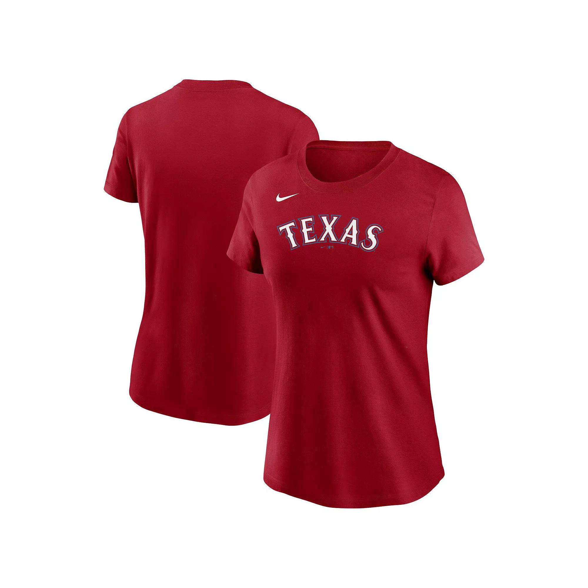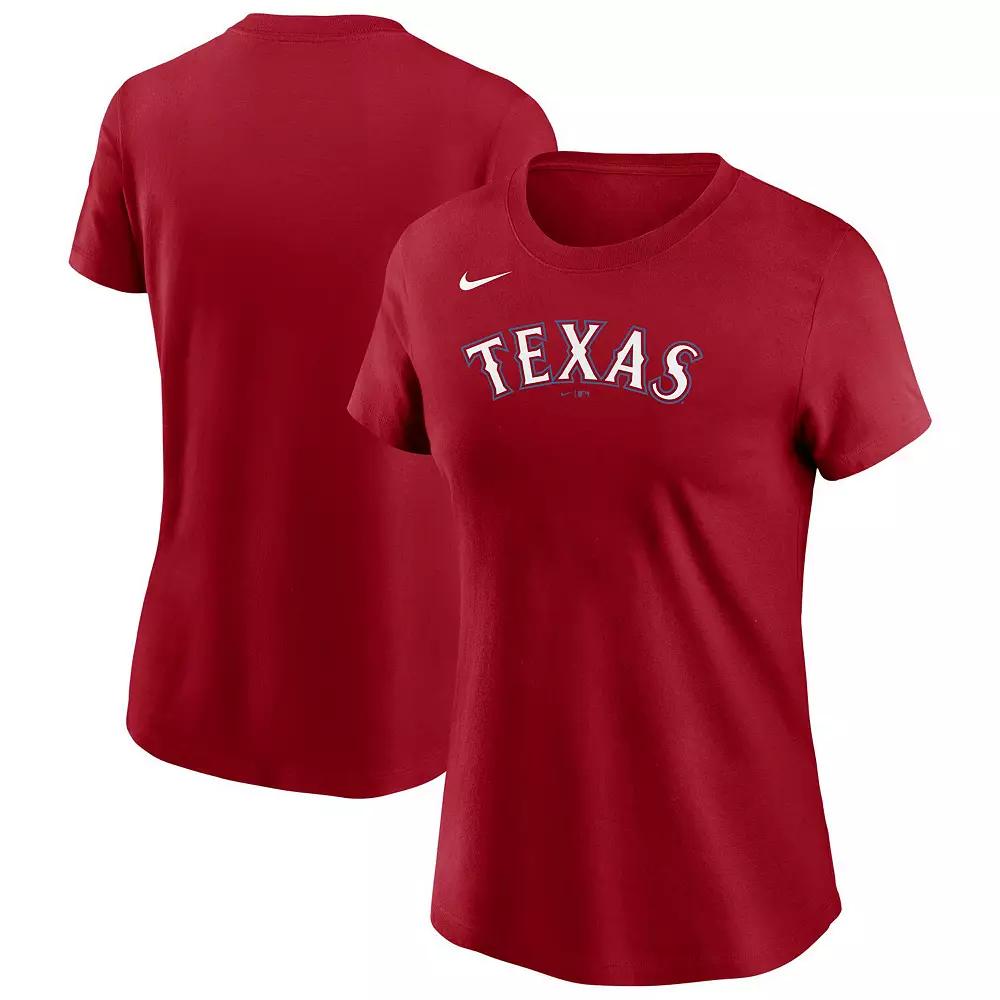 Add a pop of team spirit to your game day look with this Texas Rangers Wordmark T-Shirt from Nike. This classic crew neck tee is made from soft, breathable 100% cotton for all-day comfort. The screen printed Texas Rangers wordmark across the chest makes a bold statement about your favorite team.Add a pop of team spirit to your game day look with this Texas Rangers Wordmark T-Shirt from Nike. This classic crew neck tee is made from soft, breathable 100% cotton for all-day comfort. The screen printed Texas Rangers wordmark across the chest makes a bold statement about your favorite team.PRODUCT FEATURESShort sleeveScreen print team wordmark across chestCrew neckBrand: NikeOfficially licensedImportedMachine wash, tumble dry lowMaterial: 100% Cotton Color: Red. Gender: female. Age Group: adult.