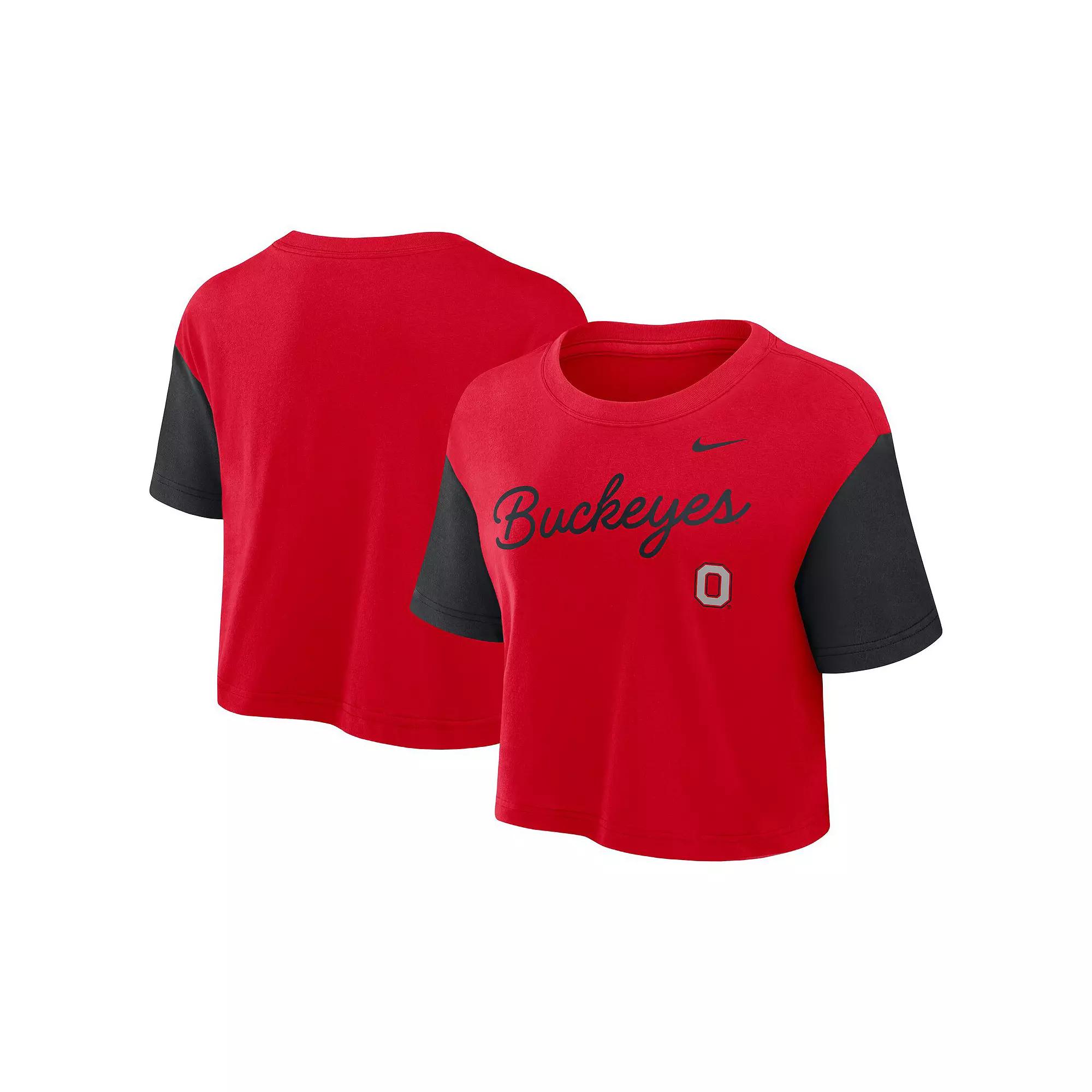 Put together a stylish Ohio State Buckeyes outfit with this Color-Block Script Dri-FIT Cropped T-Shirt by Nike. It features dropped shoulder seams for a relaxed, casual look that provides ease of movement. Sweat-wicking Dri-FIT technology keeps you cool and dry in this Ohio State Buckeyes top, whether you're at the game or on the go. Imported. Relaxed Fit: Loose and roomy across the chest, shoulders and body. Officially licensed. Brand: Nike. Jersey fabric has a lightweight feel (160gsm). Material: 60% Cotton/40% Polyester. Cropped length (Measures approx. 17.25). Dri-FIT technology wicks away moisture. Short sleeve. Machine wash, tumble dry low. Crew neck. Team name and logo printed on the front. Dropped shoulder seams allow for ease of movement. Size: XL. Color: Red. Gender: female. Age Group: adult.