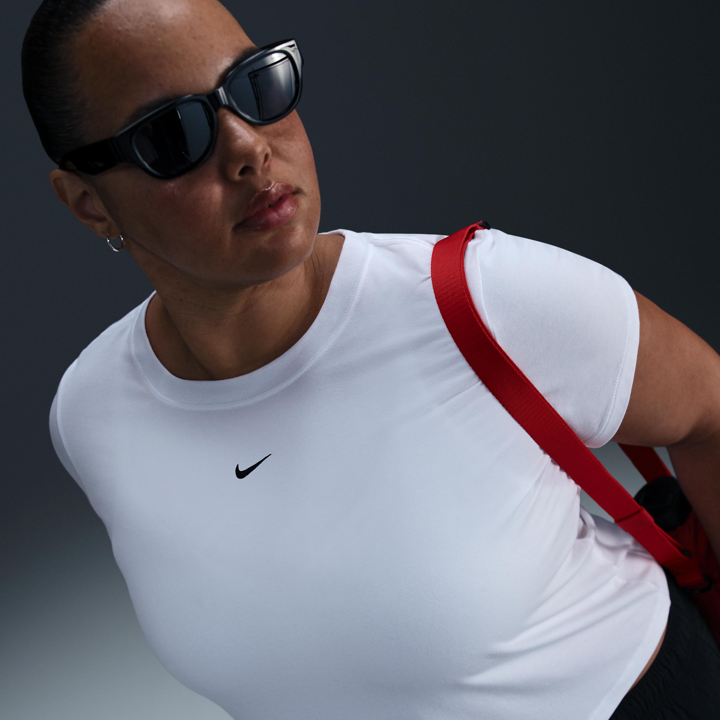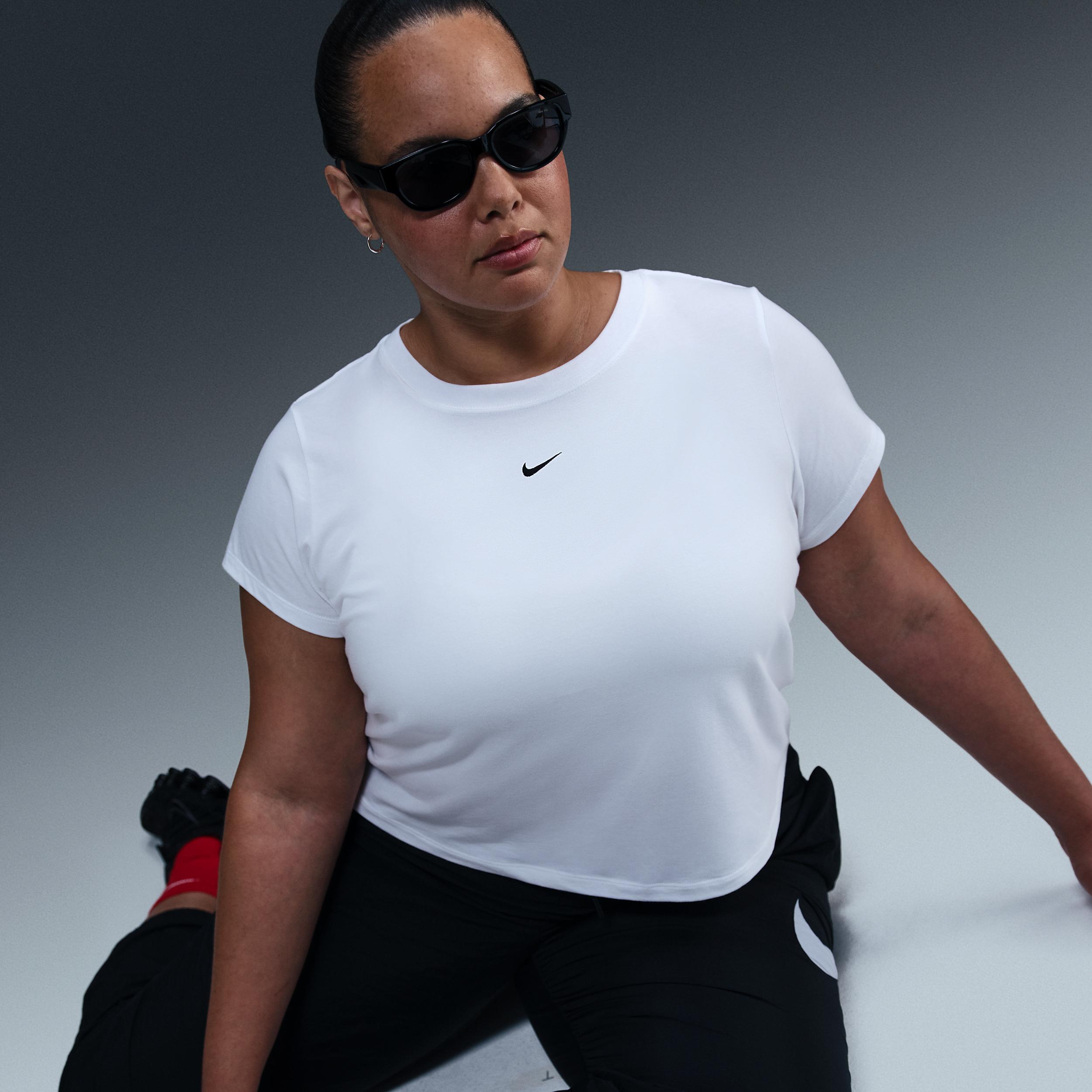 Perfect for any day, this slightly cropped, slim-fitting tee is classic and versatile. Our smooth jersey feels stretchy with a slight drape, giving it a comfortable, body-skimming feel. Product Details:48% modal/46% cotton/6% spandex. Machine wash. Imported. Style: FZ2479; Color: White/Black; Size: 3X; Gender: Female; Age Group: Adult | Nike Sportswear Chill Knit Women's Cropped T-Shirt (Plus Size) in White, Size: 3X | FZ2479-100