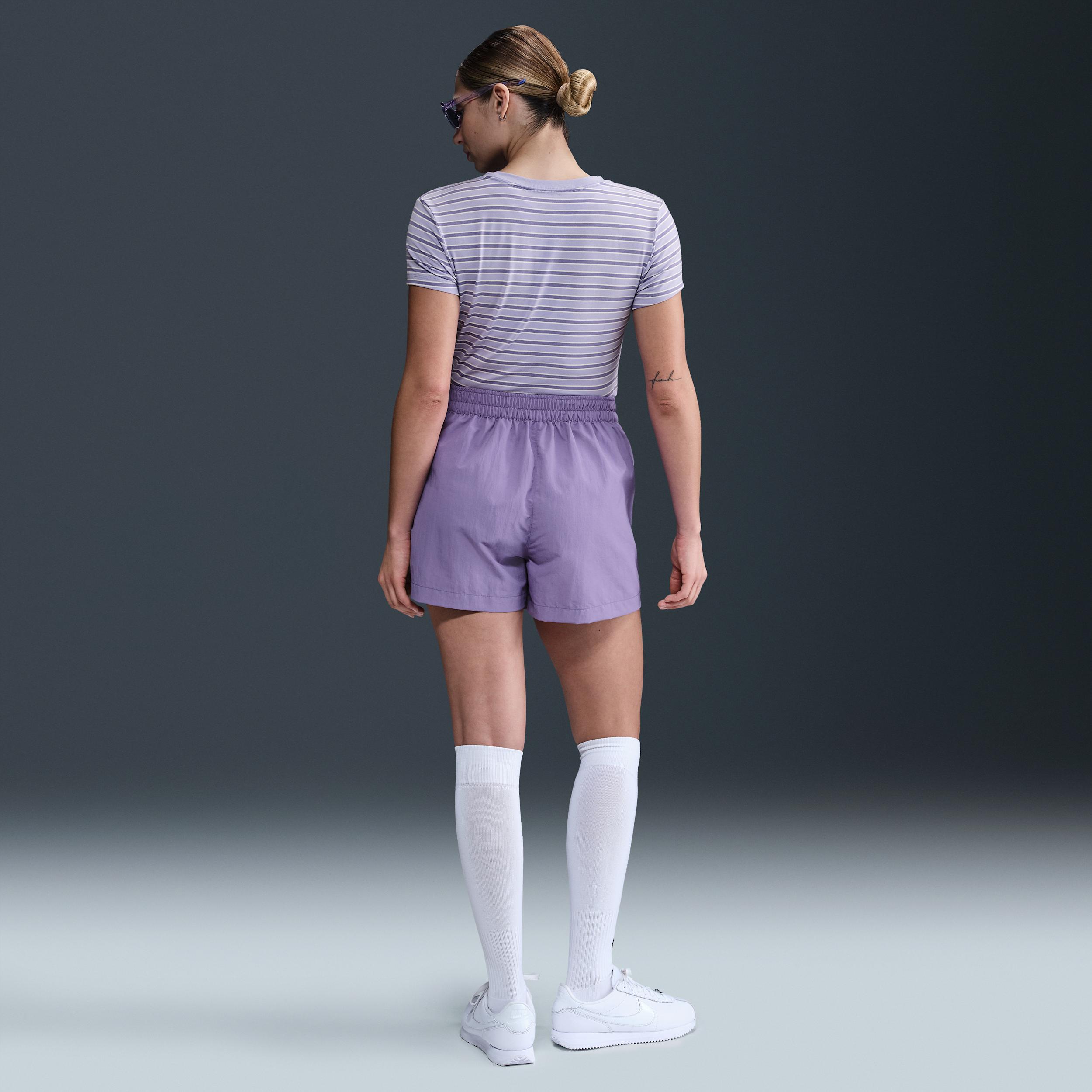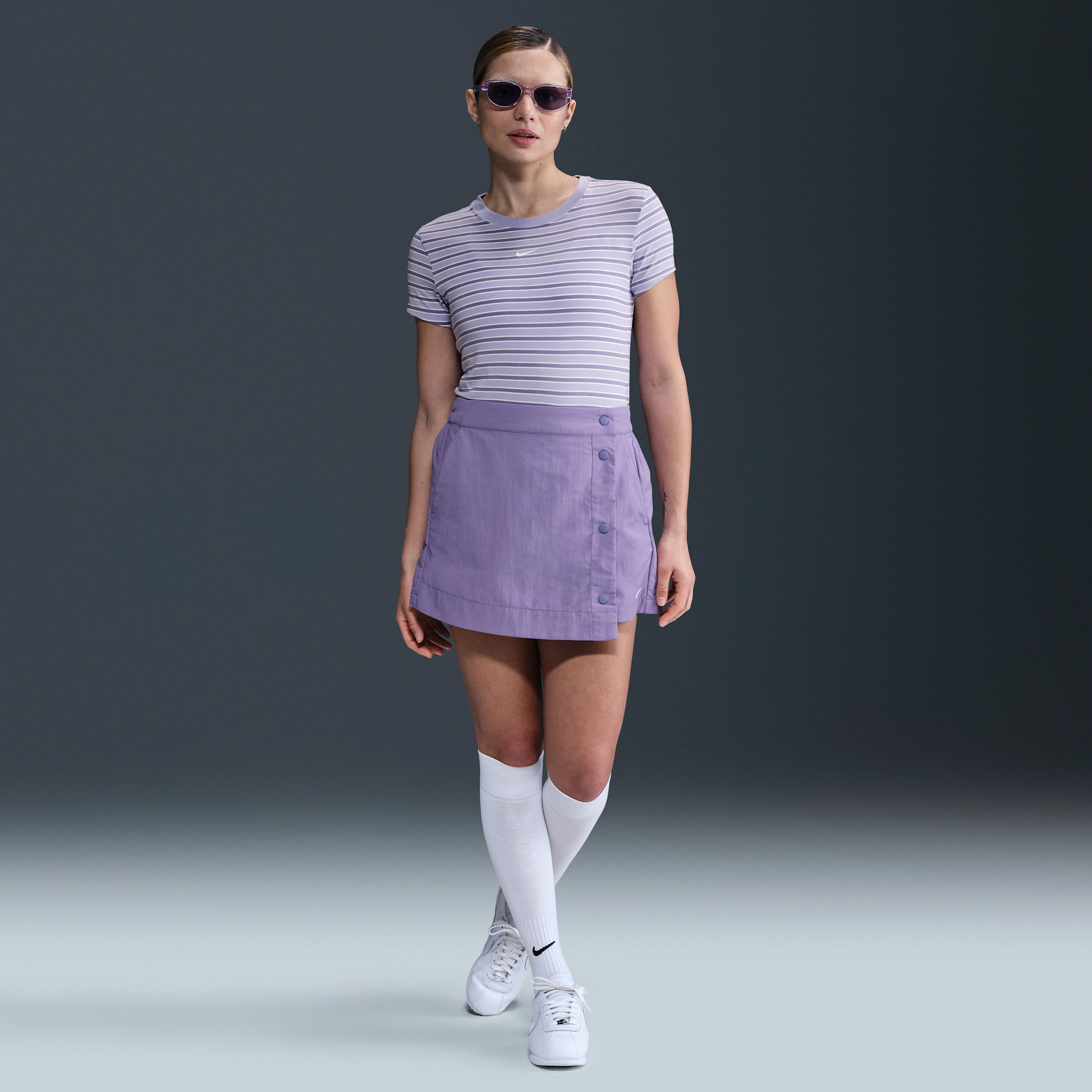 Slightly cropped and fitted, this striped tee is an elevated take on a classic. Smooth jersey feels stretchy and softperfect for everyday wear. Product Details:48% modal/47% cotton/5% spandex. Embroidered Swoosh logo at center chest. Machine wash. Imported. Style: HF9524; Color: Lilac Ice; Size: L; Gender: Female; Age Group: Adult | Nike Sportswear Chill Knit Womens Slim Striped T-Shirt in Purple, Size: Large | HF9524-533