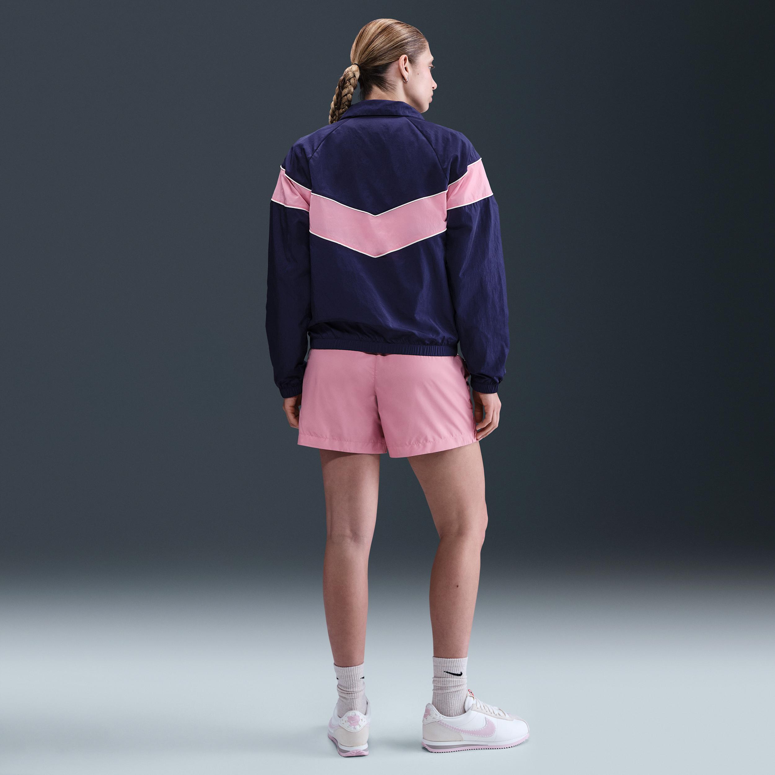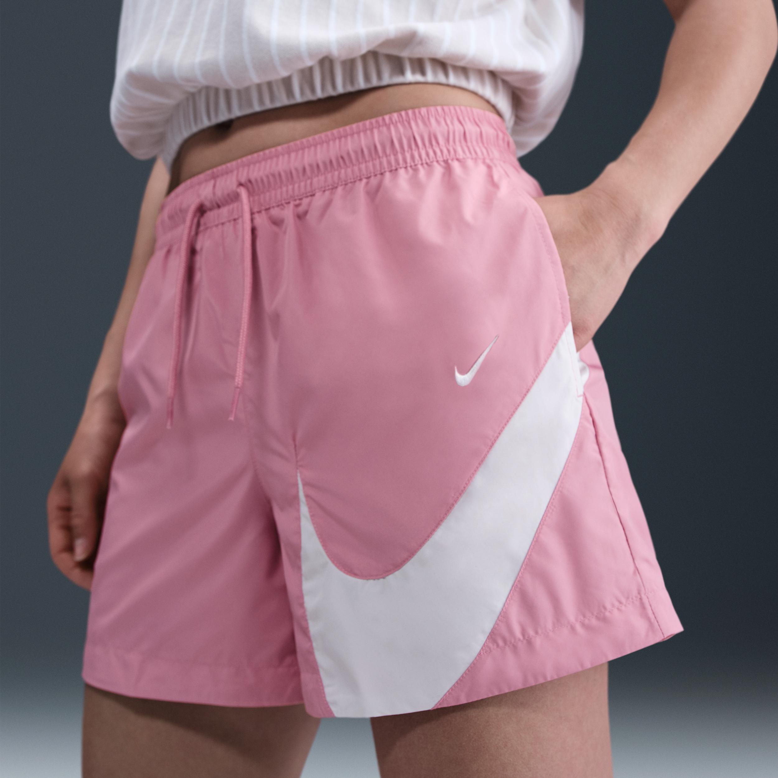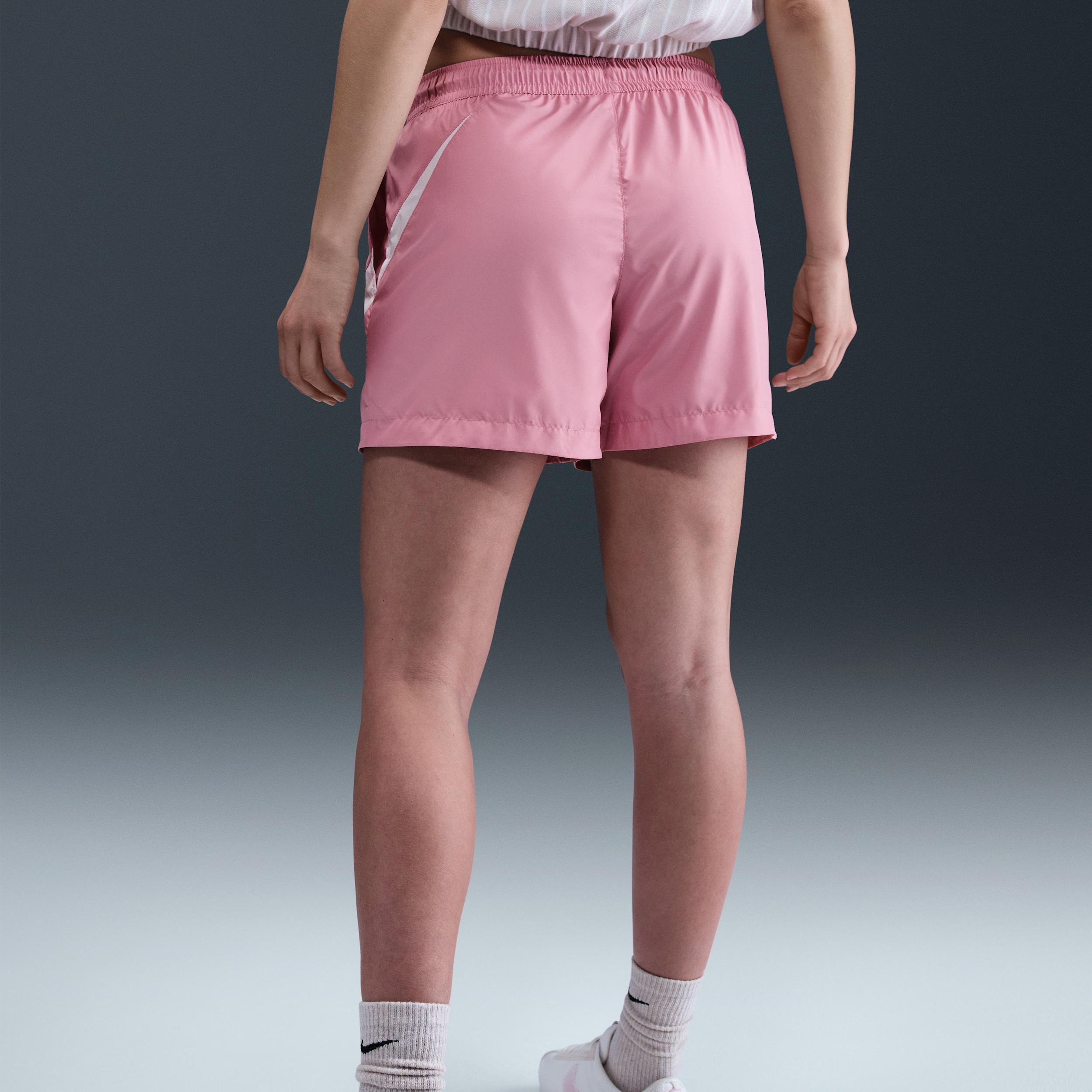 Made with lightweight taffeta, these shorts have built-in UV protection that helps shield you from the sun. A mesh lining adds a layer of breathable comfort. Product Details:100% polyester. This product provides UVA and UVB protection from the sun only in the areas covered by the garment. To protect exposed areas, the use of good quality sunscreen is recommended. Elastic waistband with drawcord. Embroidered Swoosh logo on left hip. Cut-and-sew Swoosh logo on left leg. Mesh-lined pockets. Machine wash. Imported. Style: HM8979; Color: Elemental Pink/White; Size: M; Gender: Female; Age Group: Adult | Nike Sportswear Classic Women's Mid-Rise 5" Woven Logo Shorts in Pink, Size: Medium | HM8979-699