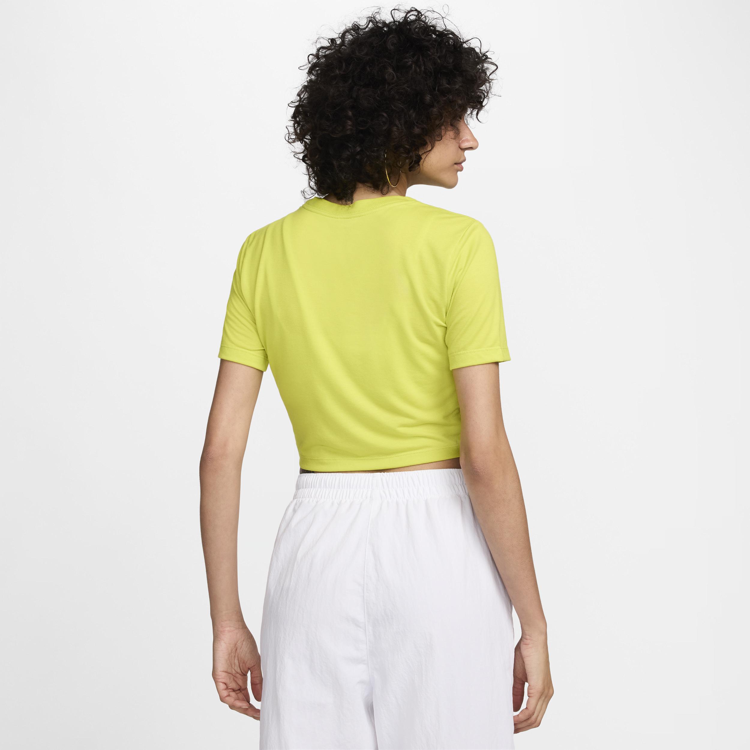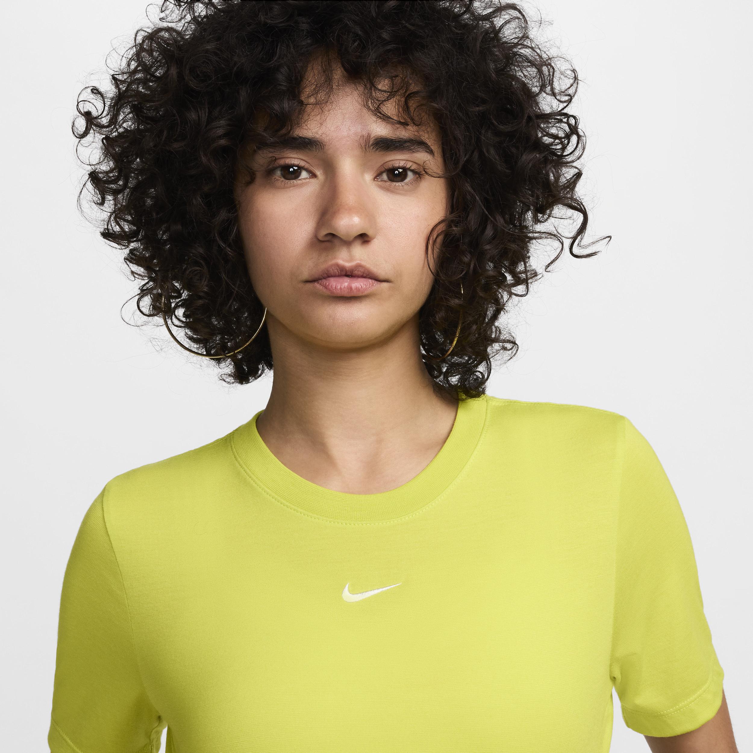 Made with our soft jersey fabric, this everyday tee gives you a premium look and feel. Its slim fit and cropped length make it comfortable enough to wear around the house yet elevated enough to wear out in the city. [] Product Details:Embroidered Swoosh logo. 49% polyester/48% modal/3% spandex. Machine wash. Imported. Style: FB2873; Color: Bright Cactus/White; Size: XL; Gender: Female; Age Group: Adult | Nike Sportswear Essential Women's Slim Cropped T-Shirt in Green, Size: XL | FB2873-357