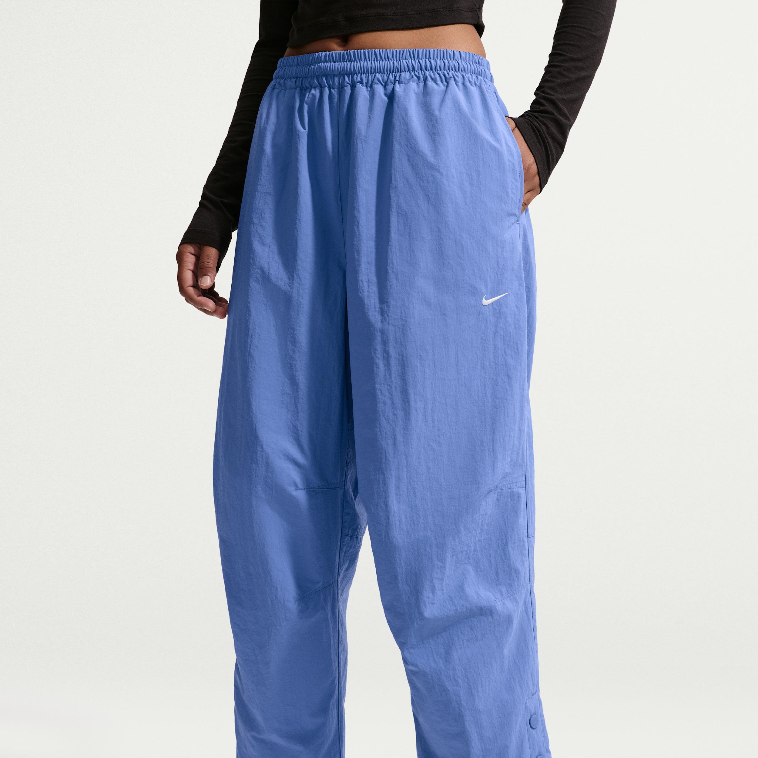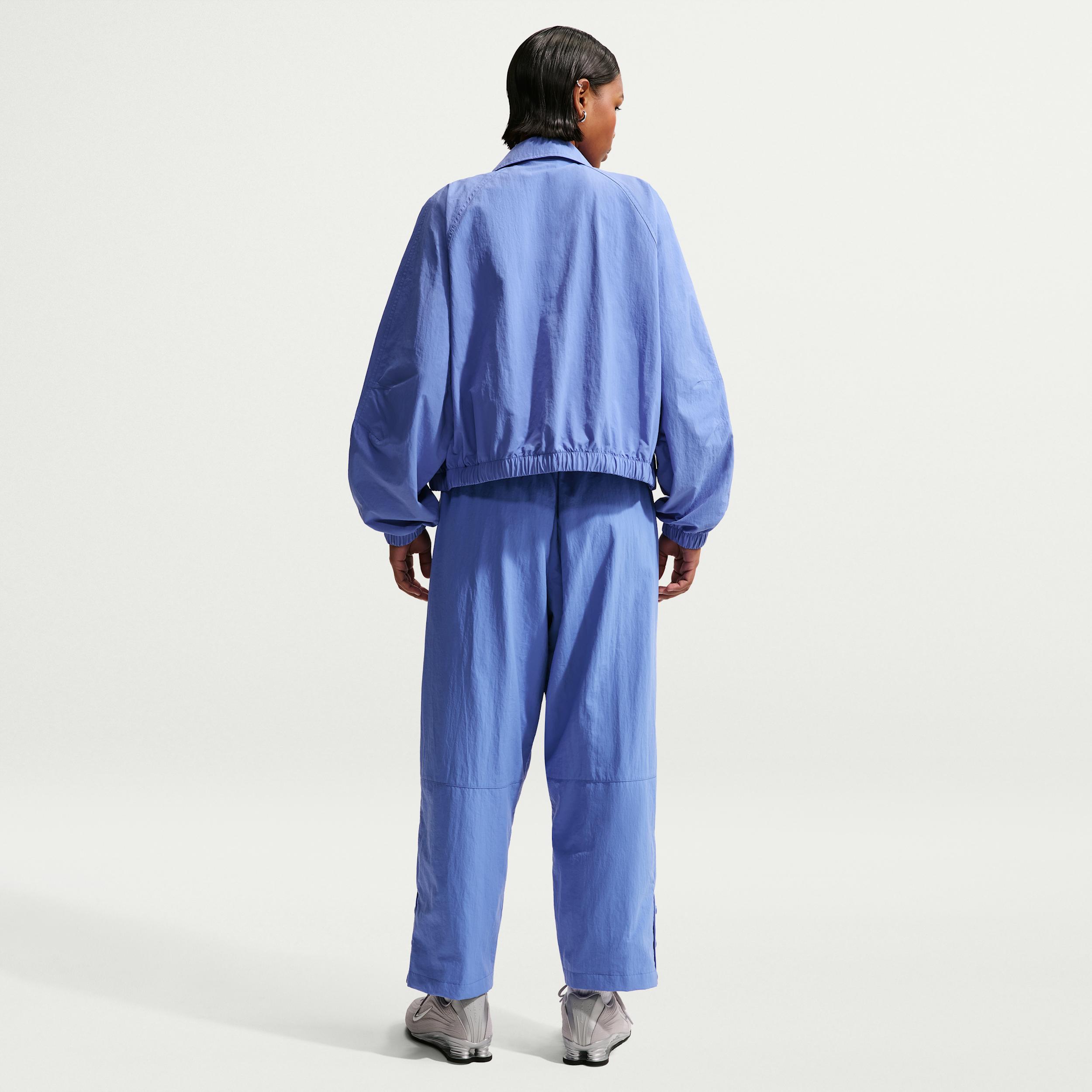 Classic sport style gets a modern twist. These taffeta pants have a voluminous fit and slightly cropped length designed to hit at your ankles. Snaps at the cuffs and articulation at the knees add a polished finish. [] Product Details:Embroidered logo. Hand pockets. Elastic waistband with drawcord. Body:100% nylon. Lining:100% polyester. Machine wash. Imported. Style: IF0220; Color: Light Medium Blue/Sail; Size: XS; Gender: Female; Age Group: Adult | Nike Sportswear Women's Oversized High-Waisted Woven Pants in Blue, Size: XS | IF0220-460
