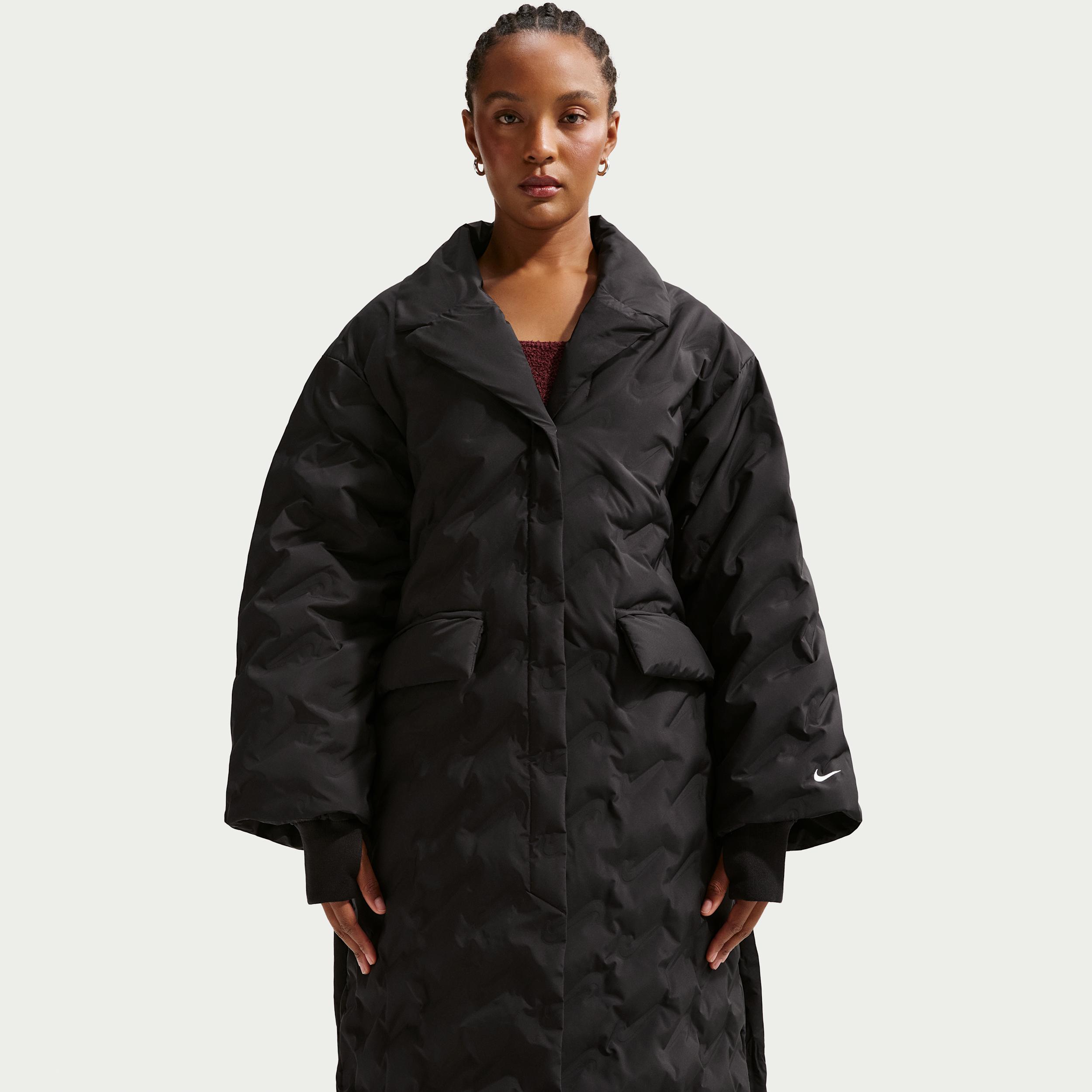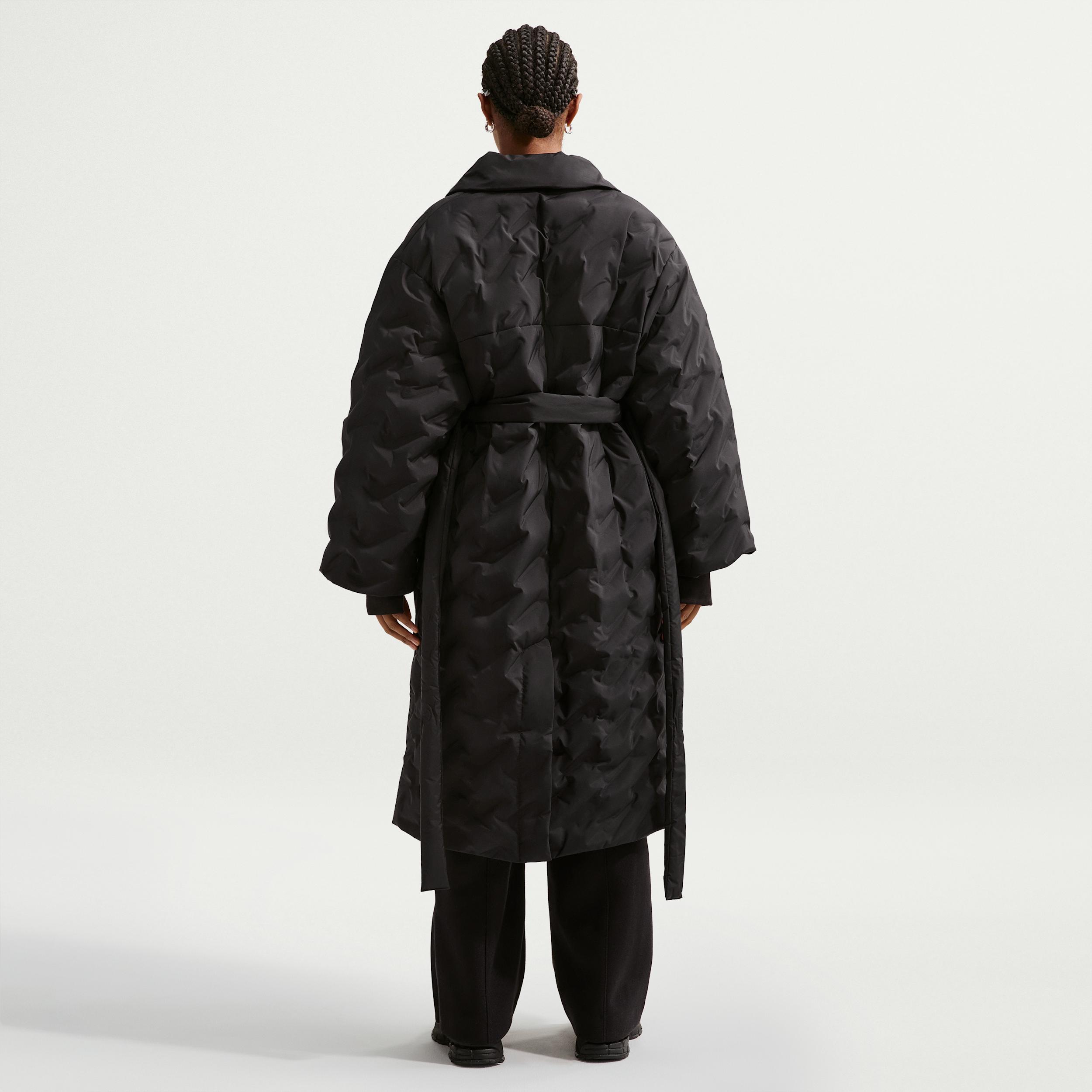 The classic trench gets a lightweight warm-up as part of the Swoosh Series Collection. Engineered with down insulation and a water-repellent finish, this transitional staple helps keep you comfortable in cool temperatures. Insulation Level:Warm:Lightweight insulation uses Nike Therma-FIT technology, which manages your bodyâs natural heat to help keep you warm in cold weather. Rain Ready:A water-repellent finish helps you stay dry in light rain. The collar pops up for extra coverage, and the internal cuffs help keep out water. About Swoosh Series:This trench coat is part of our Swoosh outerwear series that lets you choose your warmth level by the size of the Swoosh design. A smaller Swoosh pattern means lighter-weight warmth, whereas larger Swoosh-shaped baffles mean more insulation. [] Product Details:Body/Lining:100% polyester. Fill:75% grey duck down/25% feathers. Oversized fit. Belt tie. Back vent. Machine wash. Imported. Style: IB2010; Color: Black/Sail; Size: 2XL; Gender: Female; Age Group: Adult | Nike Sportswear Swoosh Series Women's Therma-FIT Oversized Down Trench Coat in Black, Size: 2XL | IB2010-010