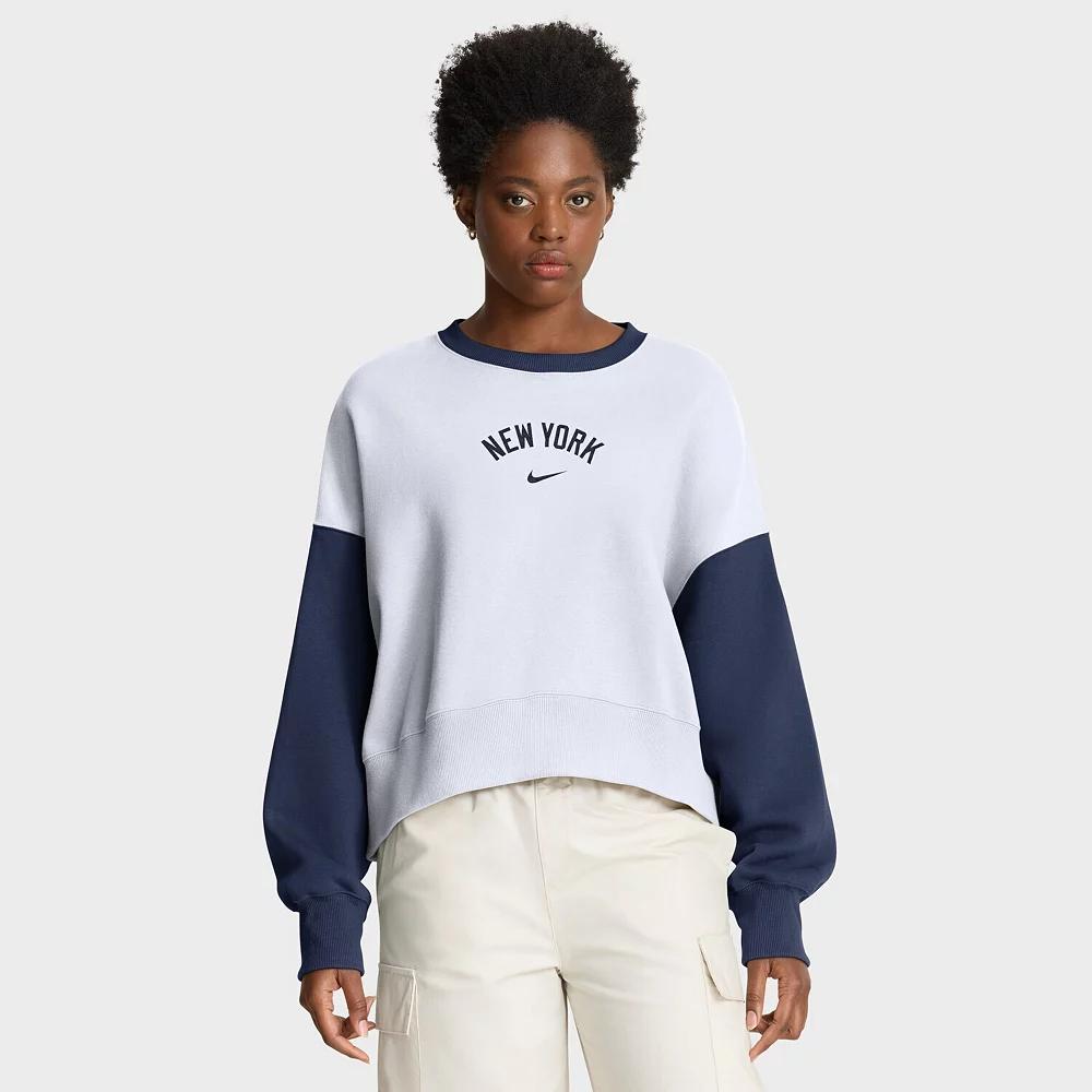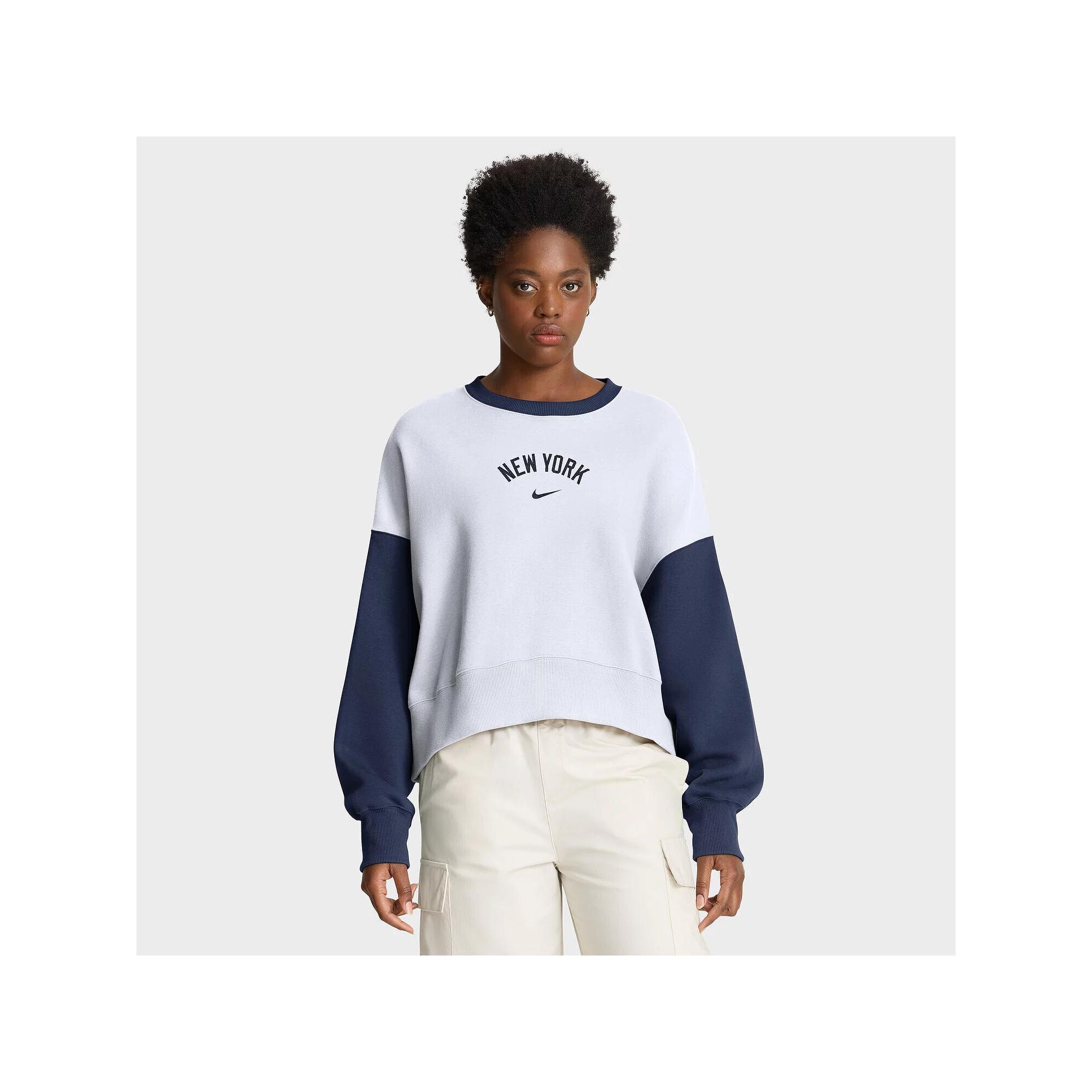 Stay comfy in fashionable New York Yankees outerwear with this Oversized High Hip Fleece Sweatshirt by Nike. Cozy fleece fabric and brushed French terry lining provide luxuriously soft, breathable warmth, while dropped shoulders, wide armholes and longer rib-knit hem create a trendy look. Contrasting sleeves accentuate the team wordmark printed on the front, making your New York Yankees fandom the focal point. Model is wearing size M and is 5'9. Long sleeve. Extended arm length tapers at the cuffs for a scrunched, baggy look. Brushed French terry lining adds softness and cozy warmth. Front body length ranges from 20.4-24.4. High hip hem. Dolman sleeves have a wide armhole opening. Machine wash, tumble dry low. Oversized Fit: Exaggerated and spacious over your body. Elongated rib-knit hem. Pullover. Crew neck. Imported. Brand: Nike. Dropped shoulder seams provide ease of movement. Officially licensed. Team wordmark screen printed at center front. Material: 82% Cotton/18% Polyester - Body; 97% Cotton/3% Elastane - Rib. Fleece fabric has a midweight feel (280gsm). Size: XS. Color: White. Gender: female. Age Group: adult.