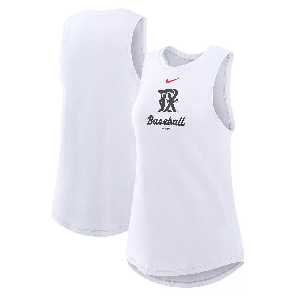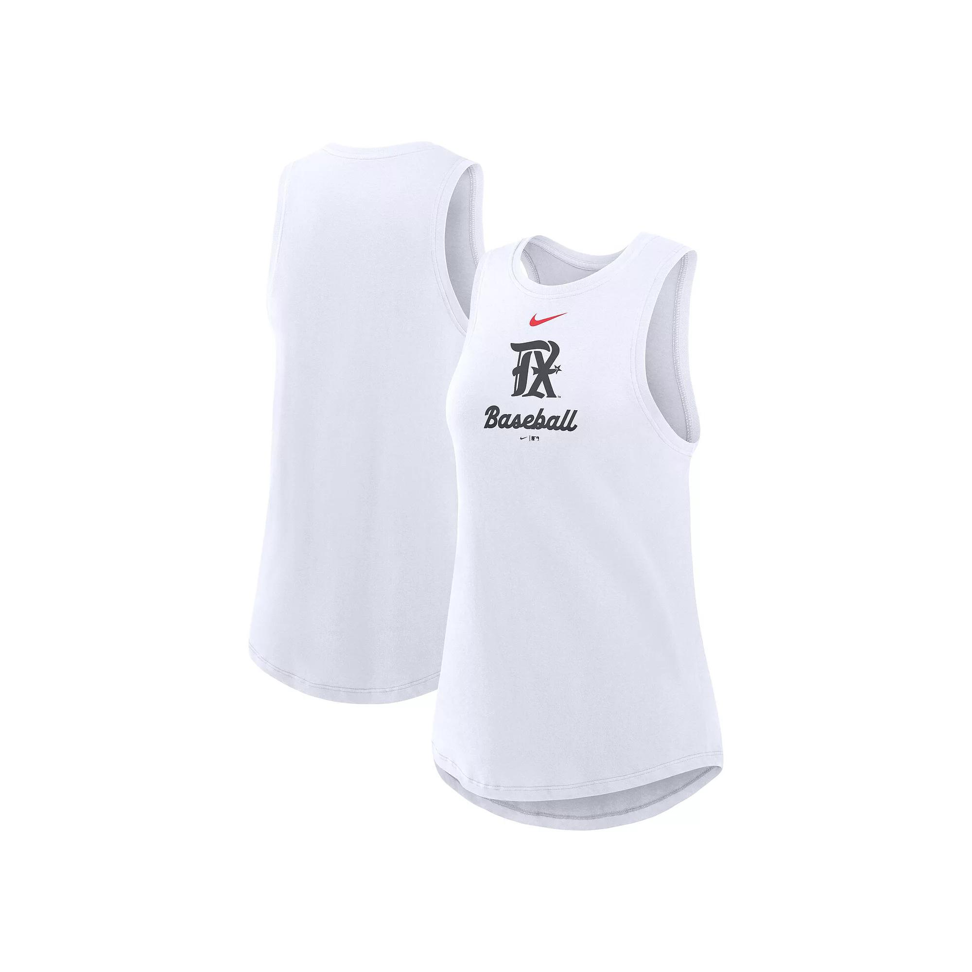 Stay cool and dry in locally inspired Texas Rangers apparel with this City Connect Tricode High Neck Dri-FIT Tank Top by Nike. It's made from lightweight jersey fabric enhanced with sweat-wicking technology for a continuously comfortable feel. The high neckline and rounded hem provide a flattering fit, making this Texas Rangers top perfect for warm days. Brand: Nike. Imported. Machine wash, tumble dry low. Jersey fabric has a lightweight feel (160gsm). Rounded droptail hem. Rib-knit trim at collar and arm holes. Dri-FIT technology wicks away moisture. Sleeveless. Material: 57% Cotton/43% Polyester. Crew neck. Screen print graphics. Standard Fit: Easy and traditional. Officially licensed. Color: White. Gender: female. Age Group: adult.