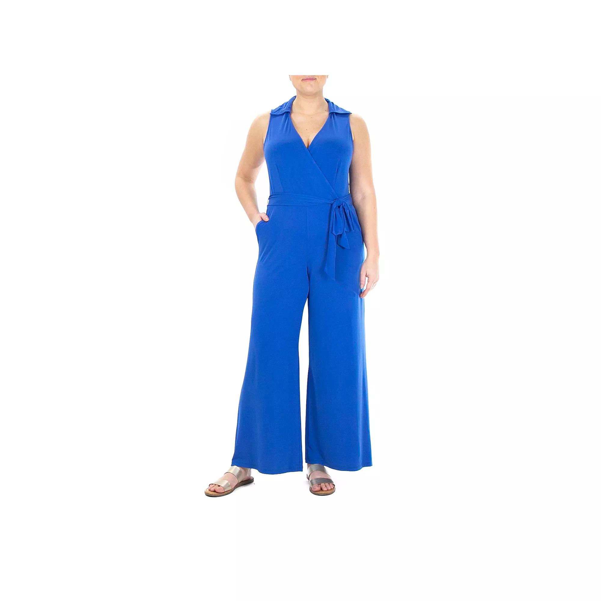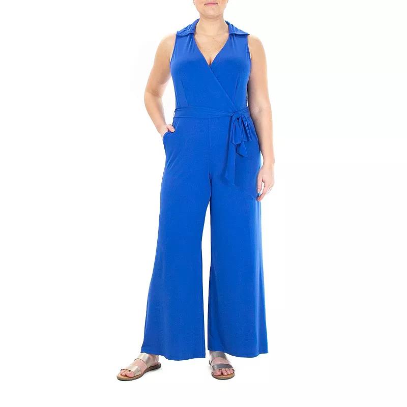 A chic jumpsuit features a self-tie waist for on-trend style thats perfect for any event. 53 length, 30 inseam (size S) Surplice neck with collar Sleeveless Slips on Side slash pockets Removable self-tie at waist Solid color Wide leg 95% polyester, 5% spandex Hand wash, line dry