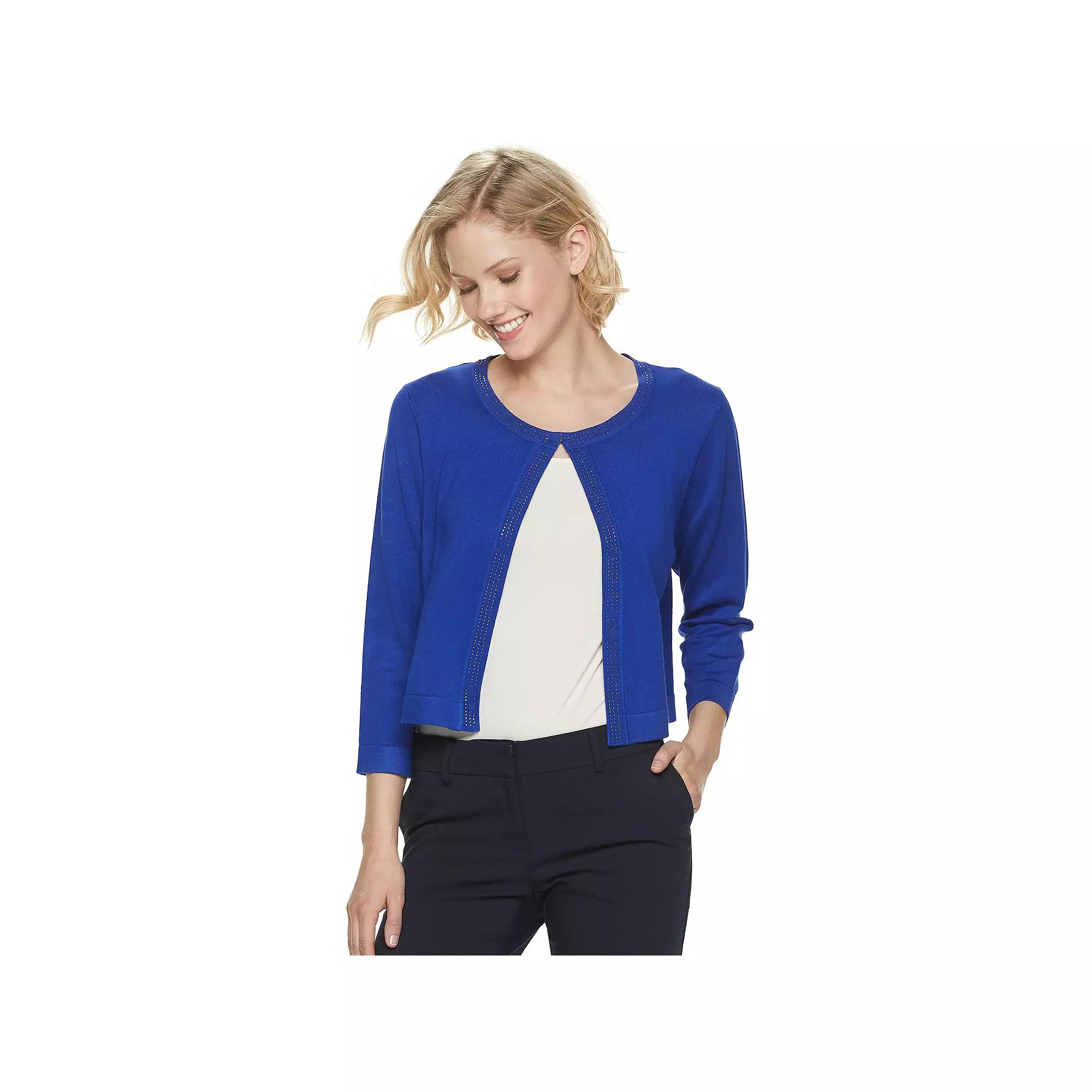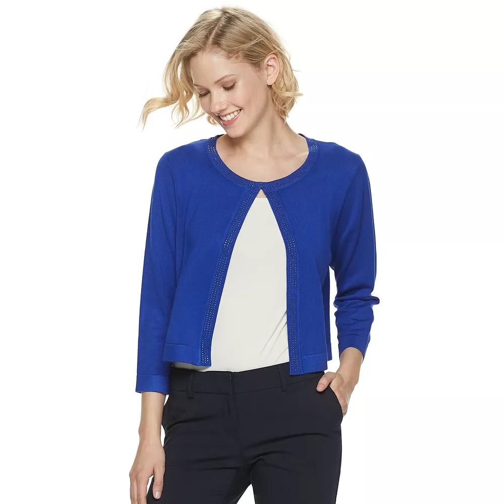 Add a sparkling layer to your style with this womens Nina Leonard embellished-trim cardigan sweater.Watch the product video here. Embellished trim Hook-and-eye closure Long sleeves 3/4-length sleeves FIT & SIZING Cropped length FABRIC & CARE Rayon, nylon Machine wash Imported Size: Small. Color: Blue. Gender: female. Age Group: adult. Pattern: Solid.