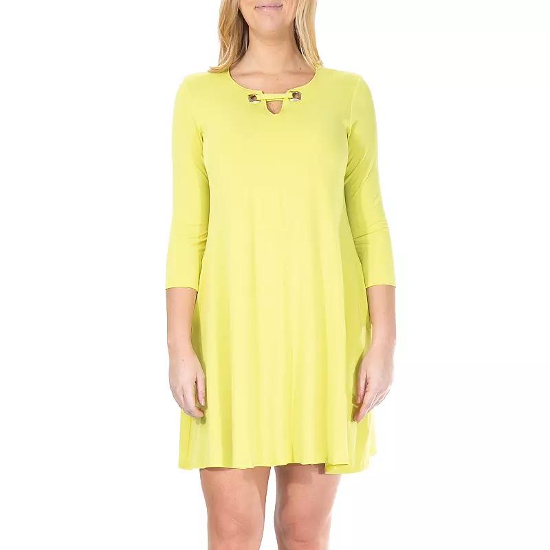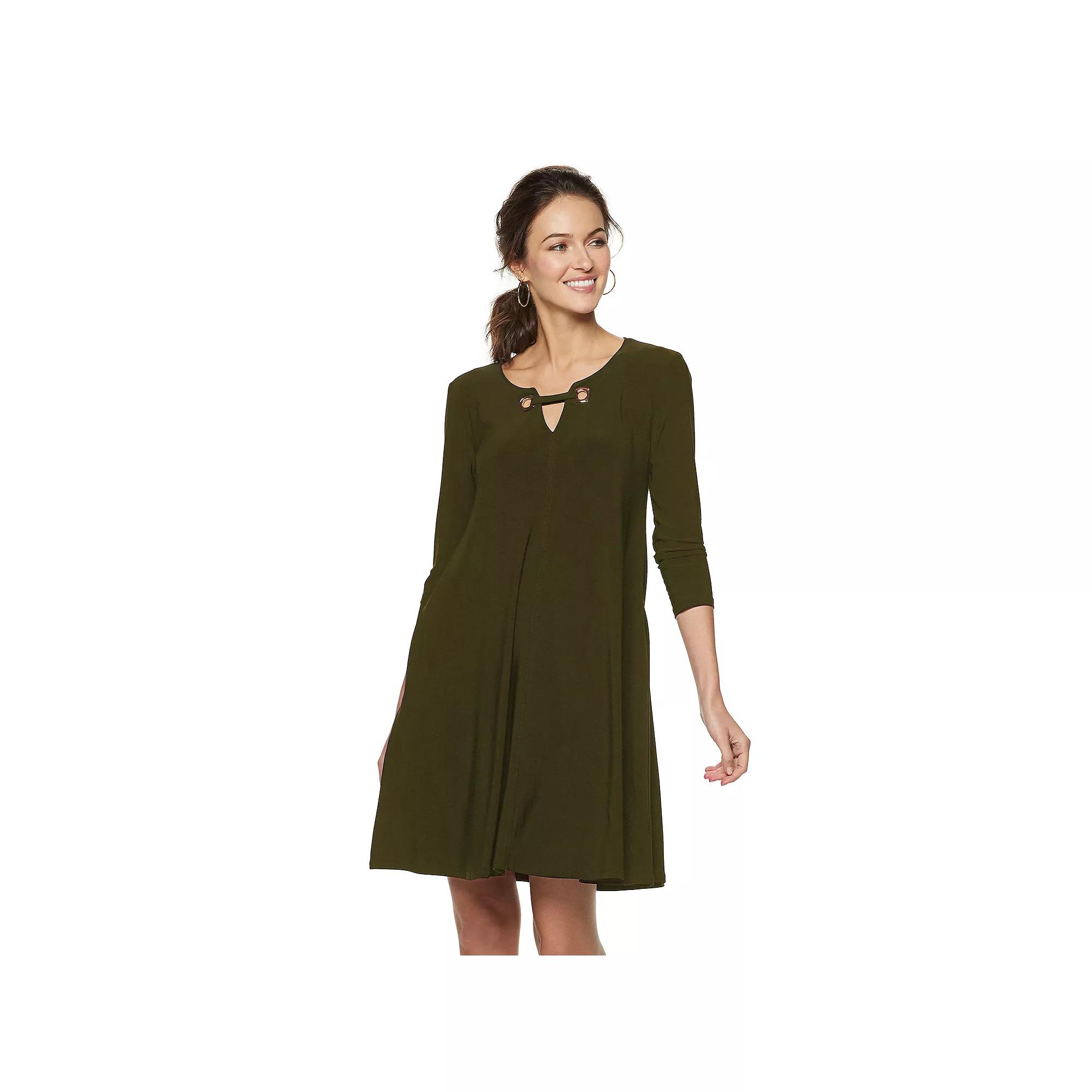An embellished keyhole detail gives this women's Nina Leonard swing dress a unique look. Watch the product video here. Embellished details High-low hem Keyhole neckline Long sleeves FIT AND SIZE 35 1/2-in. approximate length from shoulder to hem Swing cut Pull-on design FABRIC & CARE Polyester, spandex Machine wash Imported Size: Medium. Color: Green. Gender: female. Age Group: adult. Pattern: Solid.