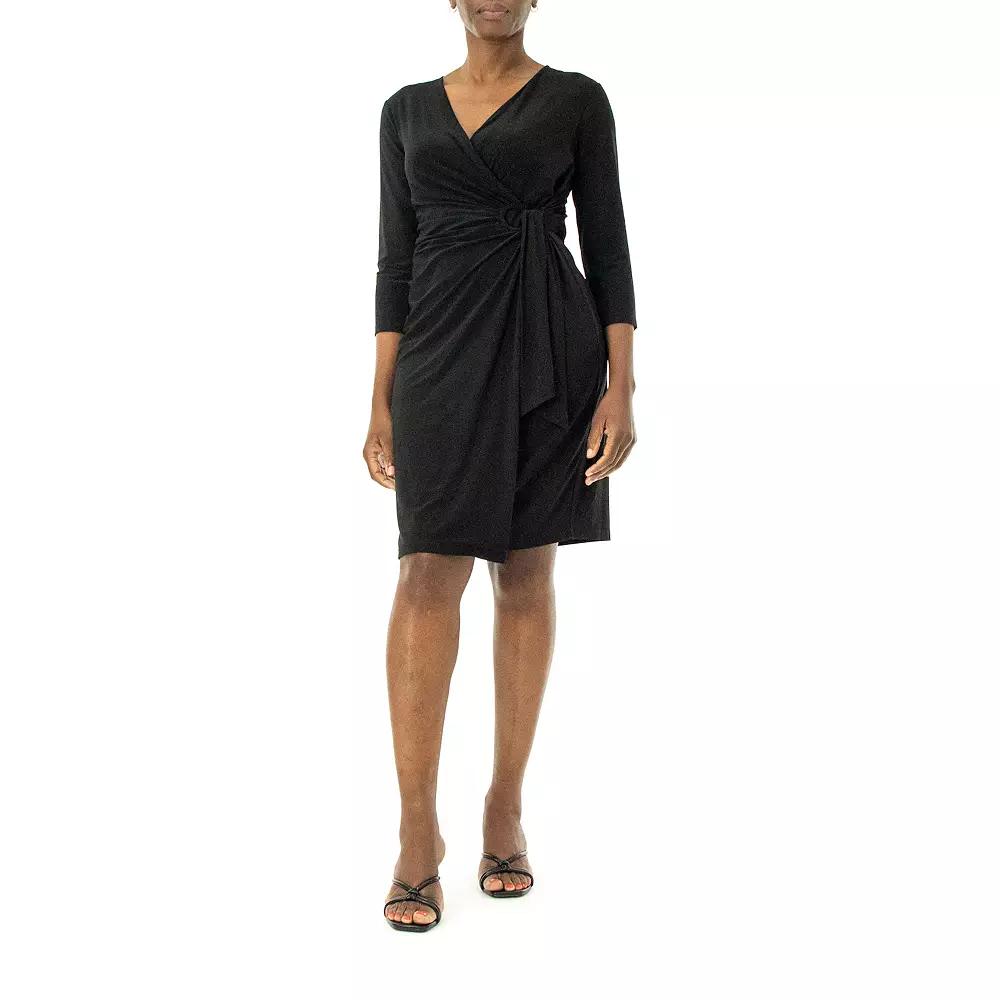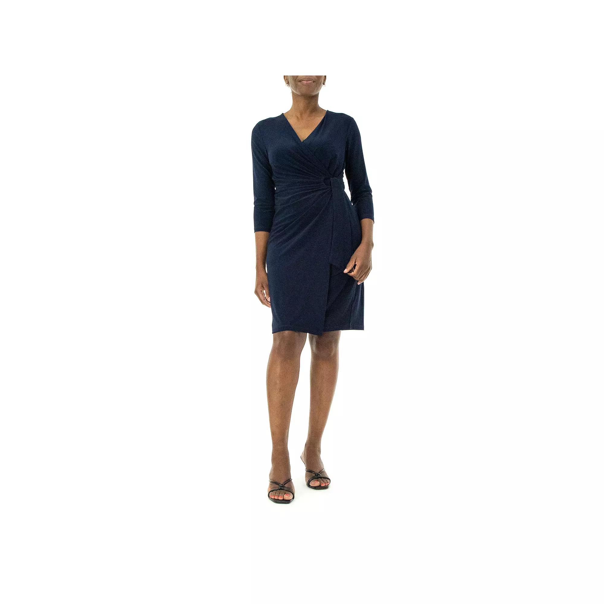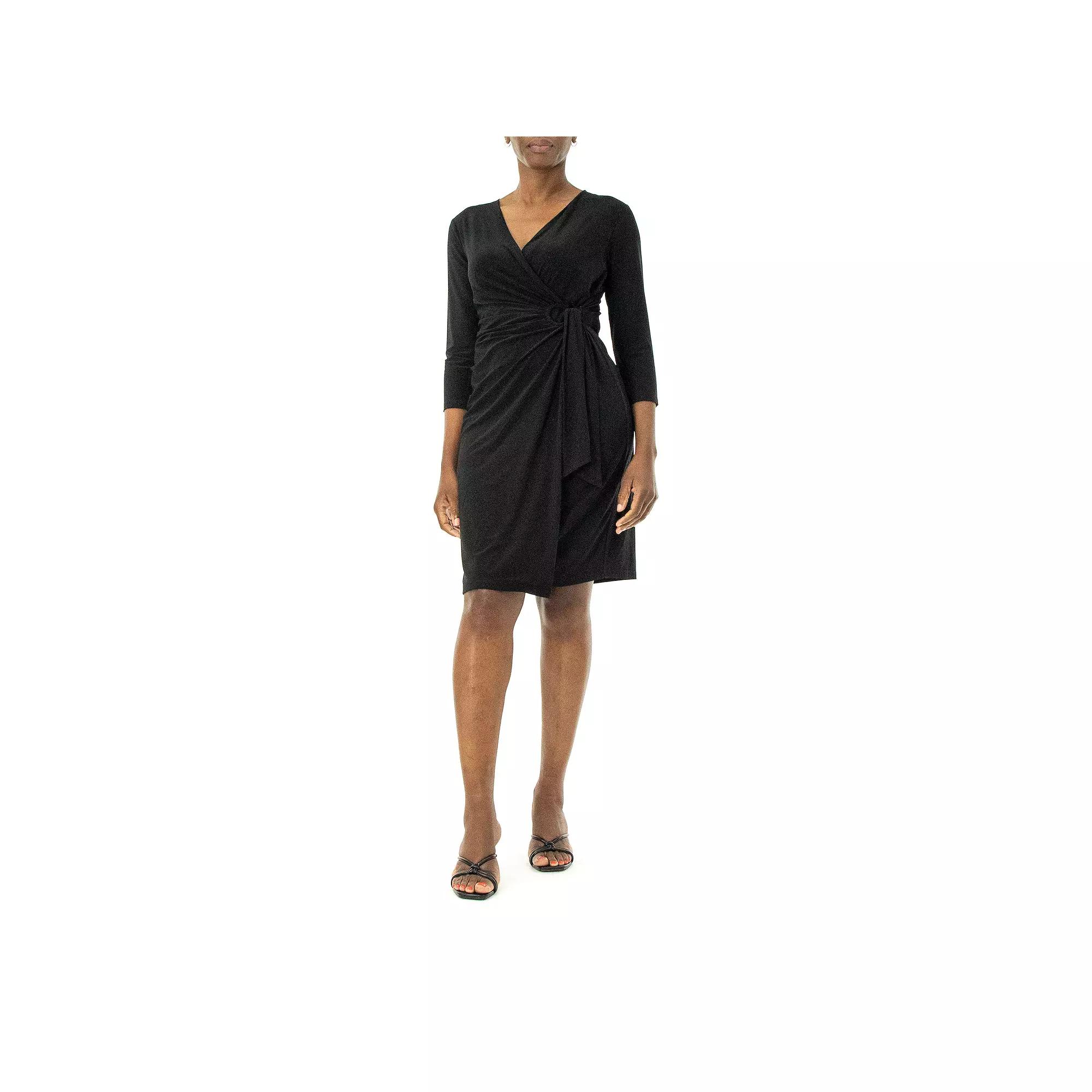 A classic faux wrap dress with a surplice neckline and modest three-quarter sleeves offers a casual cool style. 38.5 length (size S) Surplice V-neck Three-quarter sleeves 95% polyester, 5% spandex Machine wash, tumble dry Imported Model stats: 510 height, 32 bust, 25 waist, 36 hip. Model is wearing size S.