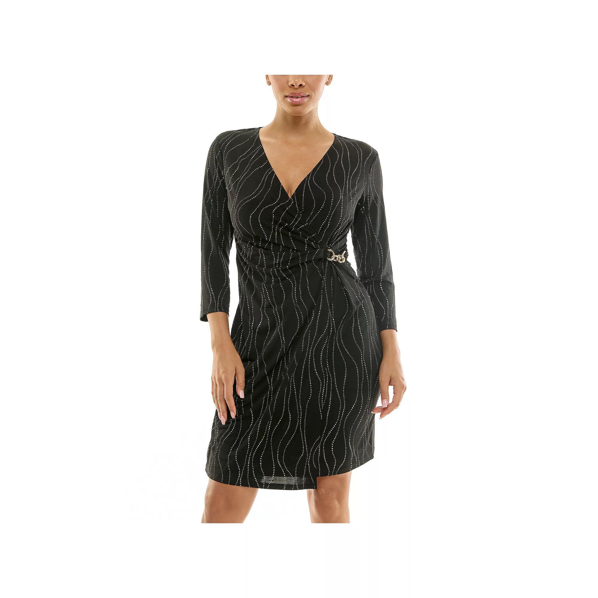 Embrace elegance and sophistication with this stunning wrap dress from Nina Leonard, featuring a chic chain detail at the waist that perfectly enhances its figure-flattering silhouette. With 3/4 sleeves and a graceful V-neckline, this dress effortlessly transitions from daytime gatherings to evening events, making it a versatile staple for any wardrobe. Click on this WOMEN'S GUIDE to find the perfect fit and more! - https://www.kohls.com/feature/womens-fit-guide.jsp. FEATURES: 3/4 sleeve design for added elegance, V-neck wrap style with chain detail at waist. FIT & SIZE: True to size, Faux-wrap silhouette, 38 1/2-in. from shoulder to hem, Mini length hits at the thigh. DETAILS: V-neck neckline, 3/4-length sleeves, No closure - pullover styling, Imported. MATERIAL & CARE: Polyester, spandex, Soft construction, Machine wash. Size: Small. Color: Black Gold. Gender: female. Age Group: adult.